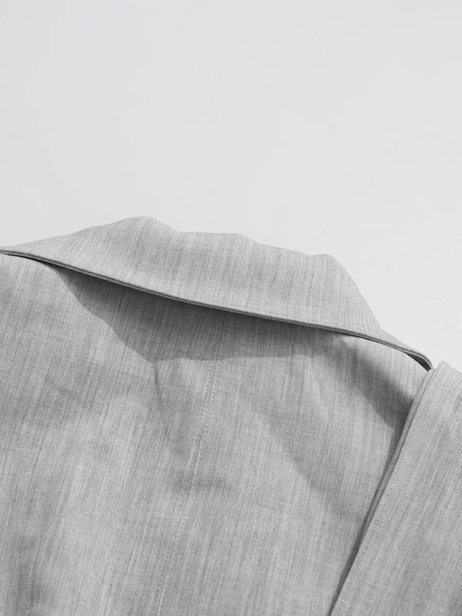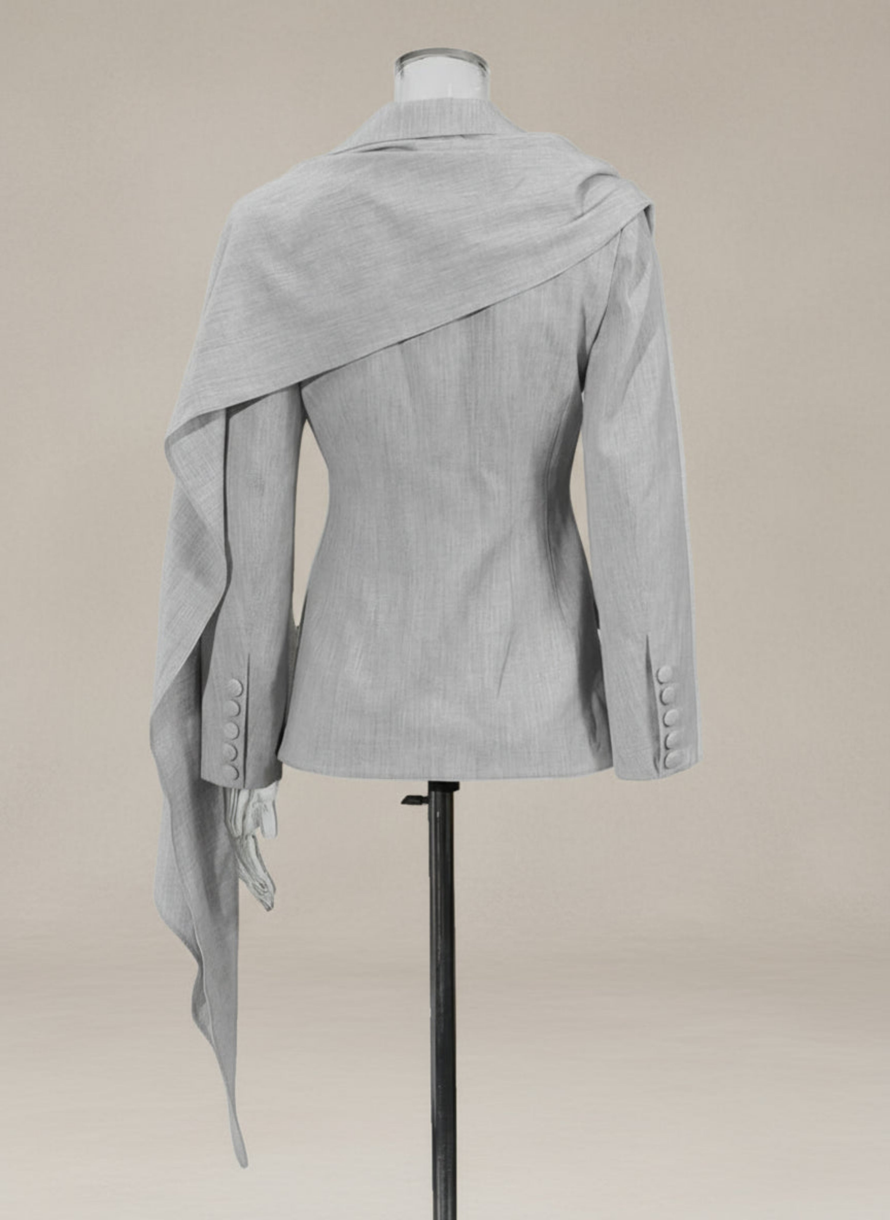 Features a notched lapel, single button closure, and long flowing scarf-style sleeves creating a draped, asymmetrical silhouette. A modern, designer take on a classic blazer.