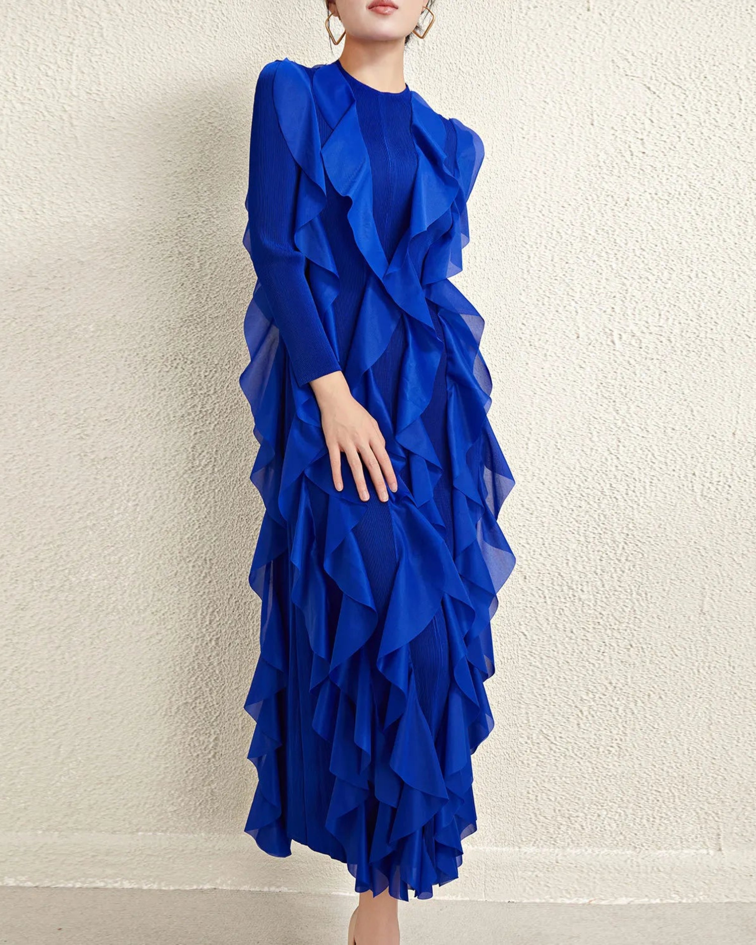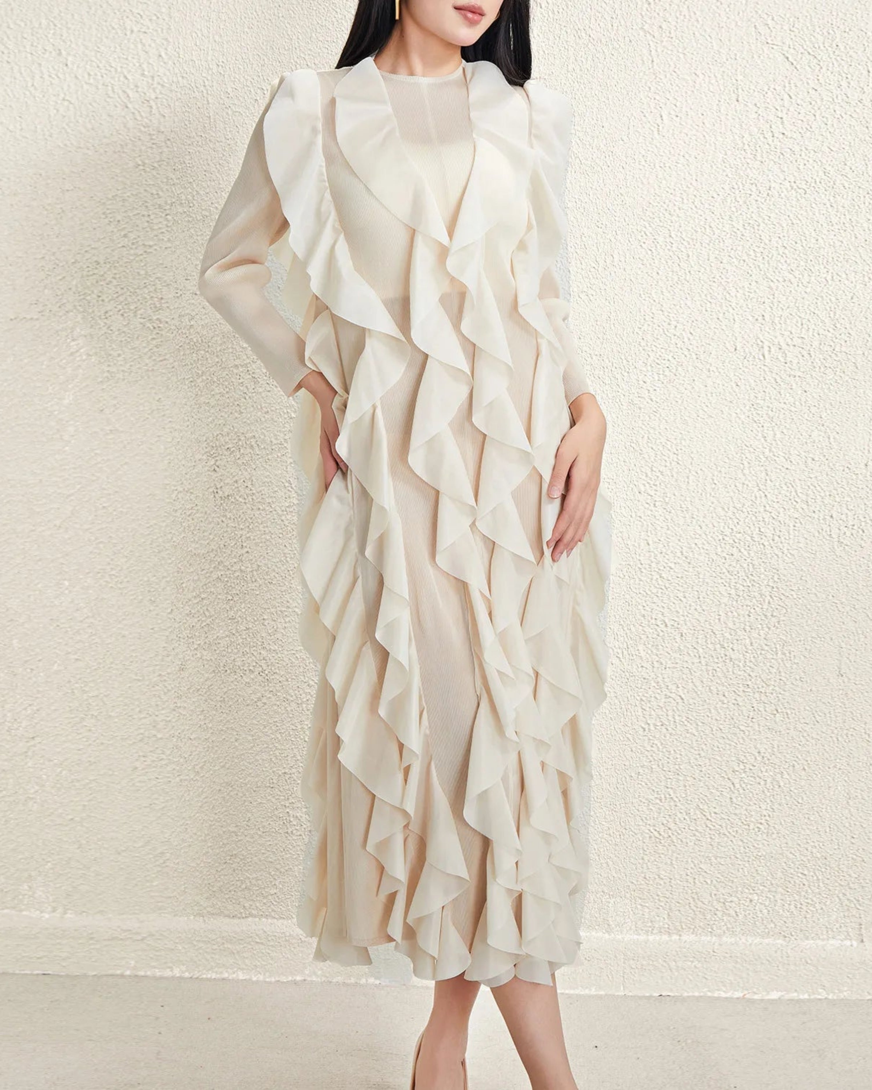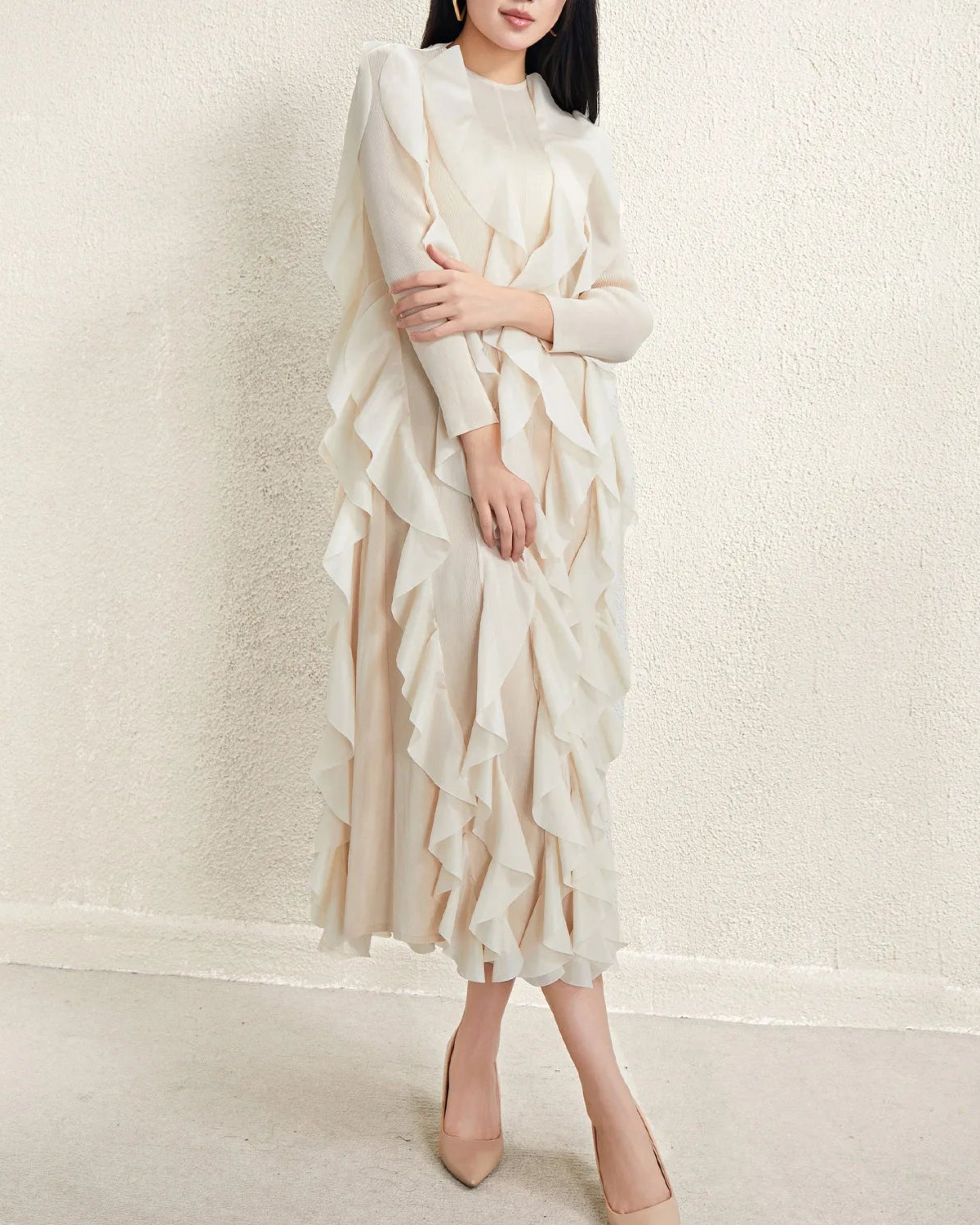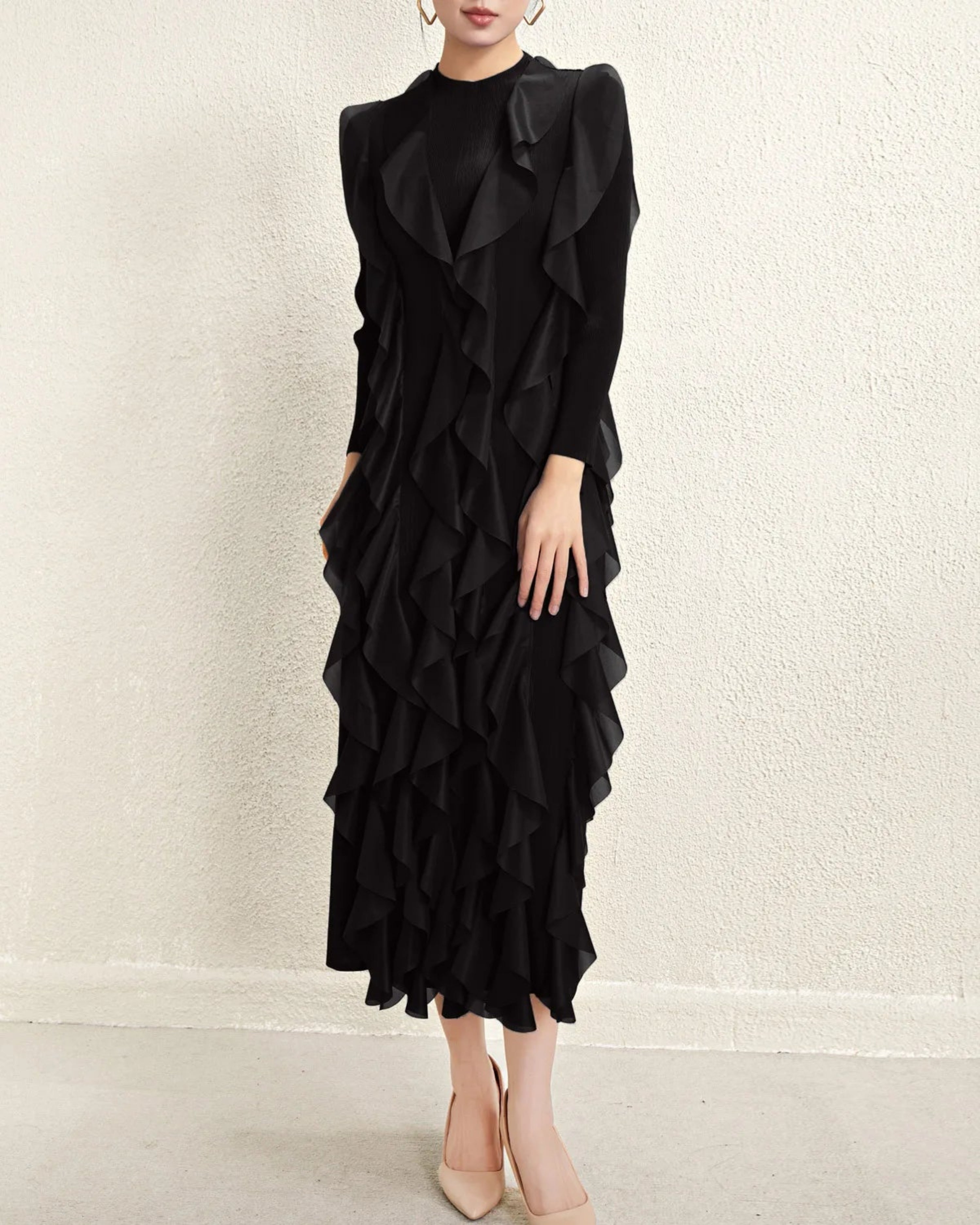 This luxurious midi dress features cascading vertical ruffles from the high neckline to the hem, paired with finely Japanese micro-pleated fabric.