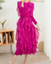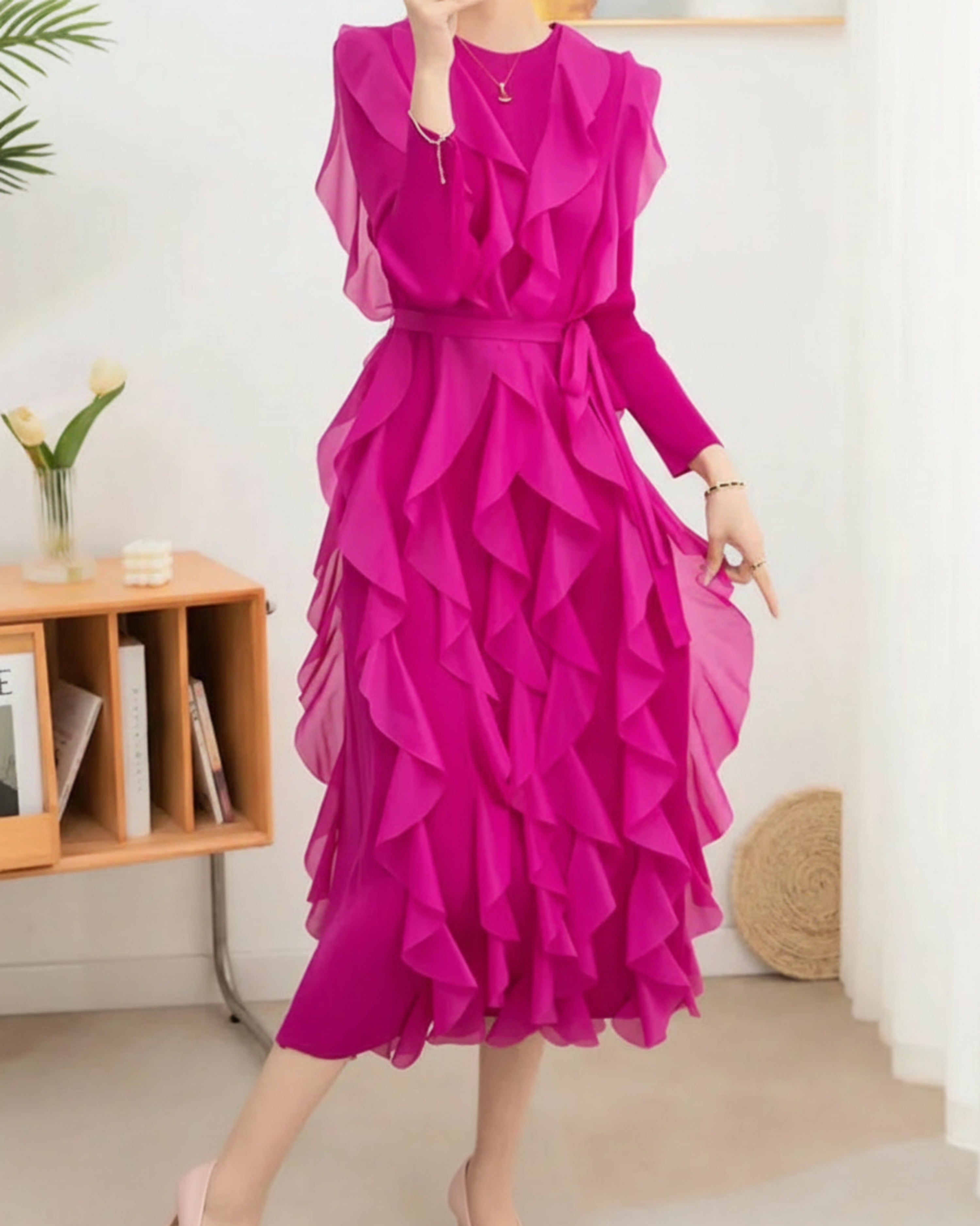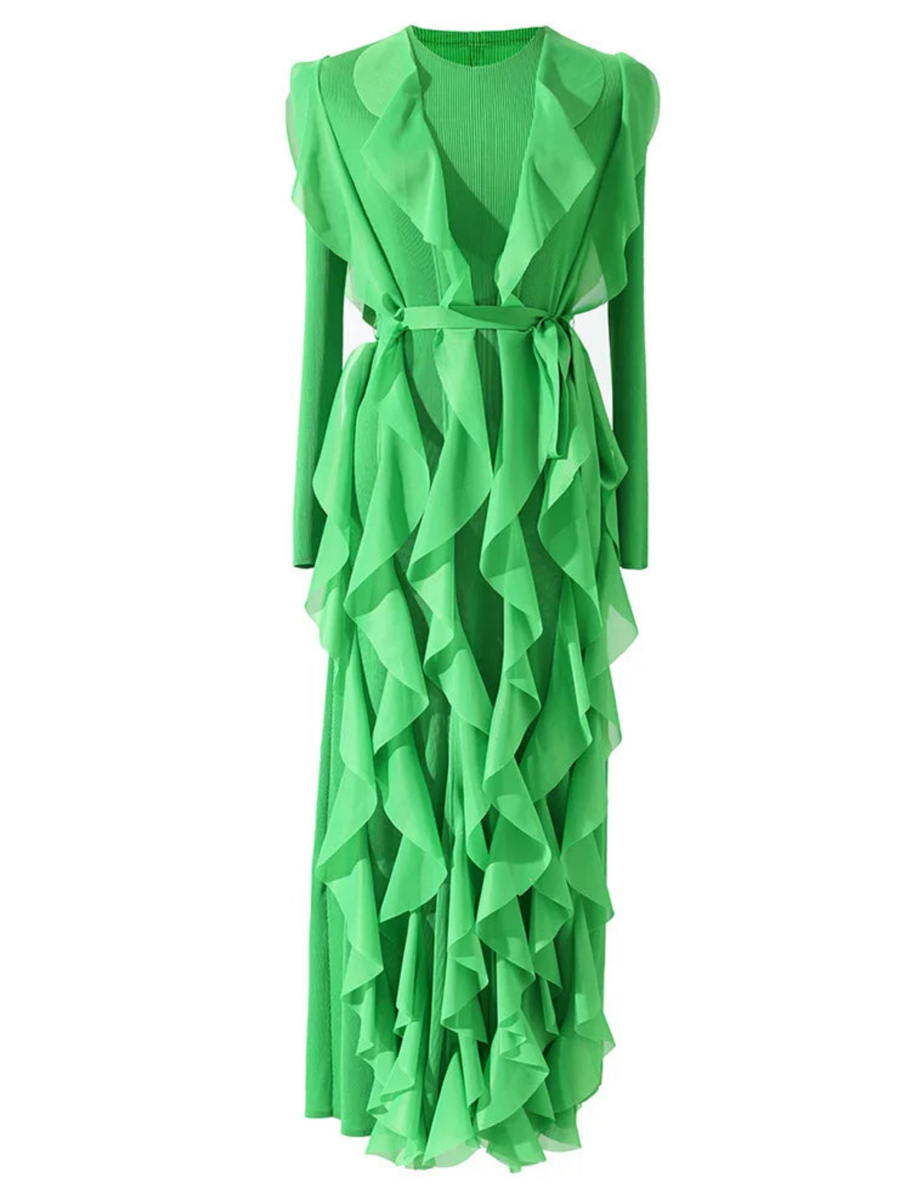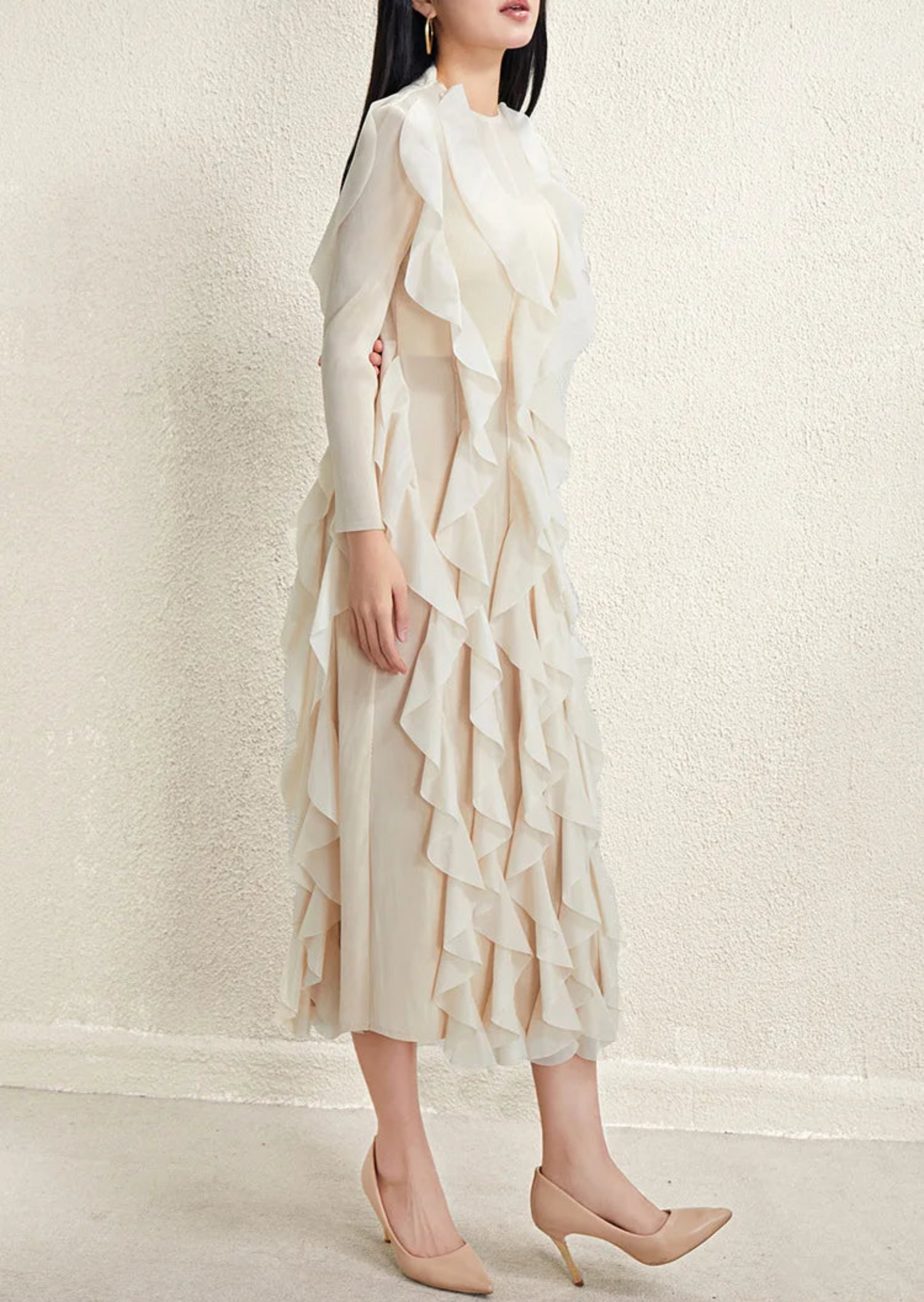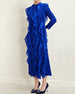 This luxurious midi dress features cascading vertical ruffles from the high neckline to the hem, paired with finely Japanese micro-pleated fabric.