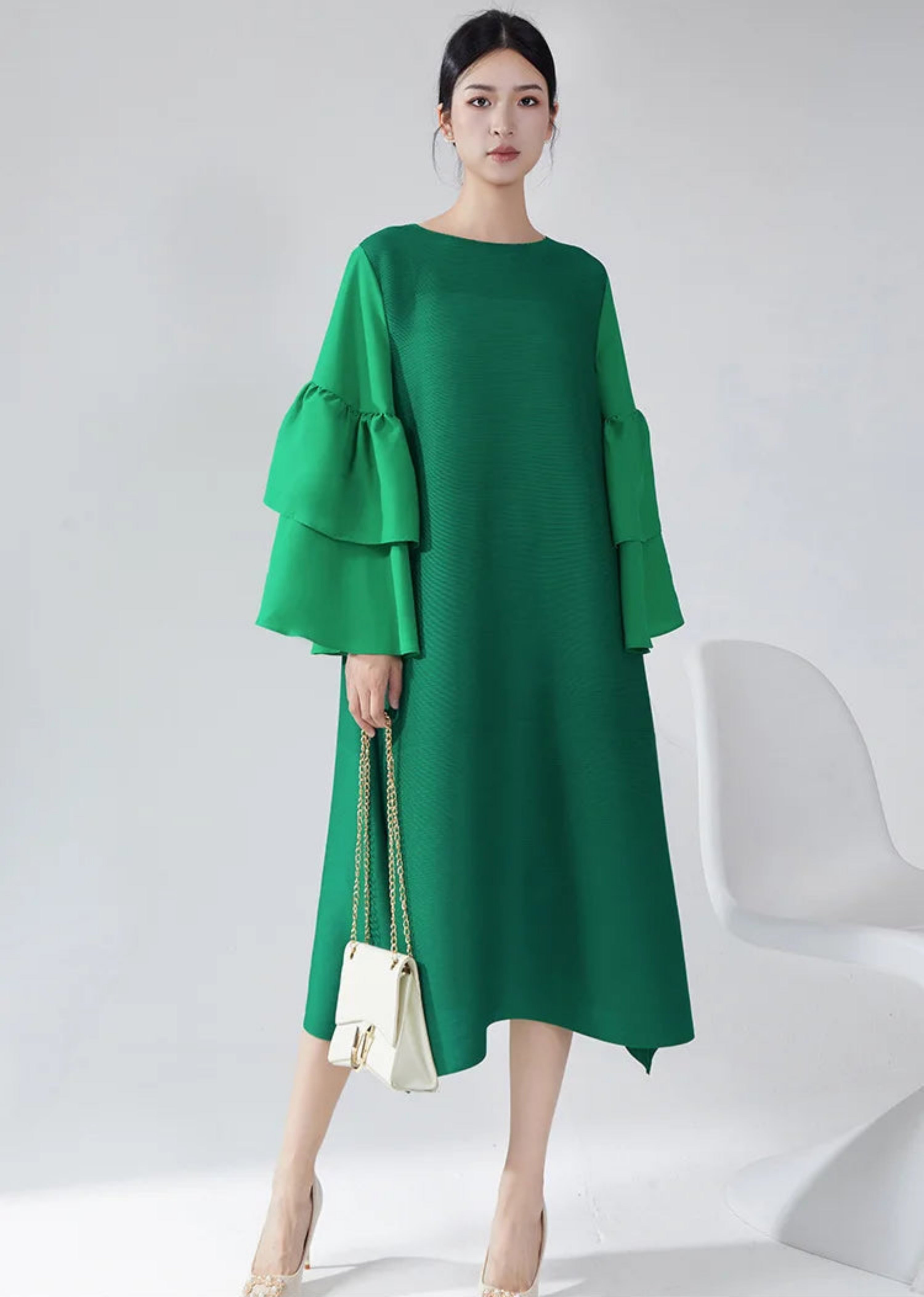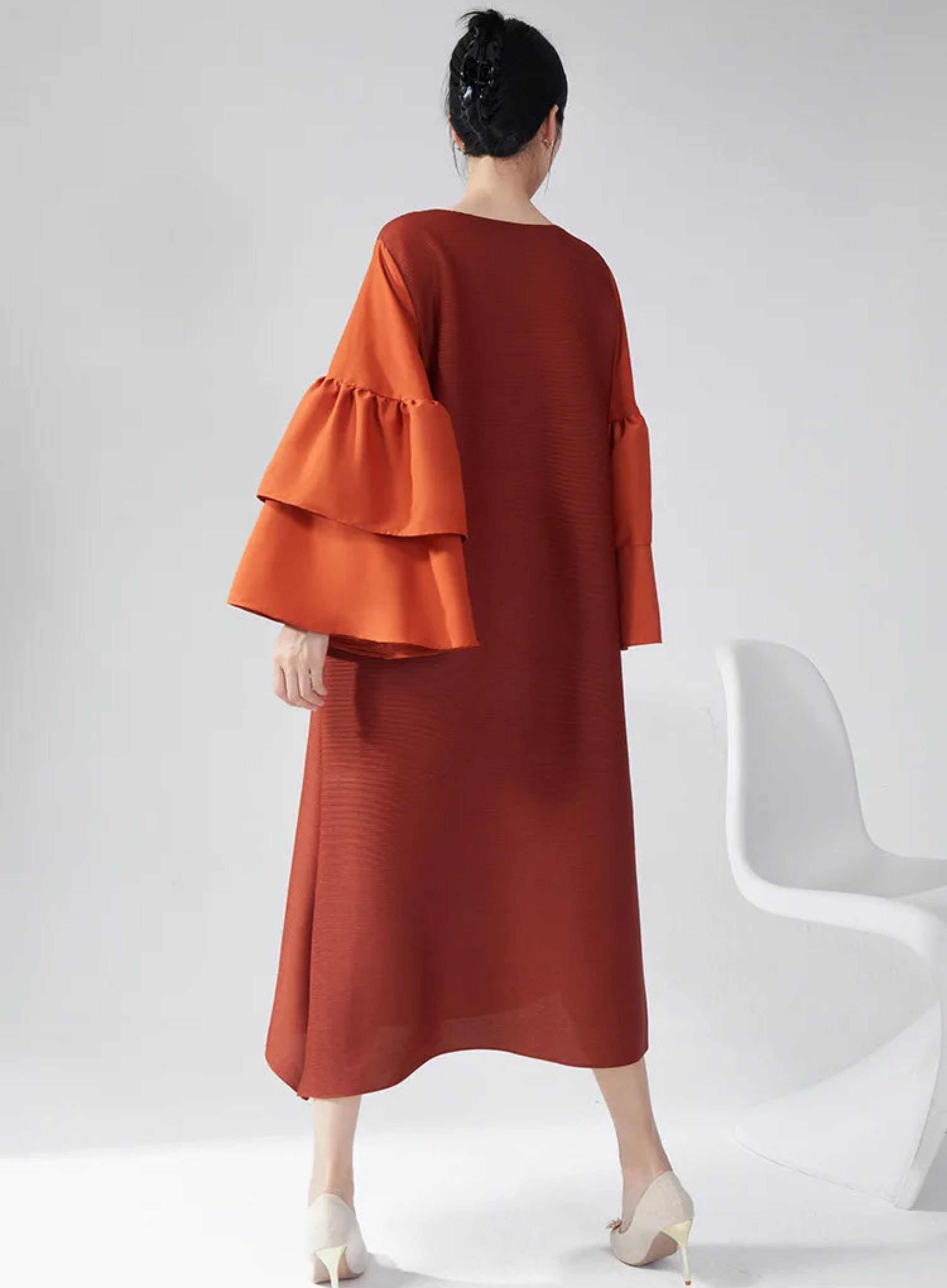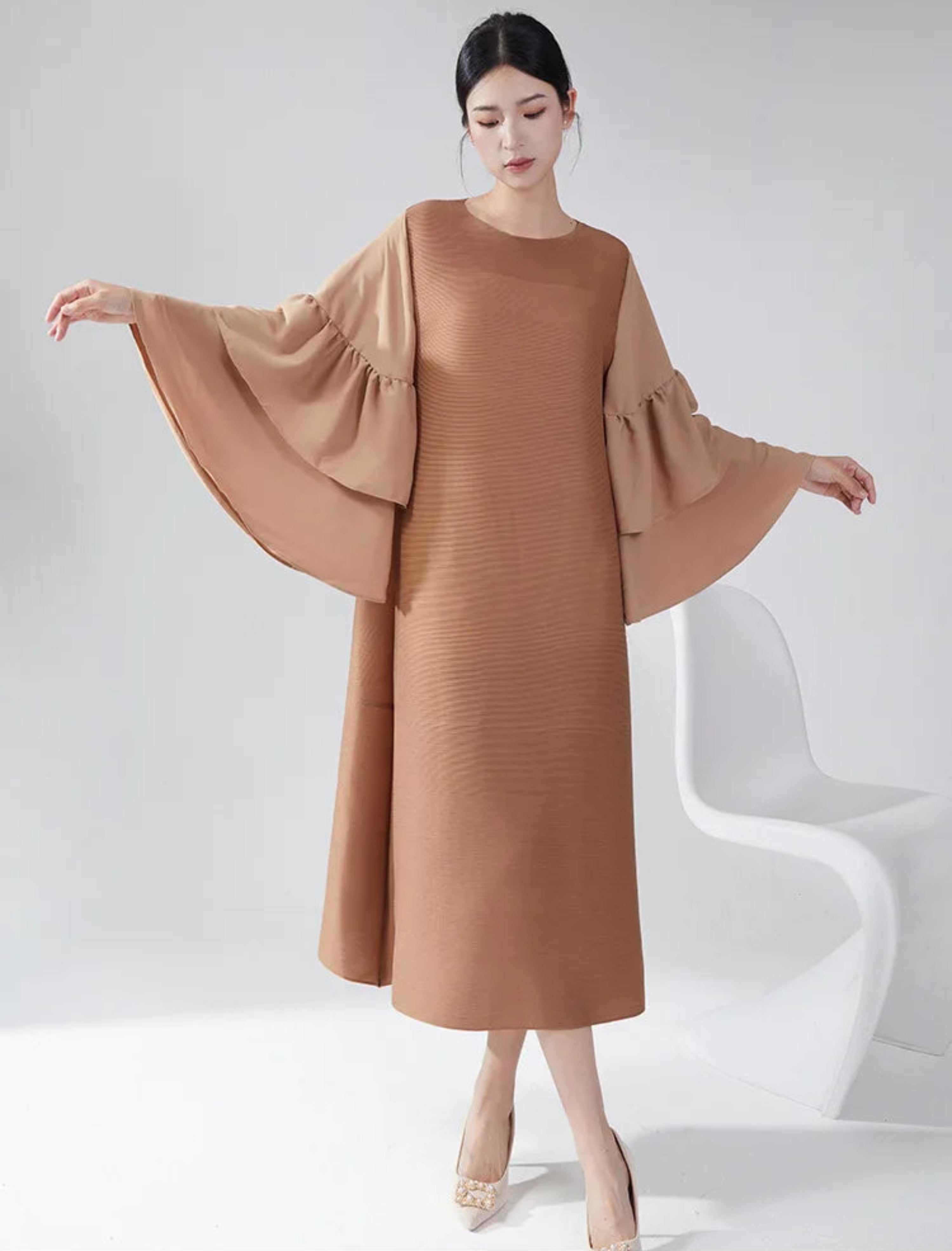A sculptural midi-length dress with Japanese pleats and dramatic oversized ruffle sleeves.