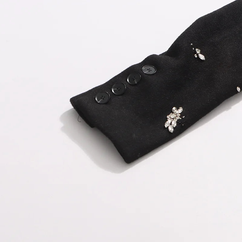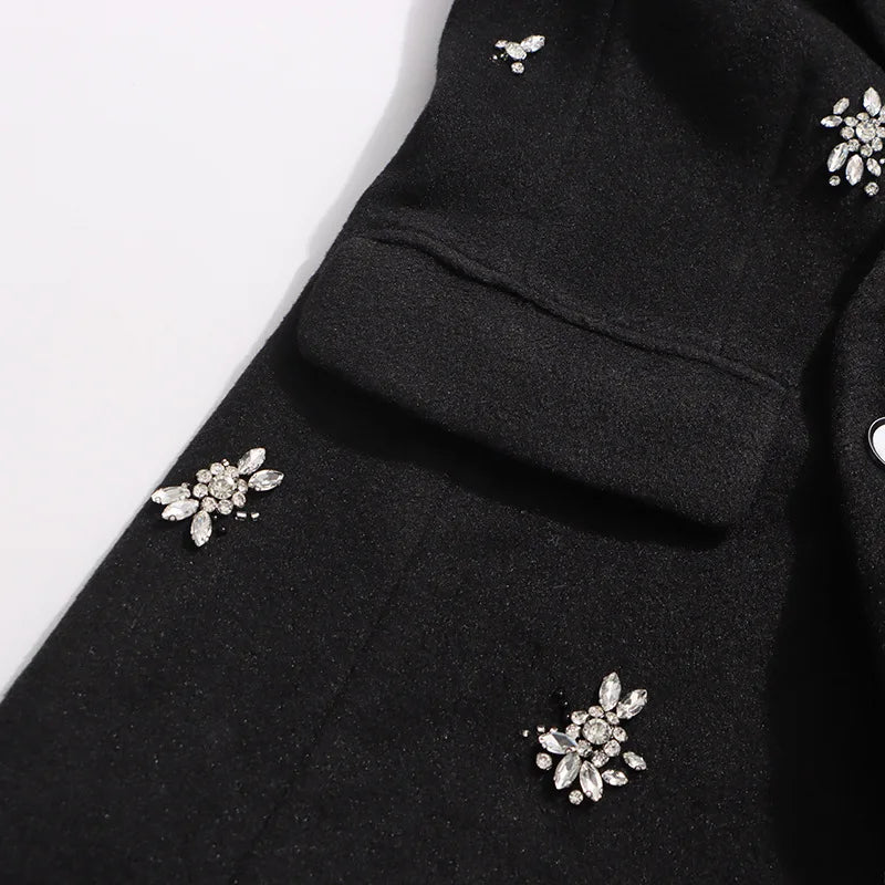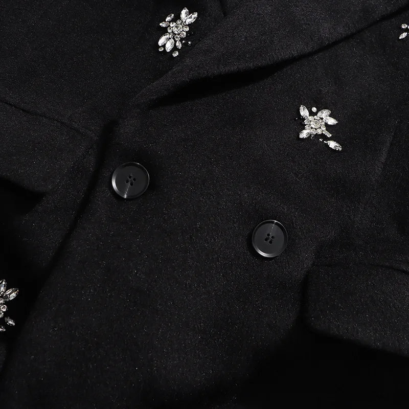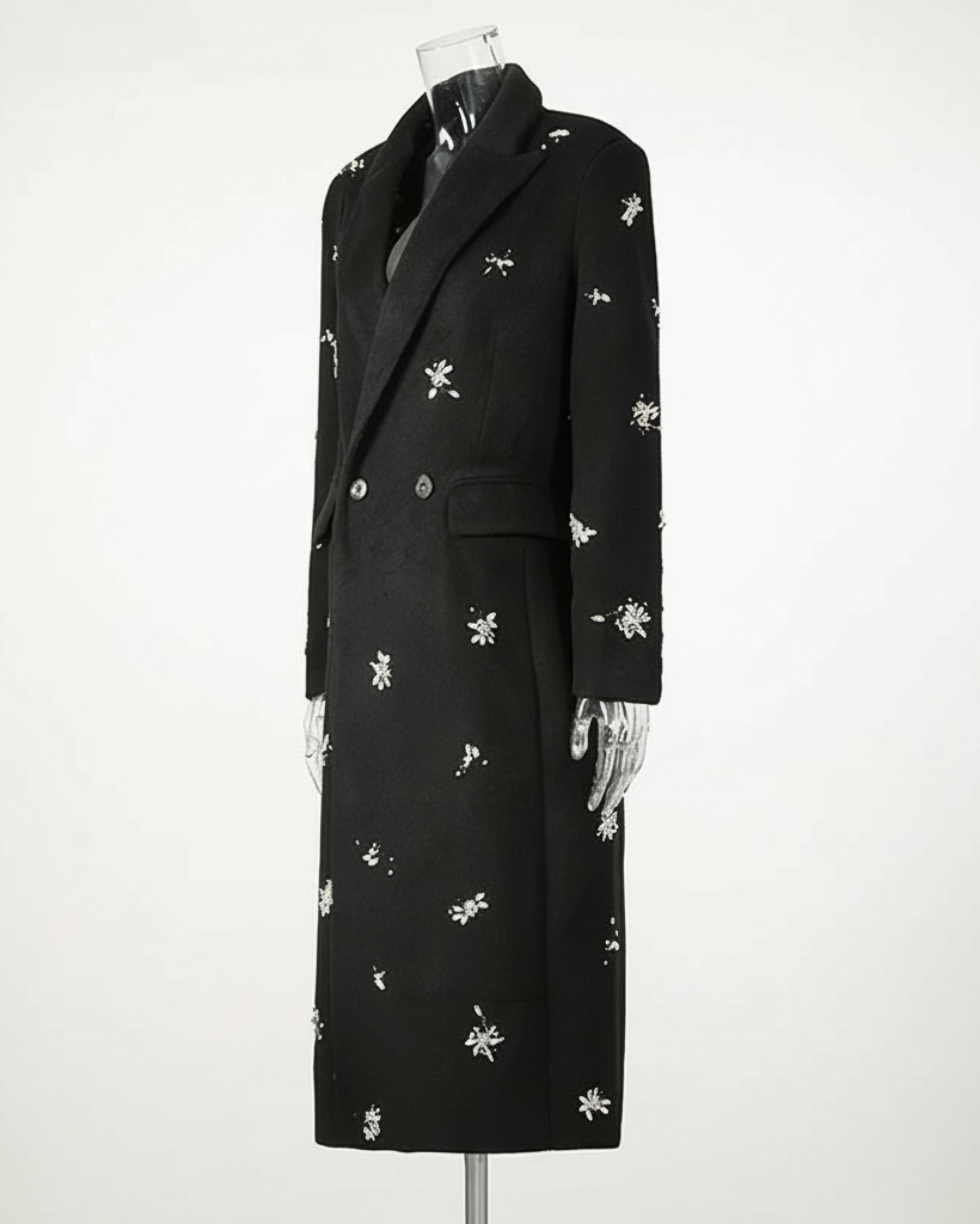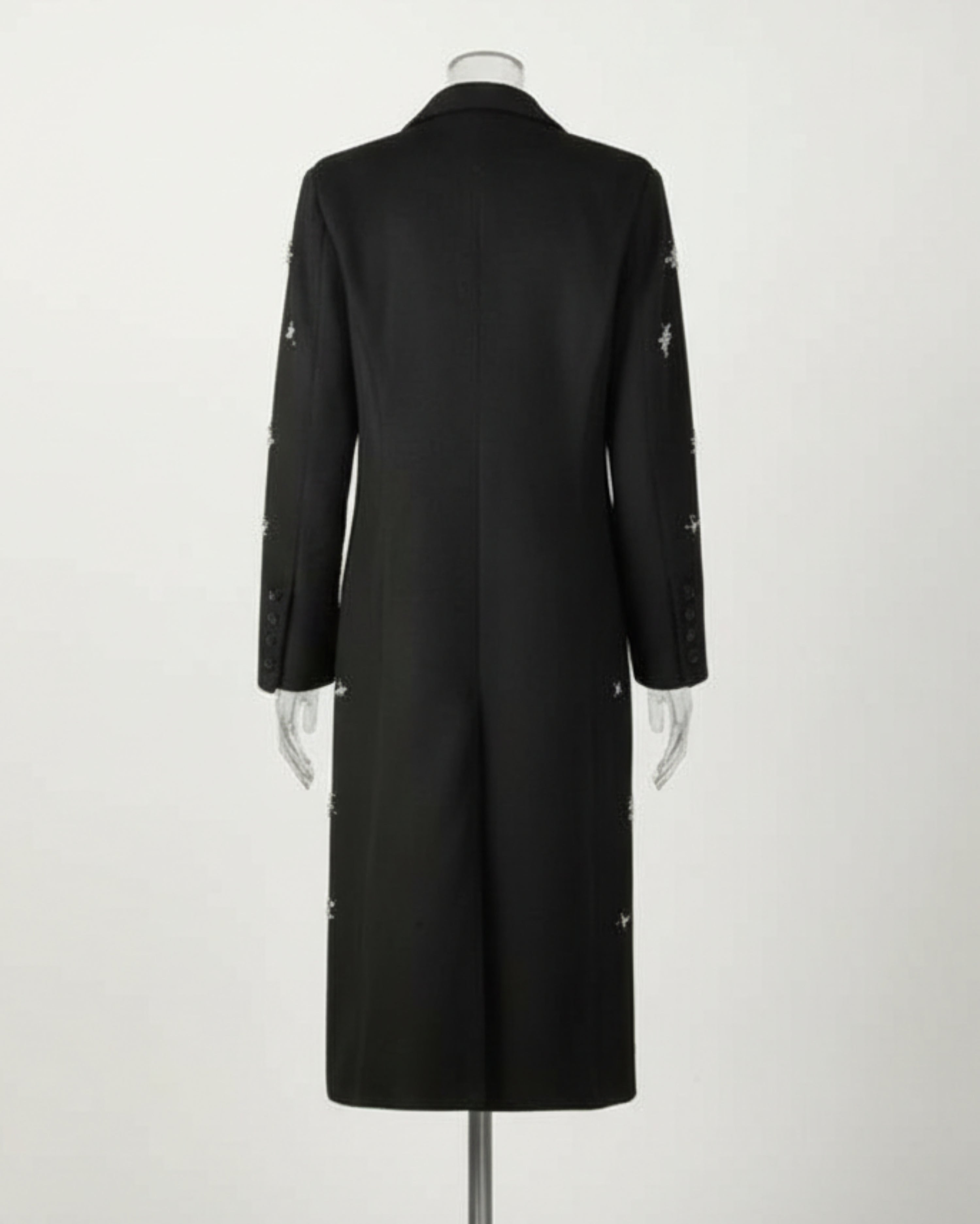 This luxurious longline coat combines premium brushed wool with unique crystal embellishments for a striking, stylish presence.