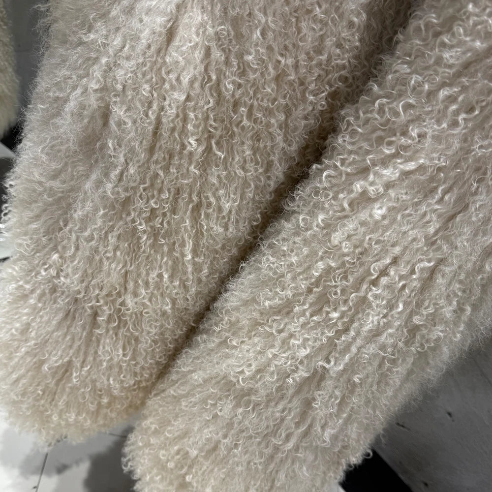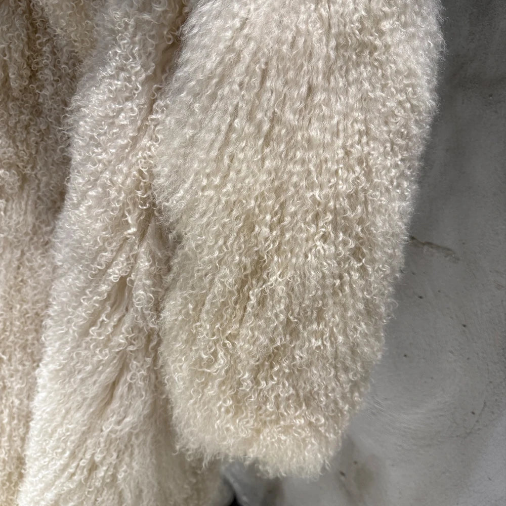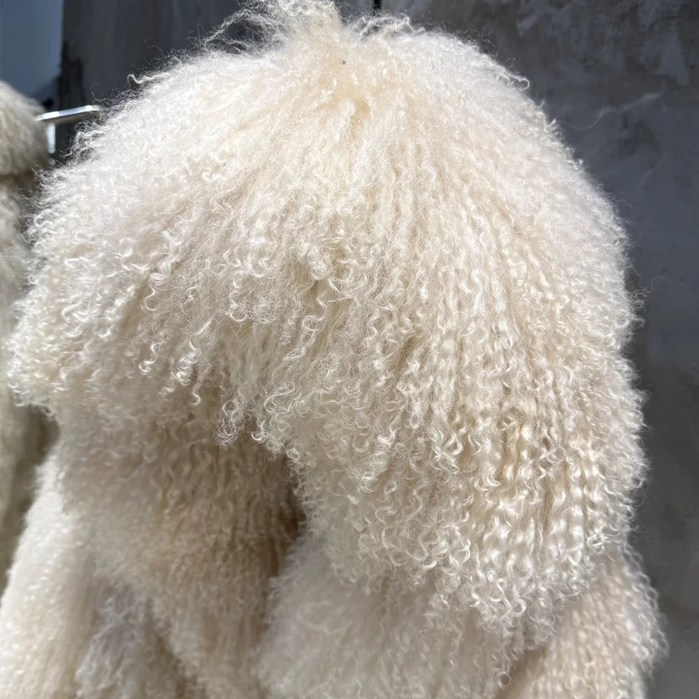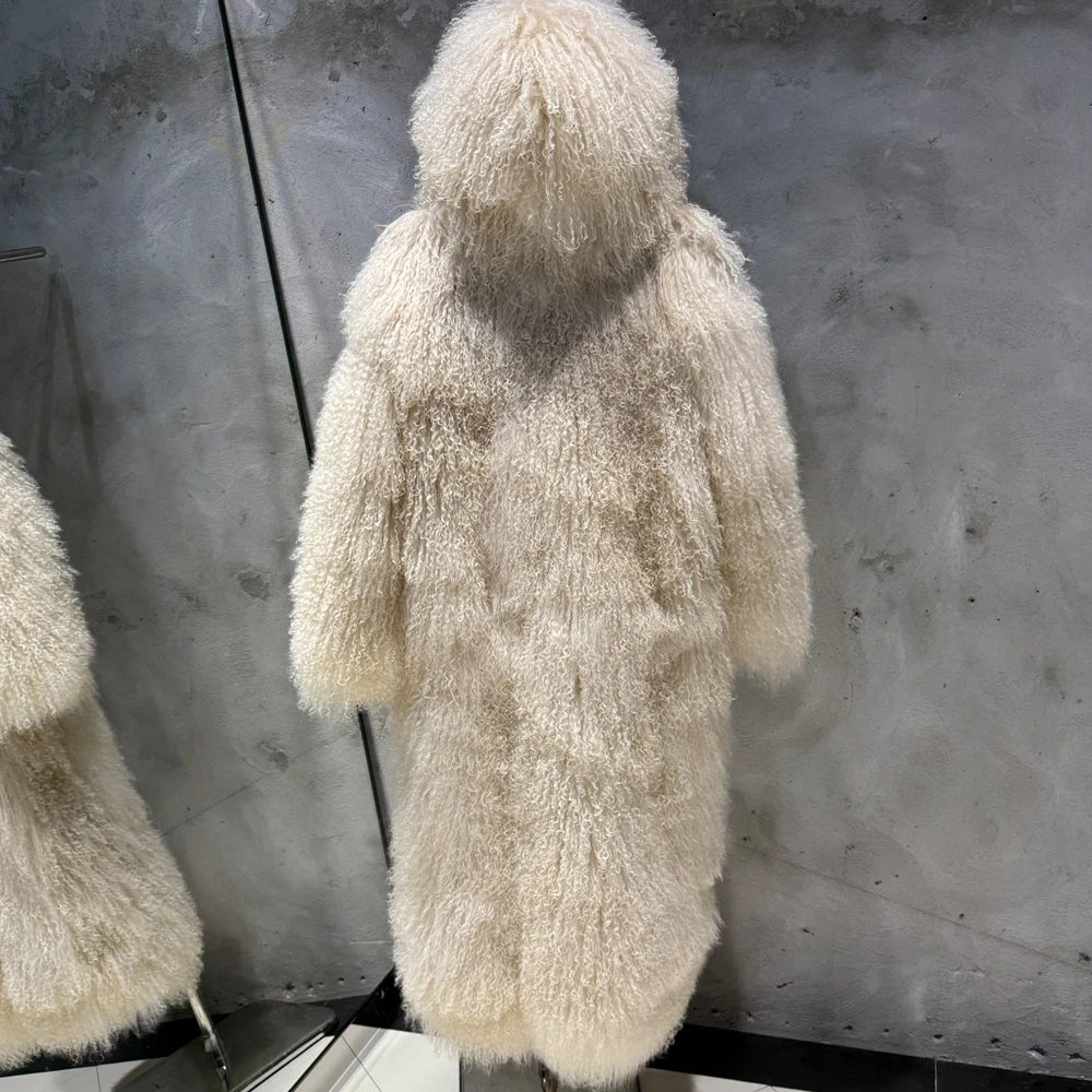 A made-to-order couture overcoat in 100% genuine Tibetan Mongolian curly lamb fur. It features a dramatic oversized hood and a full-length silhouette with rich, bouncy curls and natural volume.