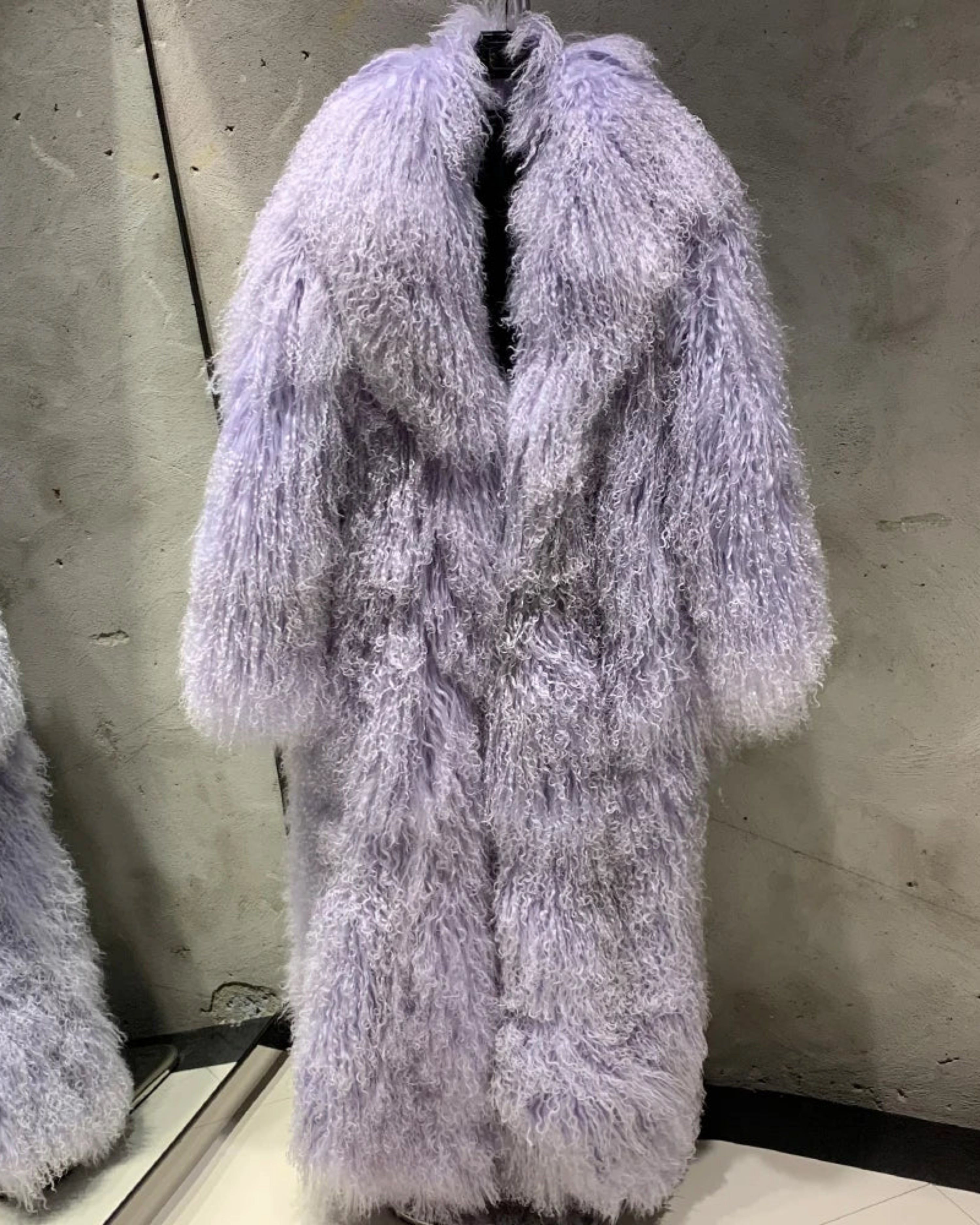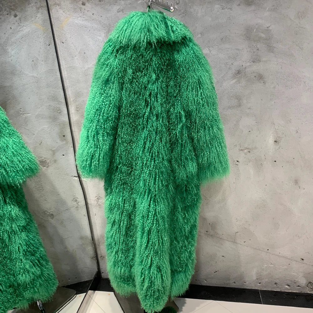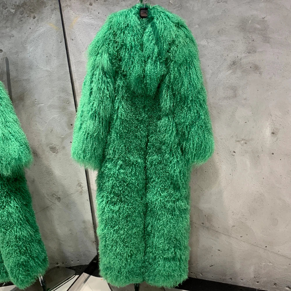 A luxurious, made-to-order Mongolian lamb fur coat offering exceptional warmth and style. The full-length silhouette features long, curly lamb fur with a plush, voluminous texture.
