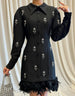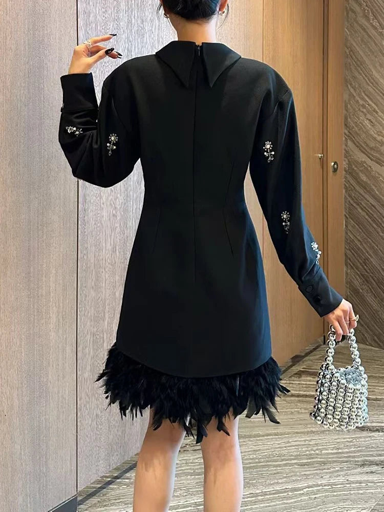 Adorned with floral-inspired crystal and pearl appliqués across the bodice, sleeves, and skirt. Plush feather trim adds texture and playful elegance. Perfect for cocktail parties, formal events, vacations, and special occasions.
