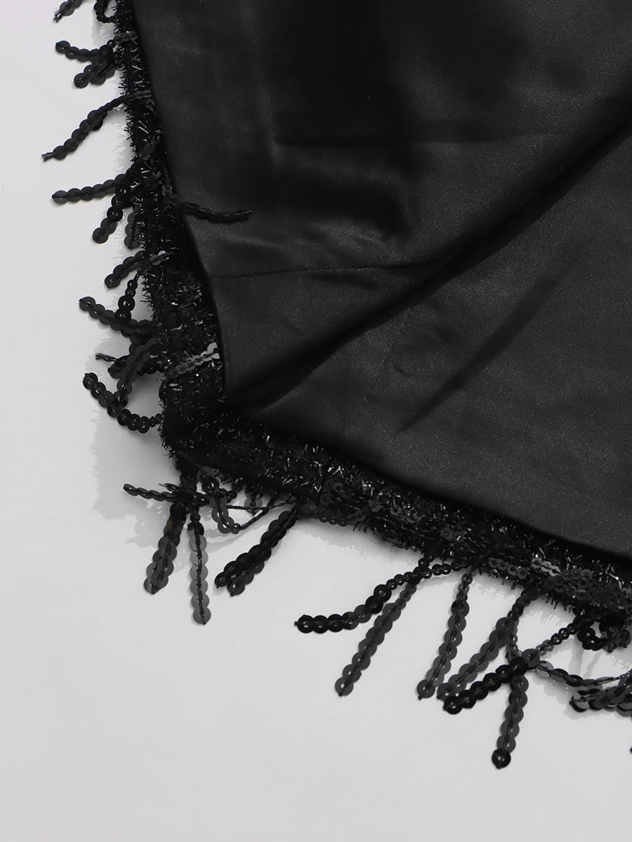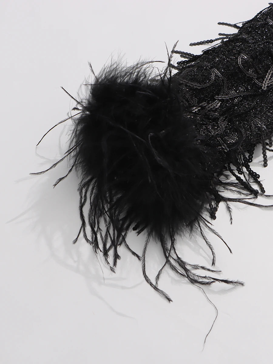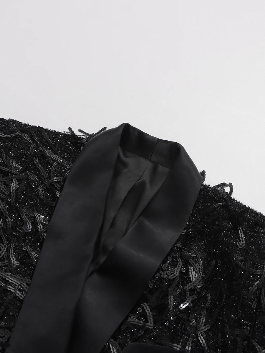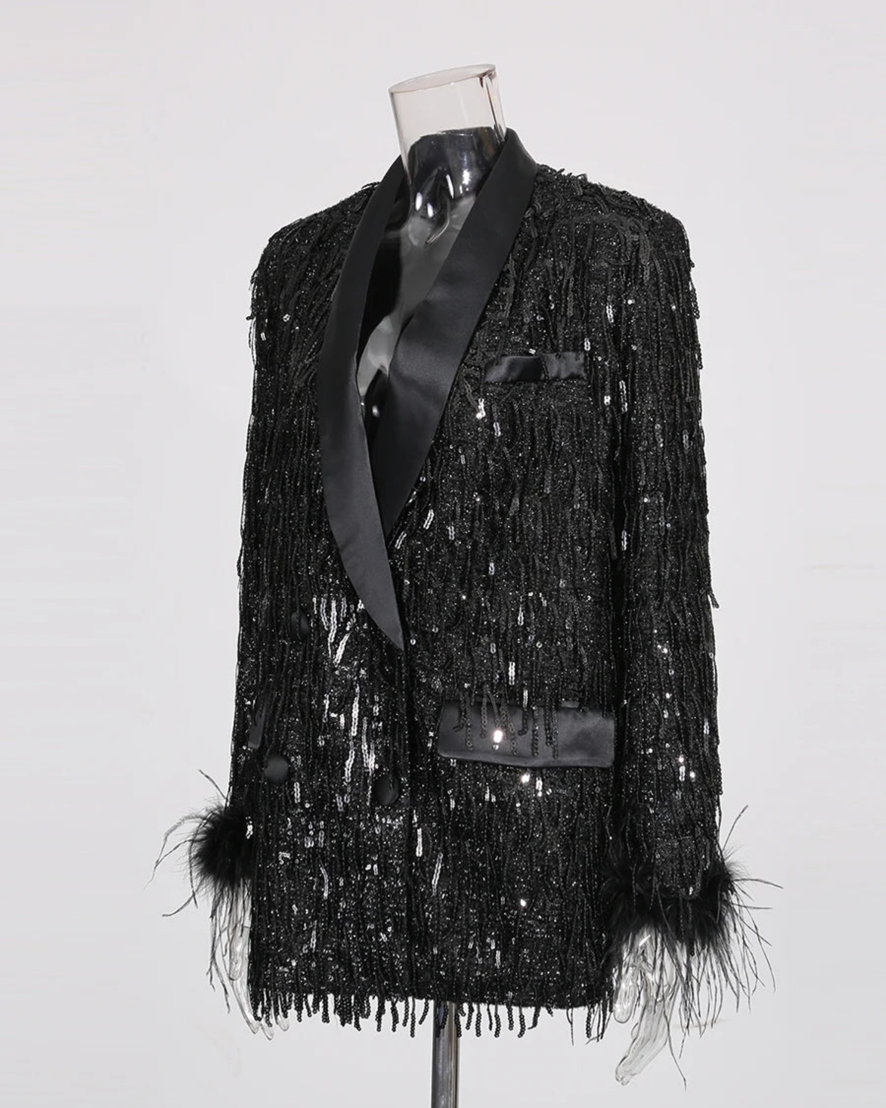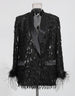 Satin shawl lapels and feathered cuffs add drama and flair, while the double-breasted closure delivers a stylish, statement-making silhouette for galas, parties, or formal events.