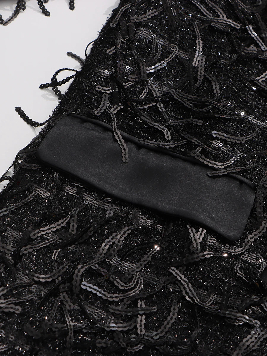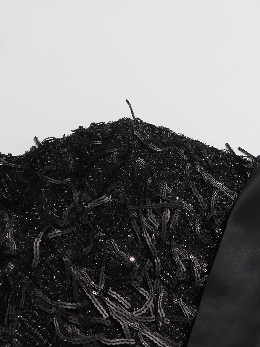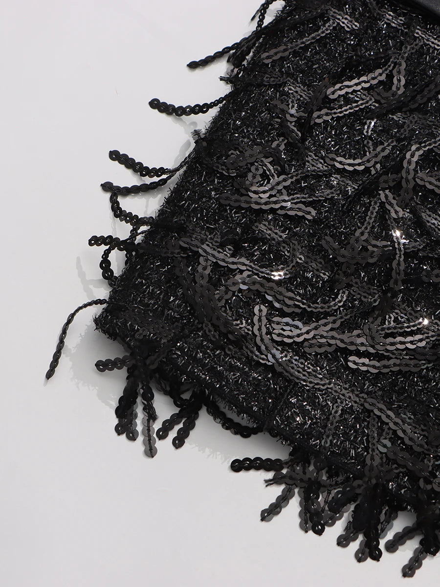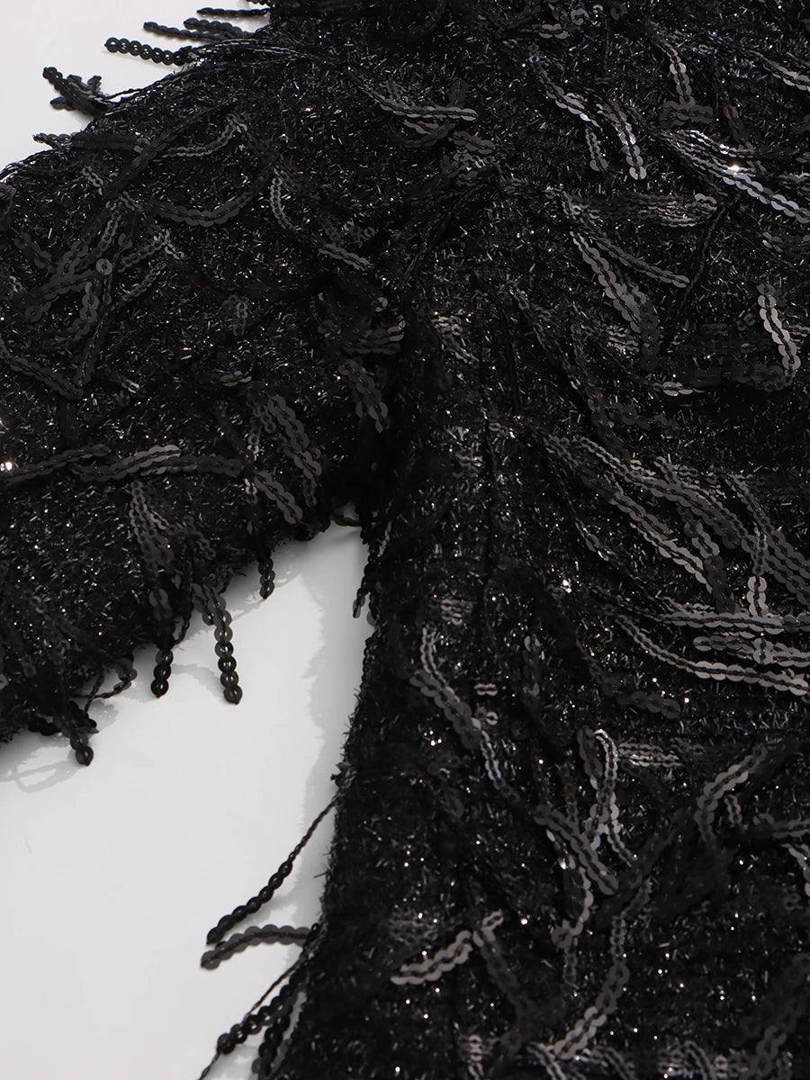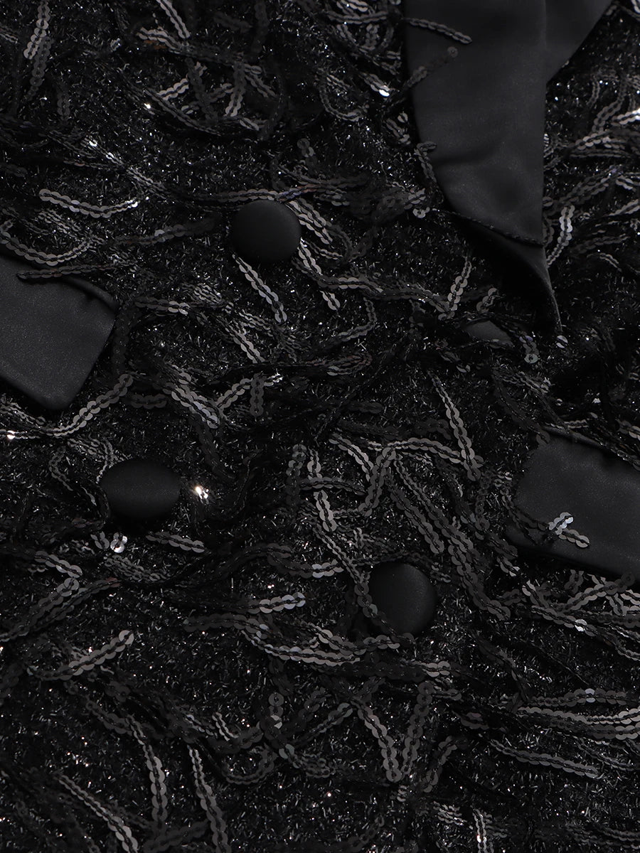 This women’s double-breasted blazer dazzles with full sequin coverage and a relaxed, casual loose fit.