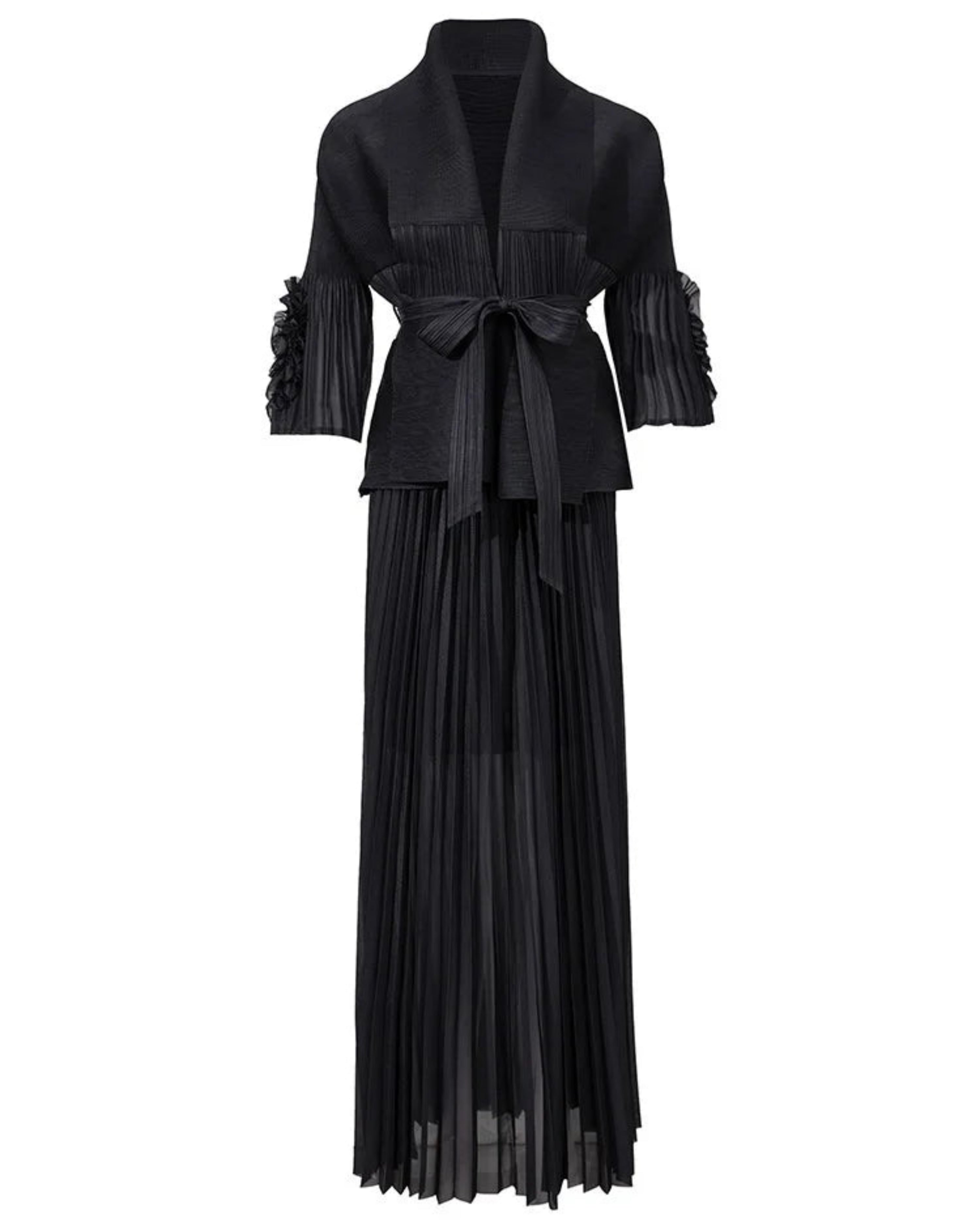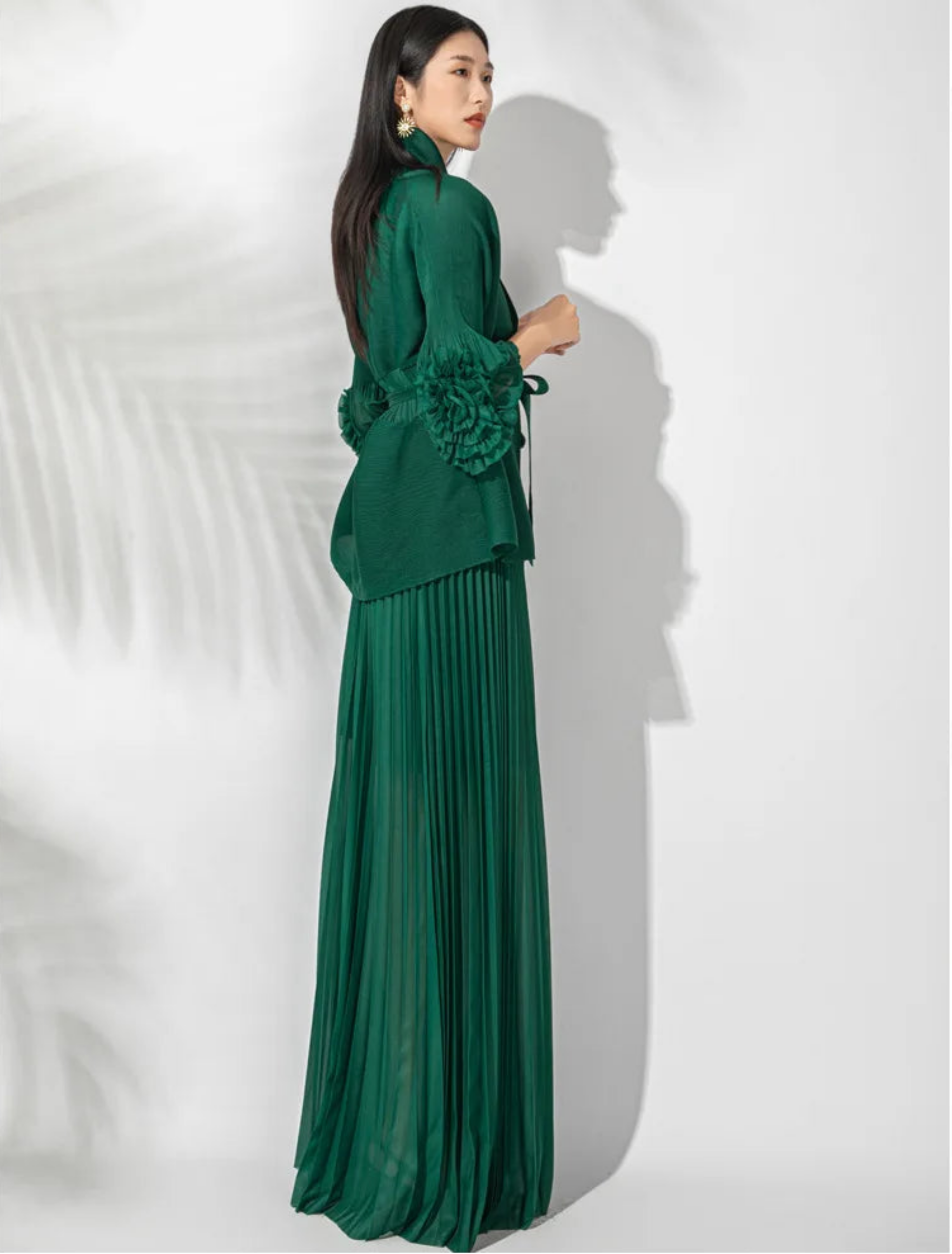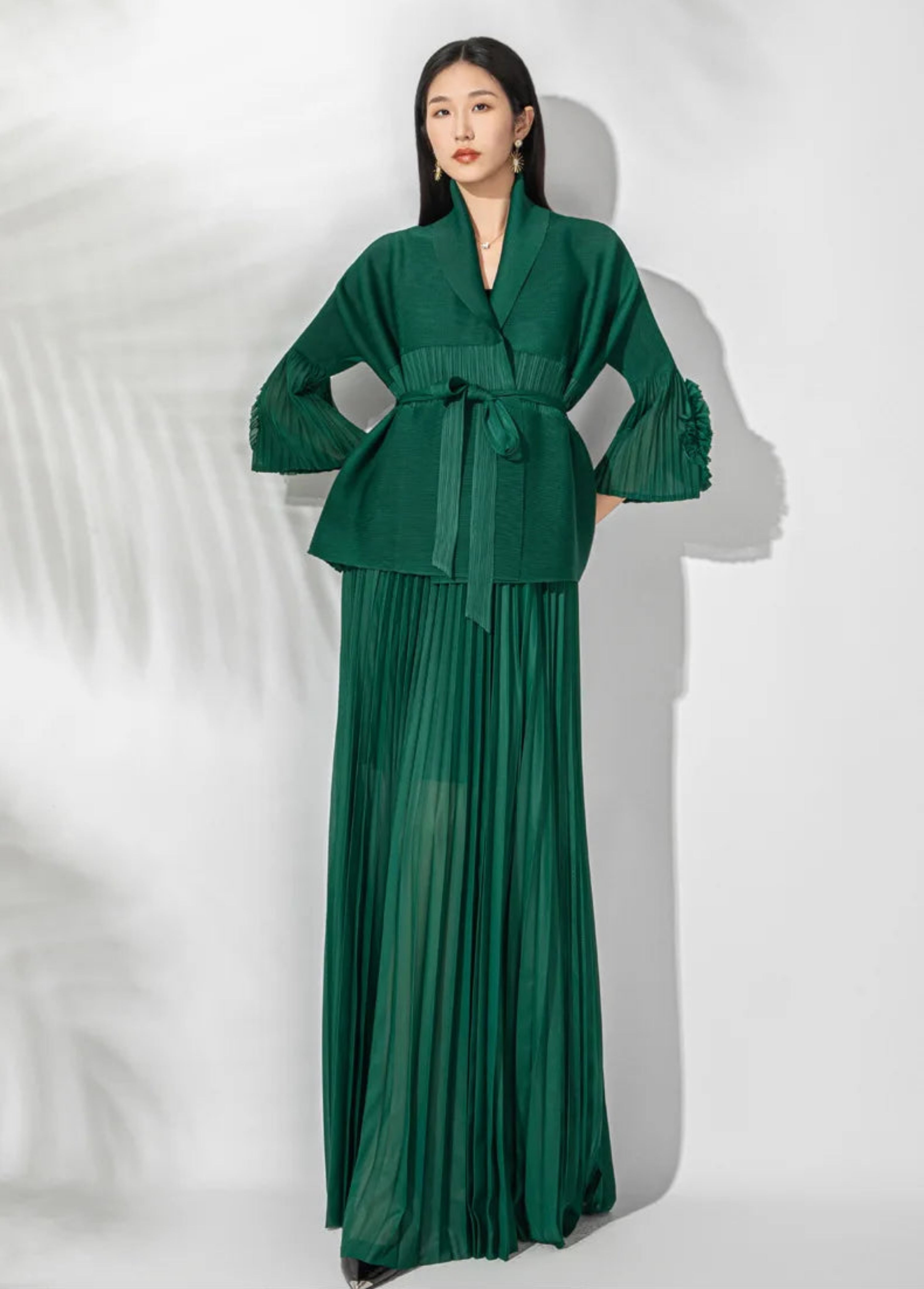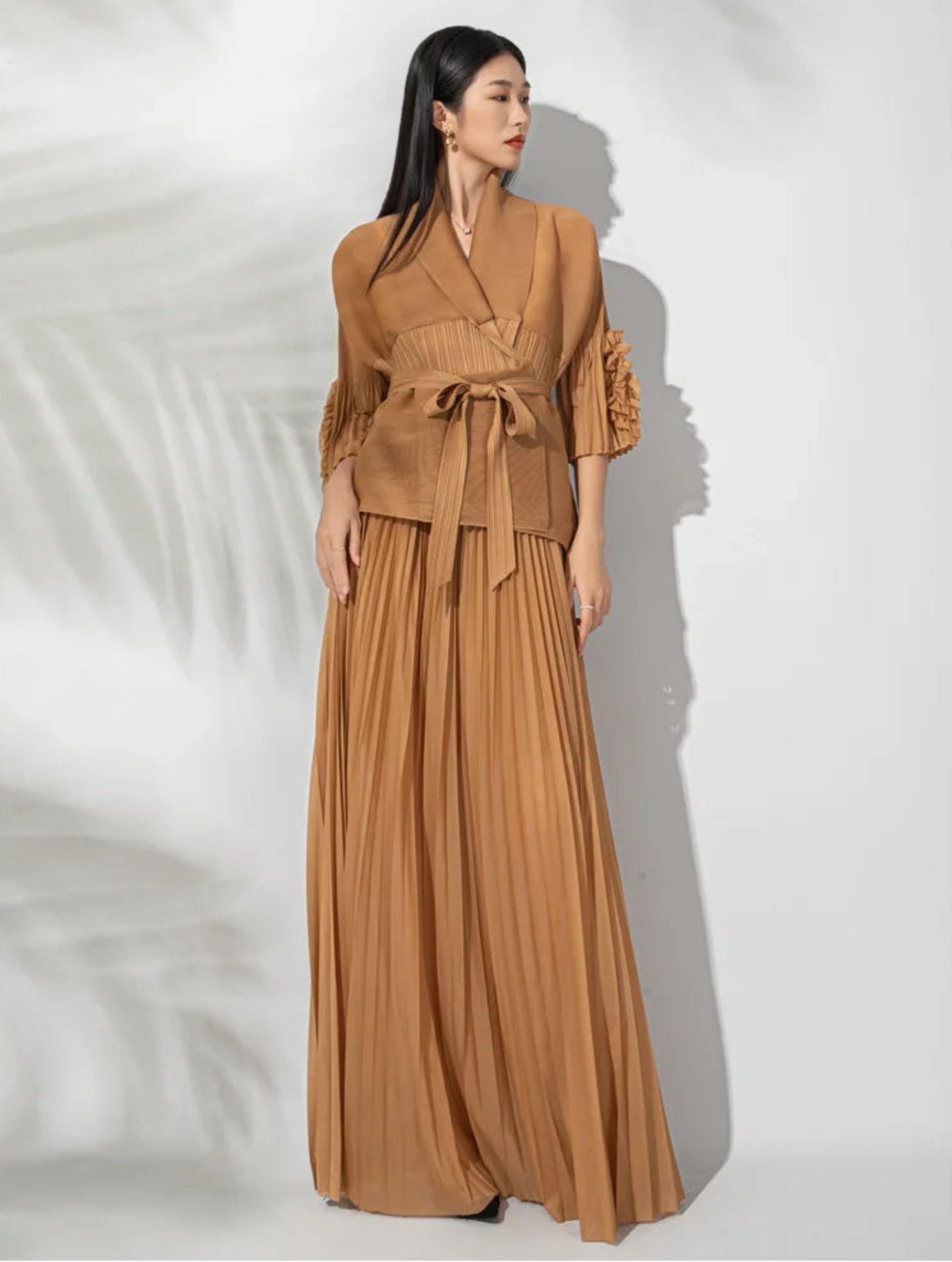 This luxurious two-piece set pairs premium Japanese pleats with a unique, flowing silhouette.