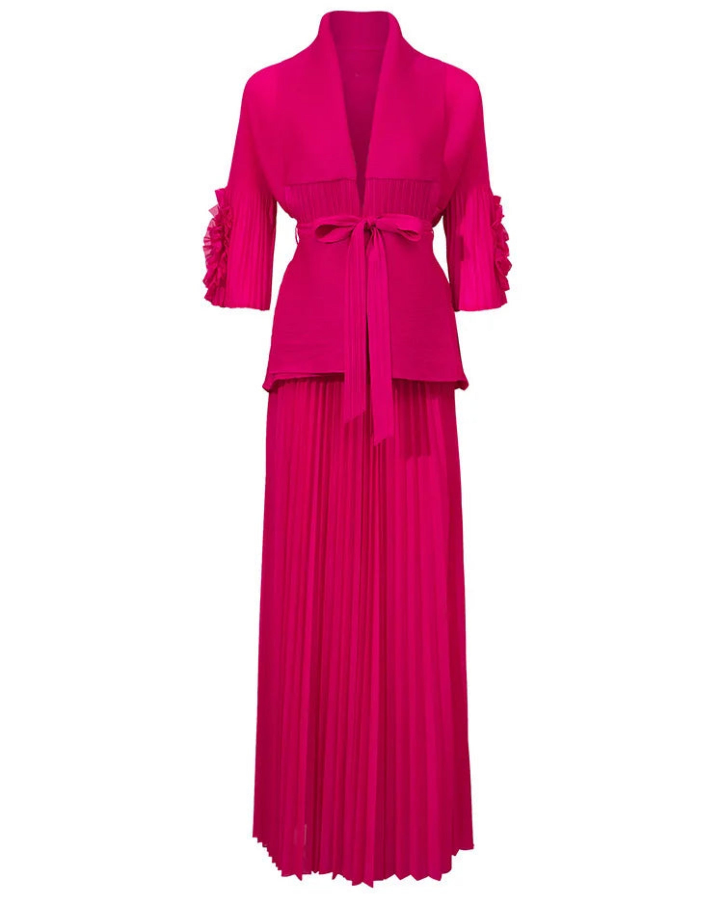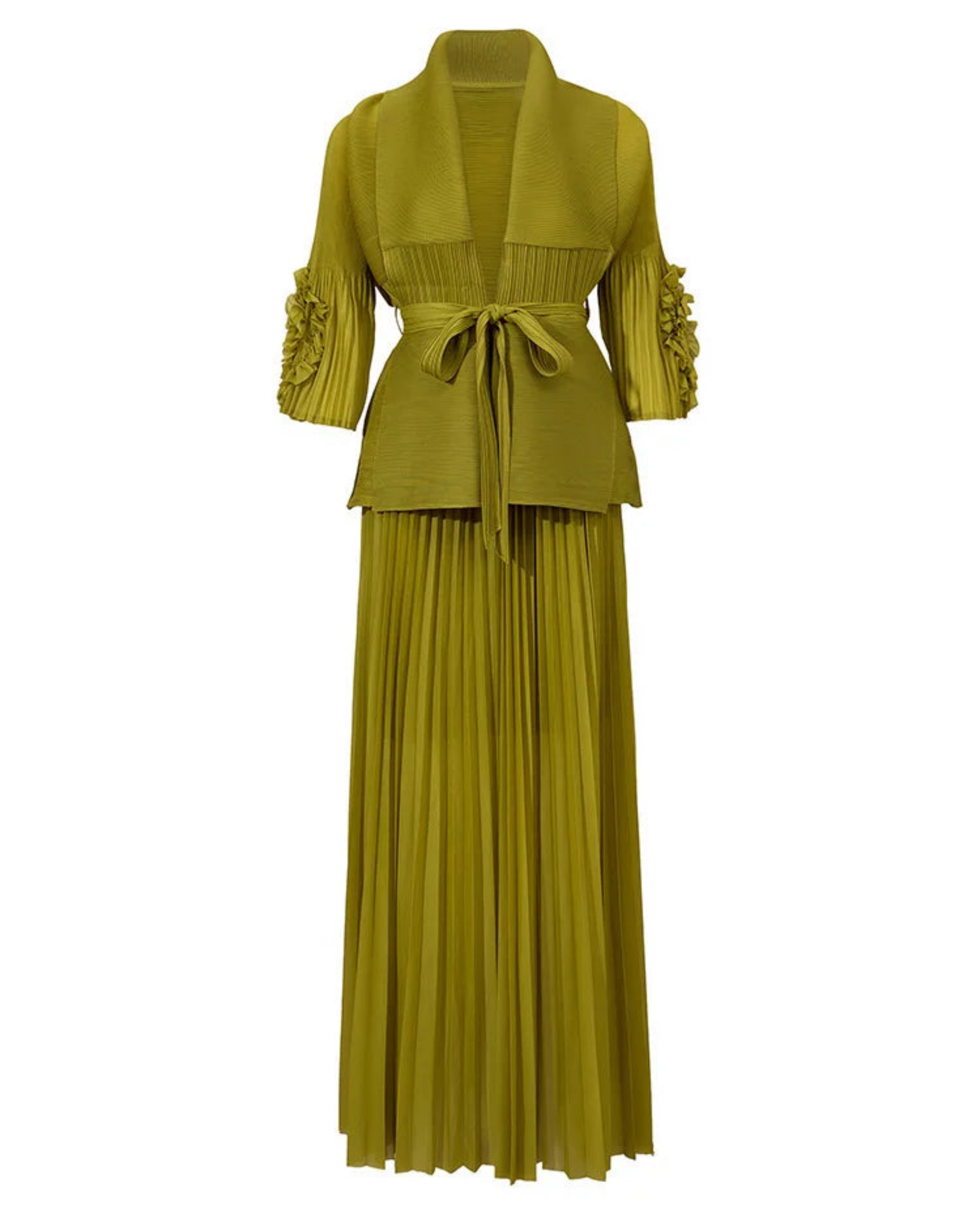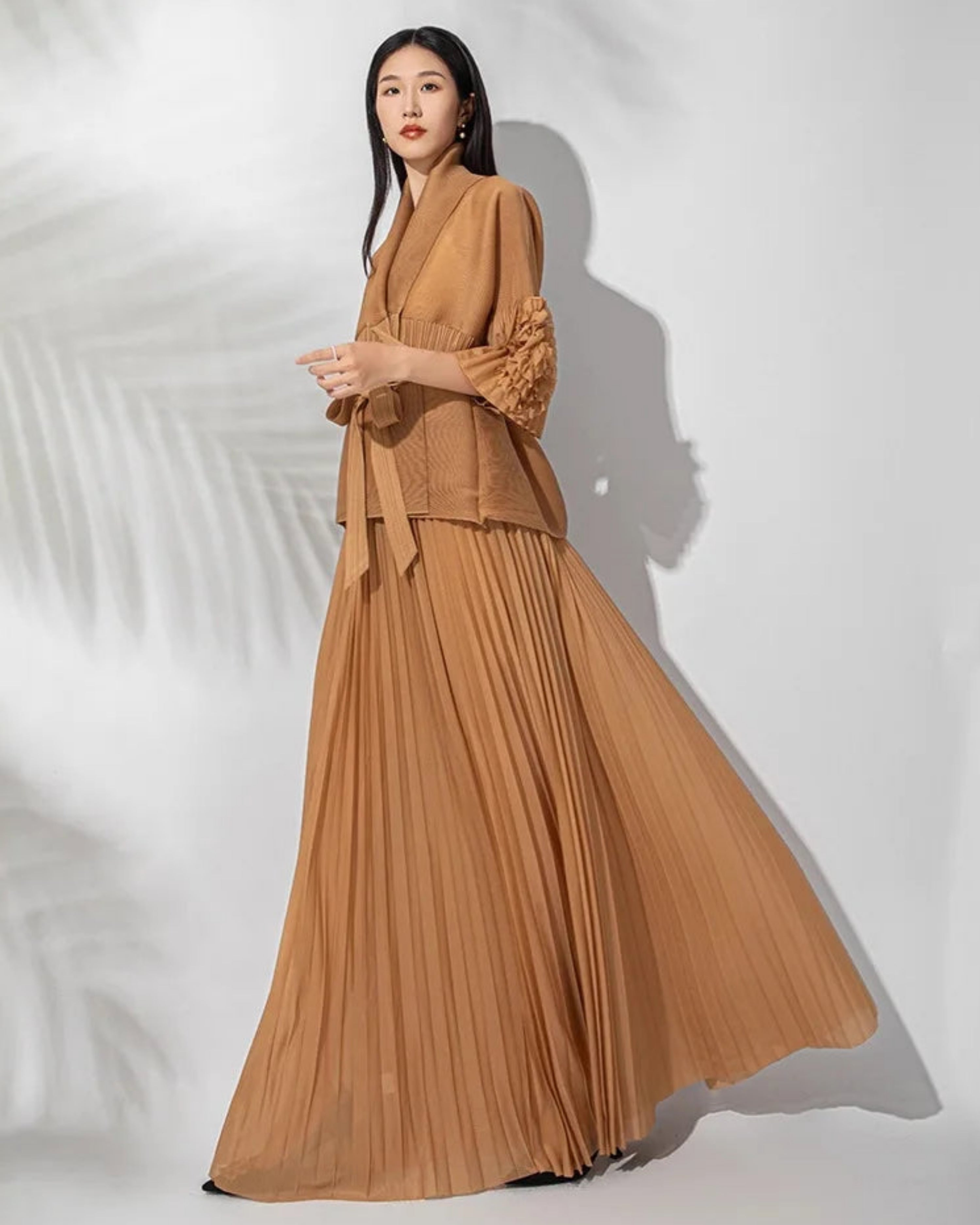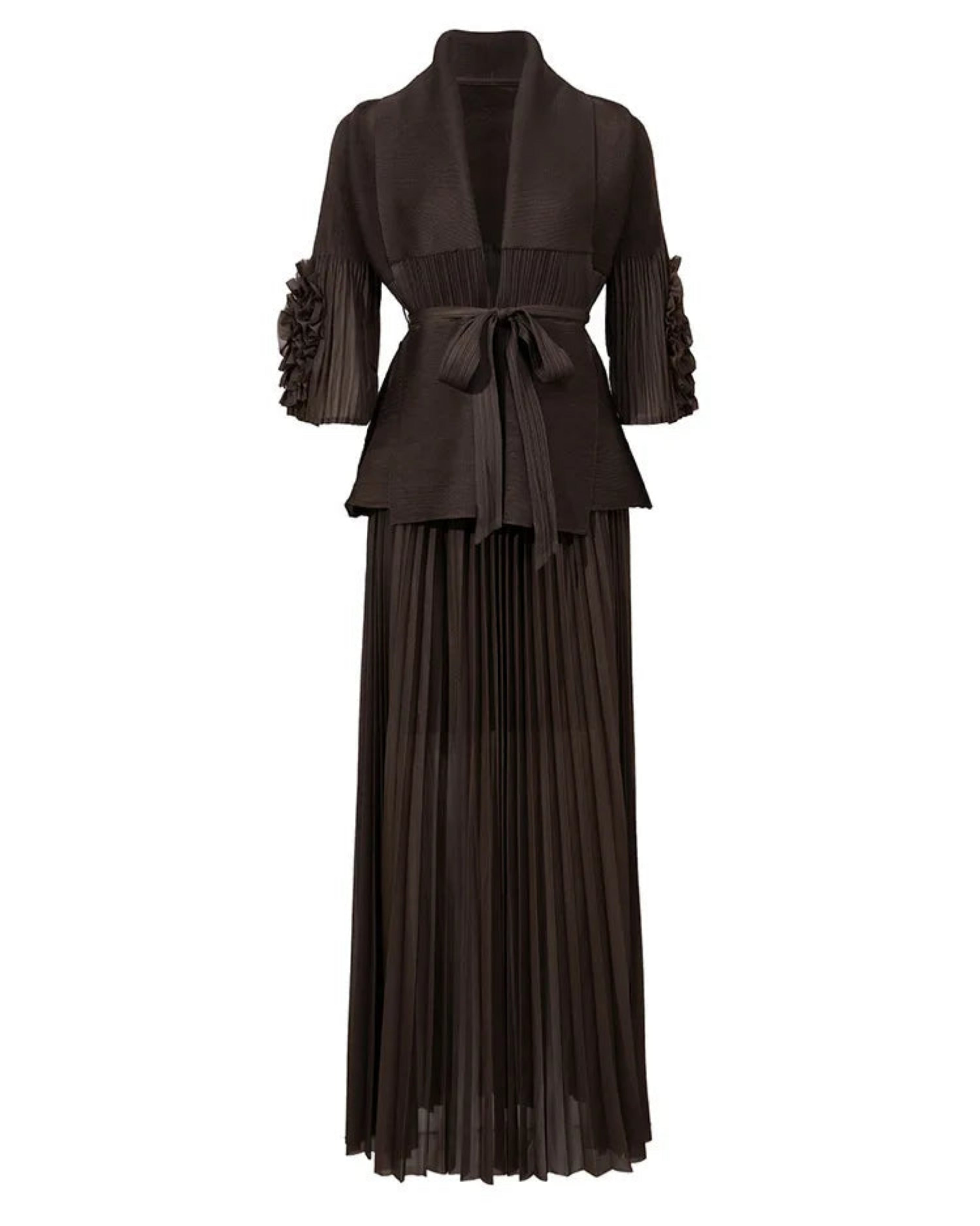 This luxurious two-piece set pairs premium Japanese pleats with a unique, flowing silhouette.