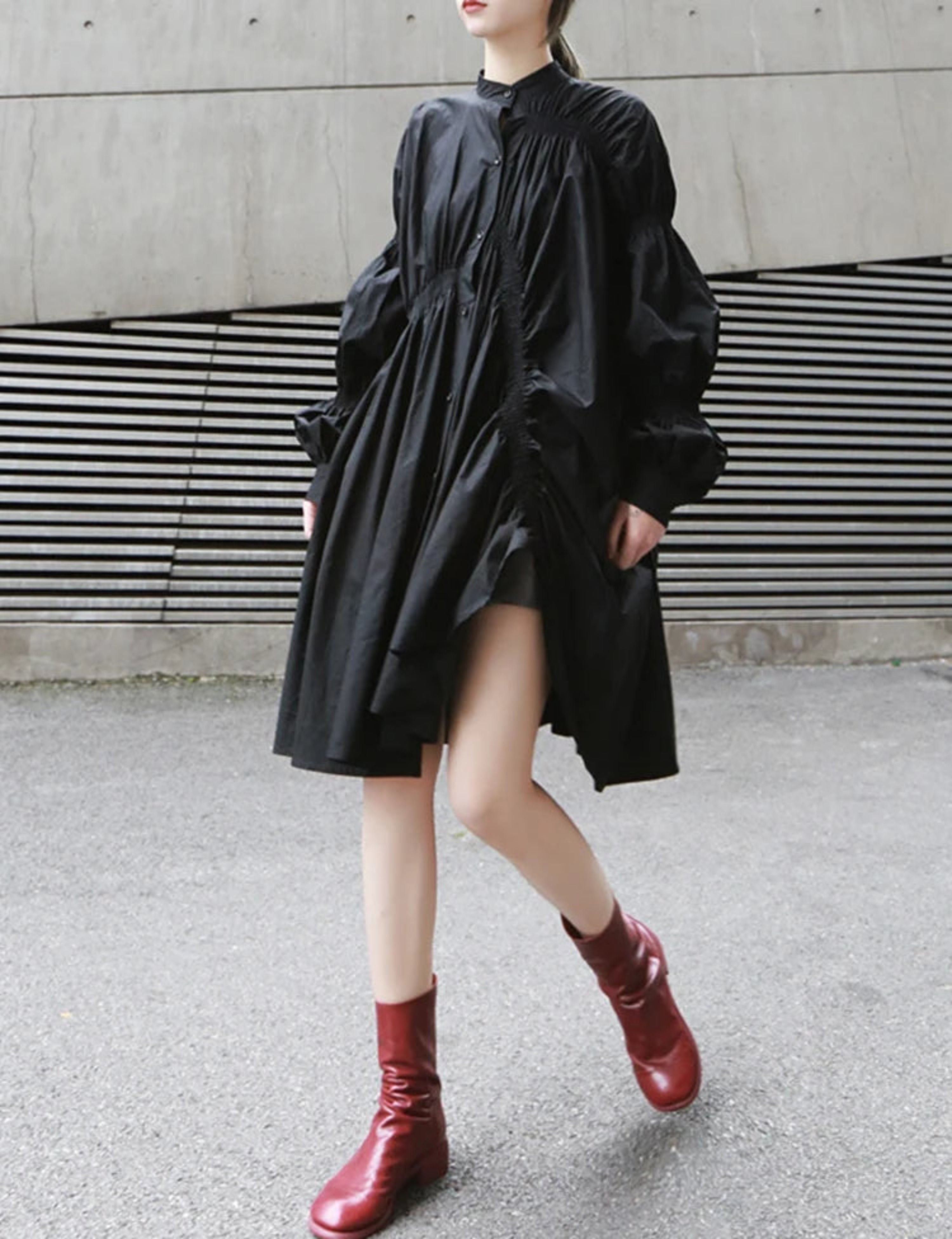 The flowing, loose-fit silhouette can be styled as a long blouse, a chic mini shirtdress, or polished business casual. Its refined, avant-garde design exudes sophistication and unique statement style for formal events, travel, or elevated everyday wear.