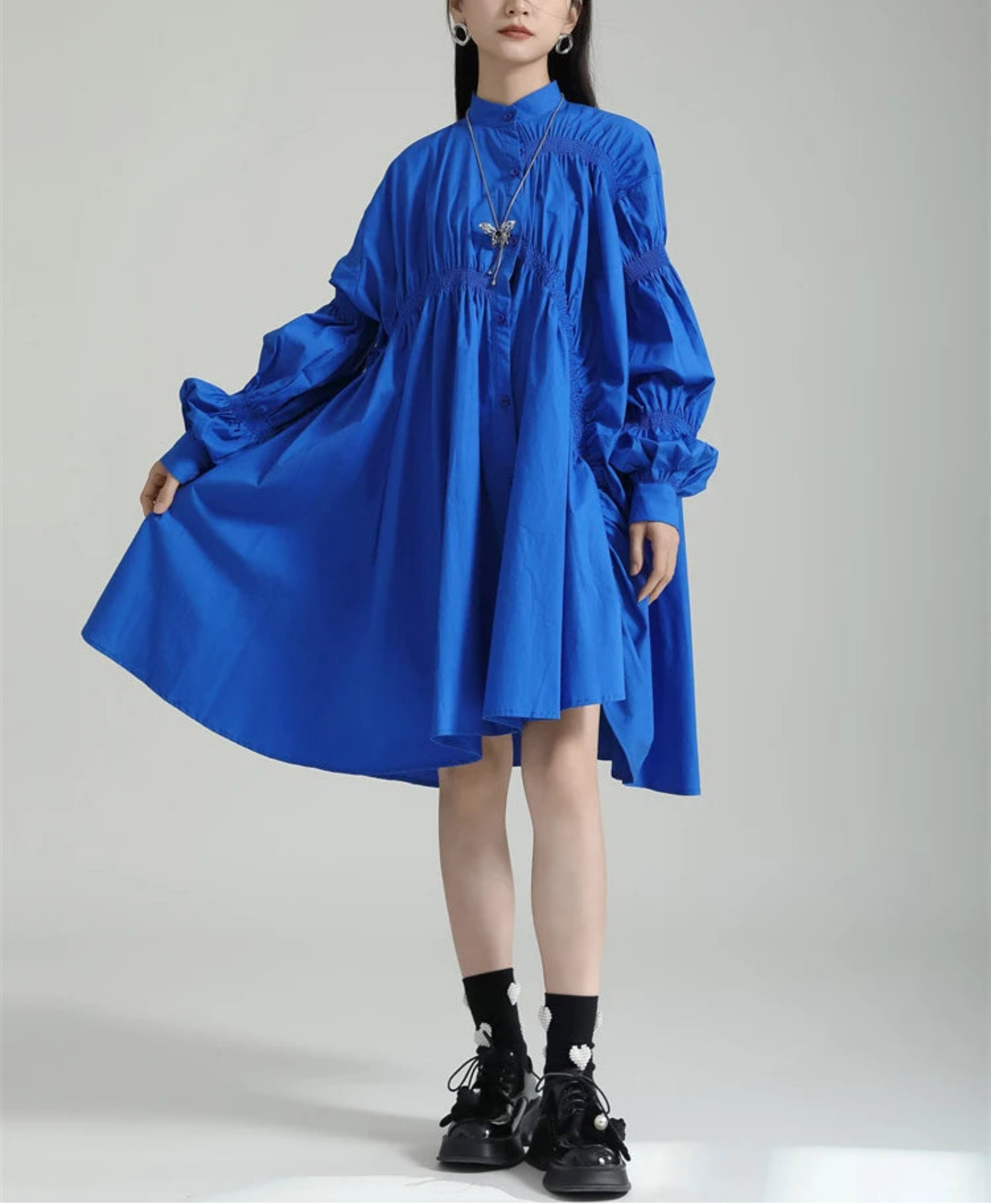 This elegant blouse shirtdress features dramatic voluminous sleeves, a band collar, and a button-front placket.