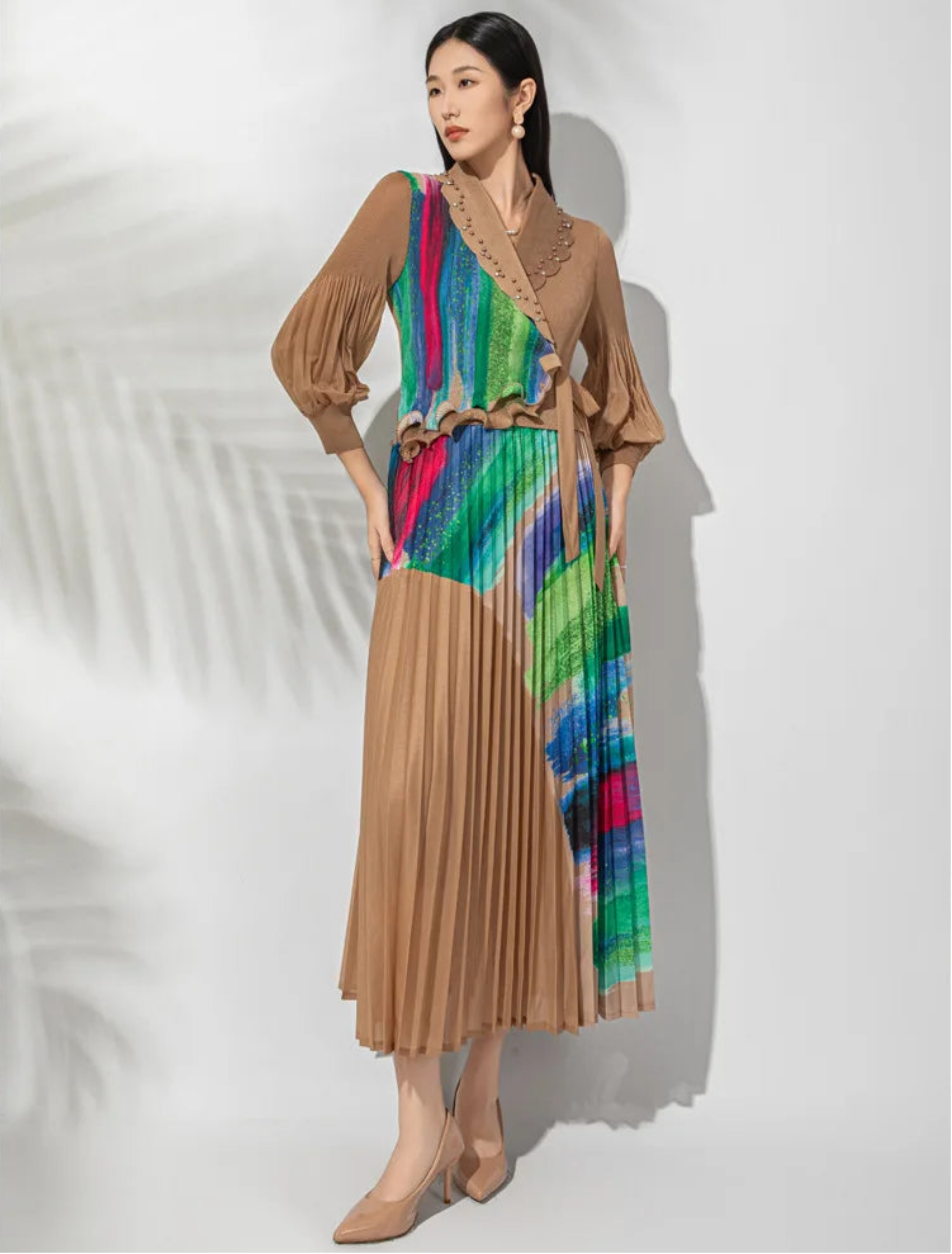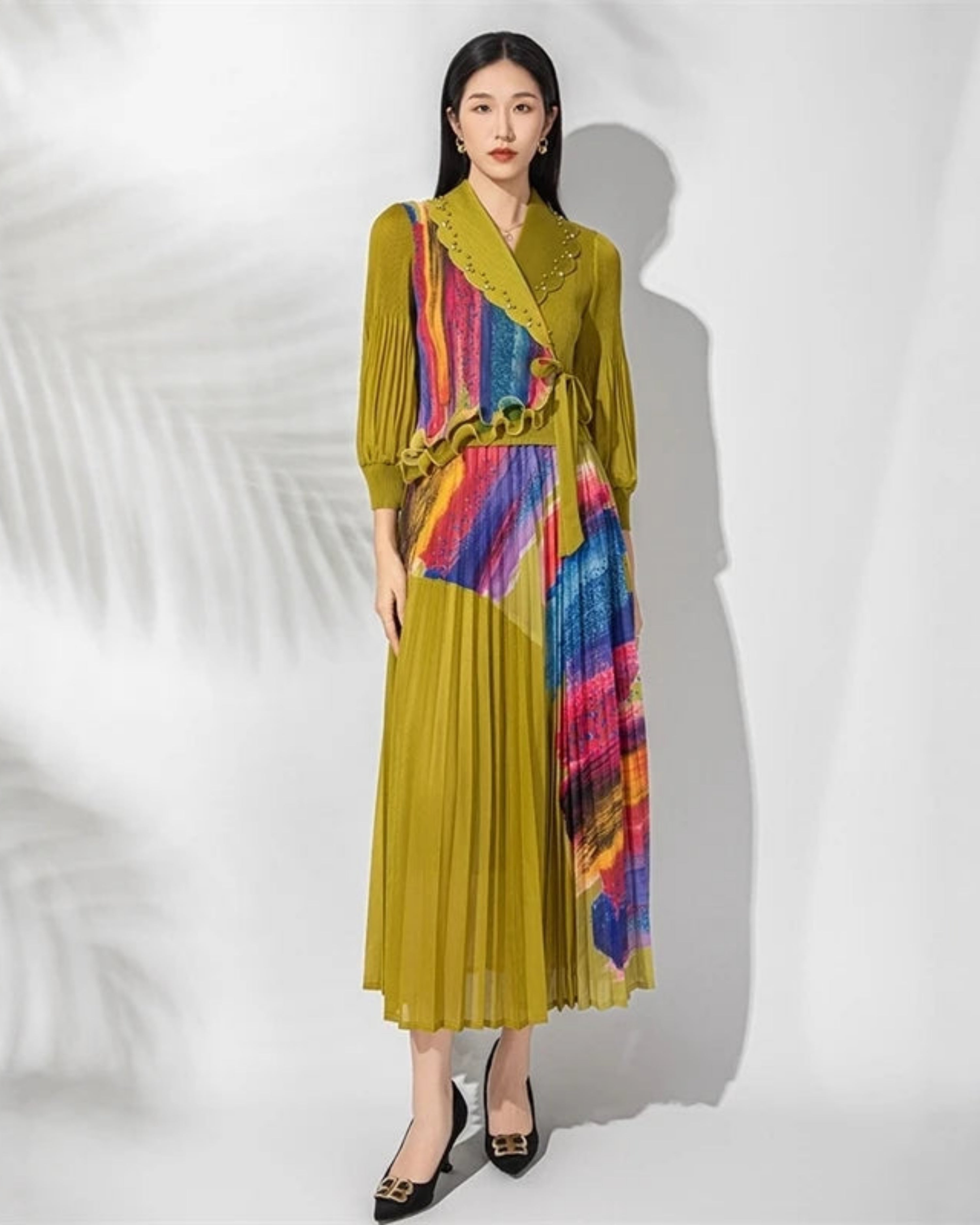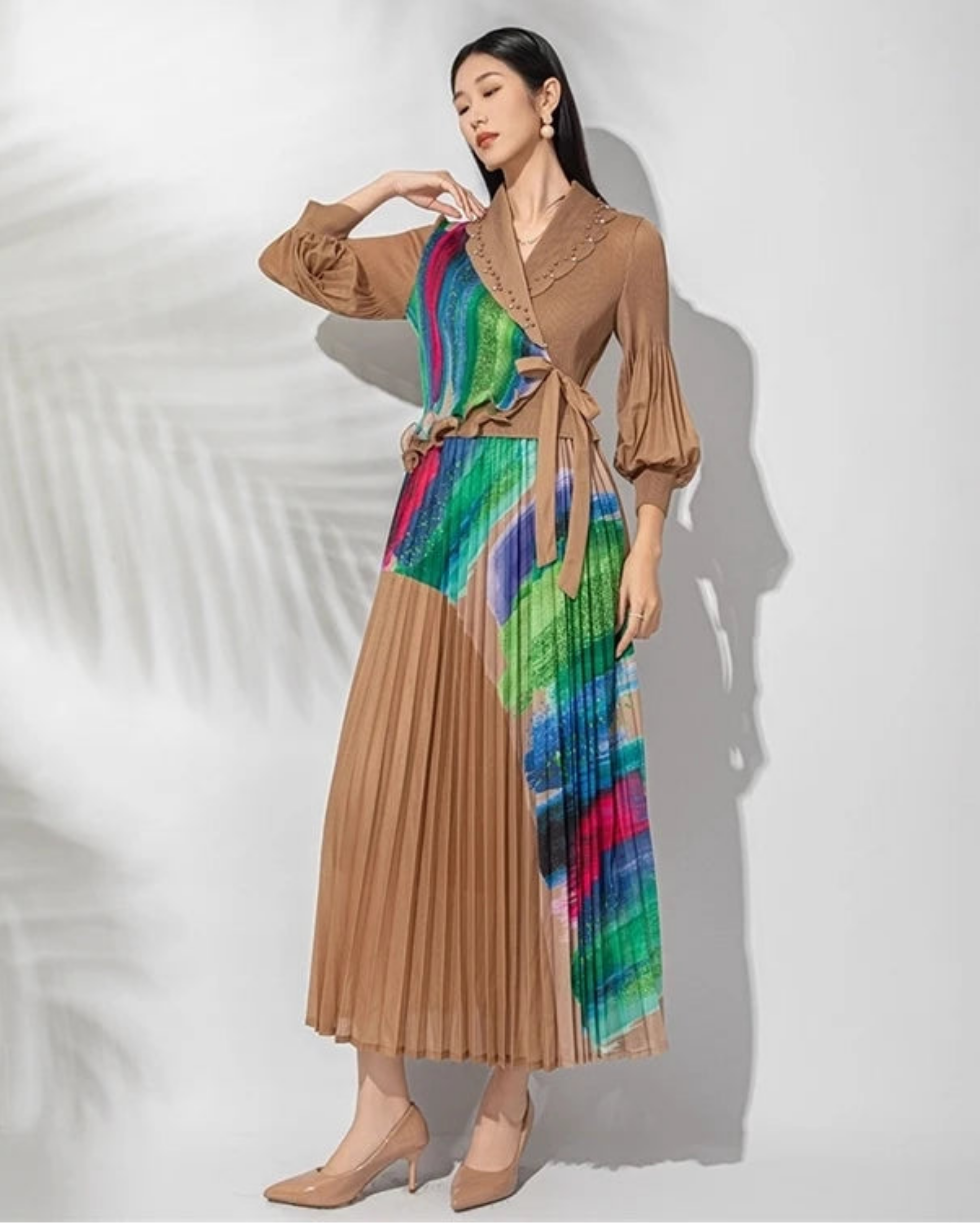 Mixed textures, fine pleating, and gathered cuffed sleeves add beautiful movement and shape. Stretchy, wrinkle-resistant, and no ironing needed, it’s perfect for everyday wear, travel, formal events, vacations, resorts, and cruise evenings.
