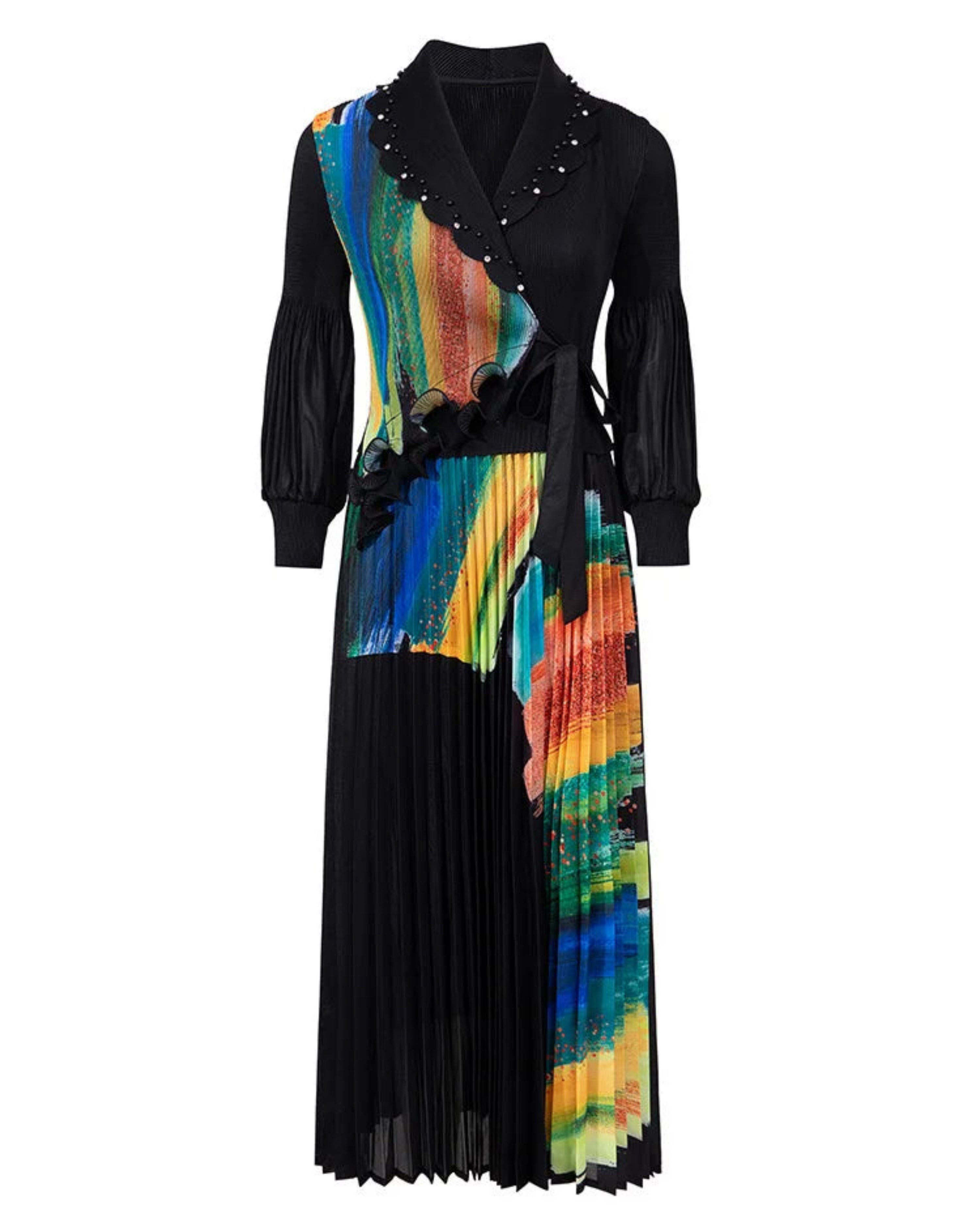 This brand new wrap midi dress features a notched collar, a self-tie waist, and flowing Japanese micro-pleats for a luxurious, stylish look.