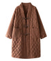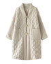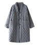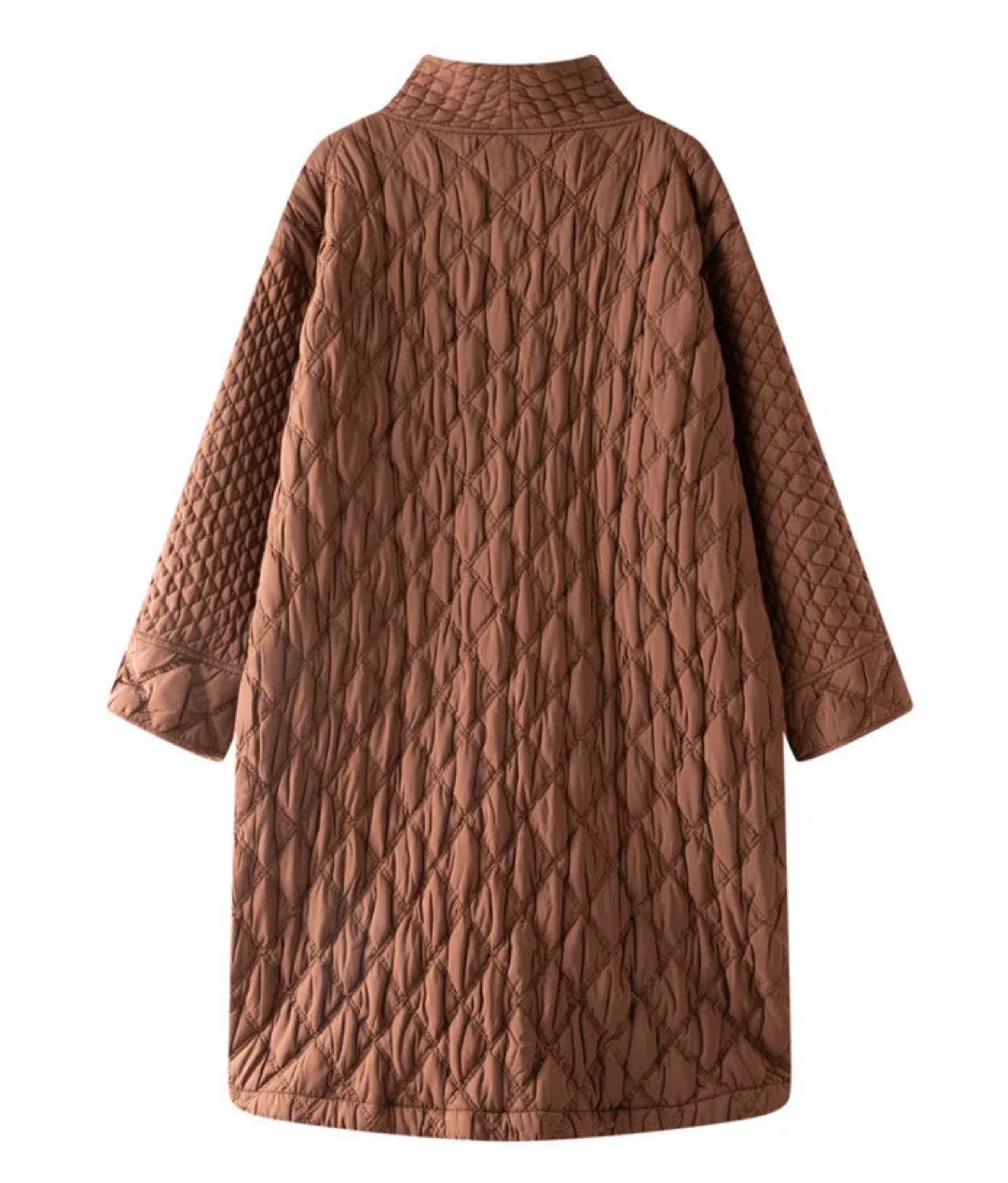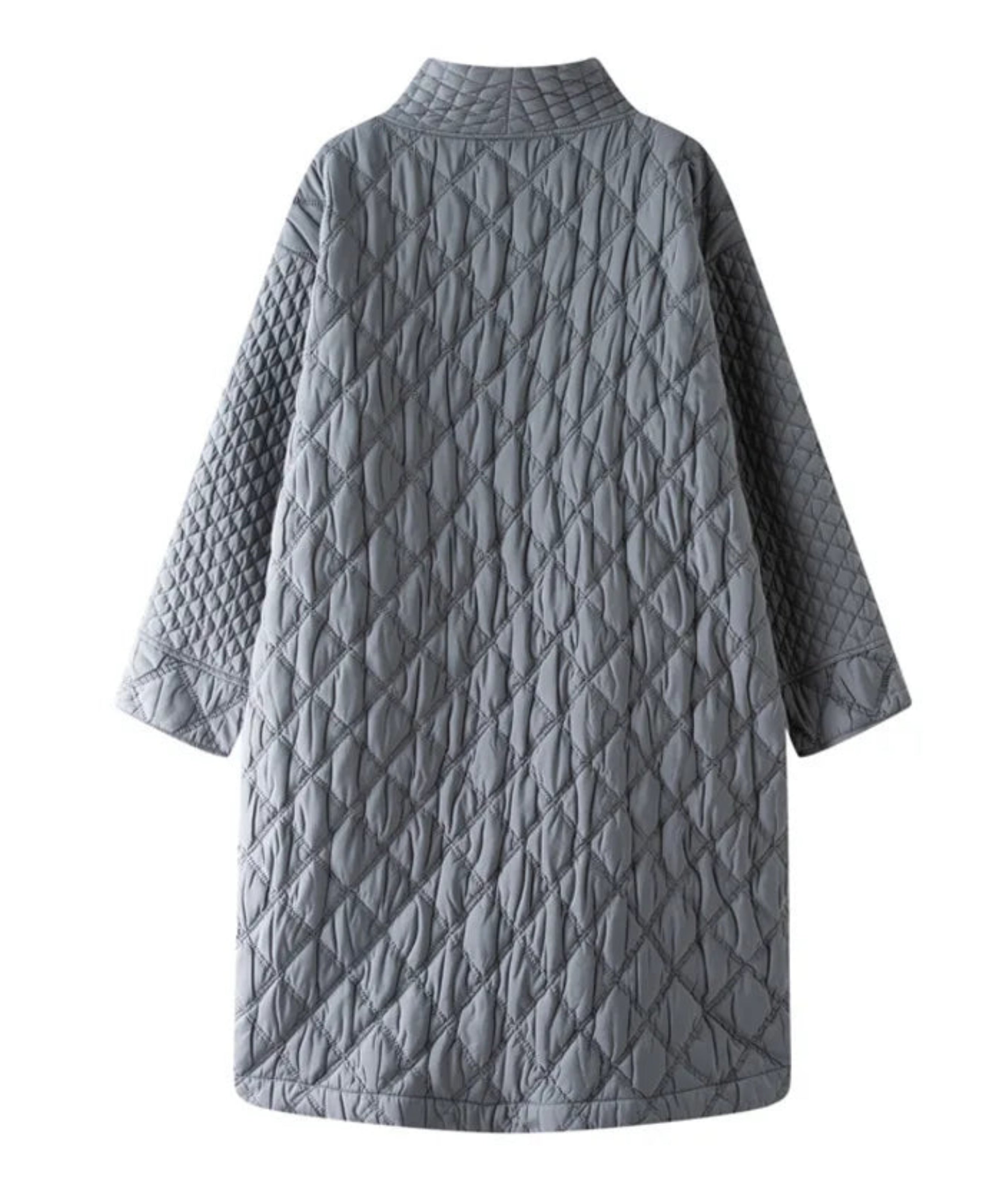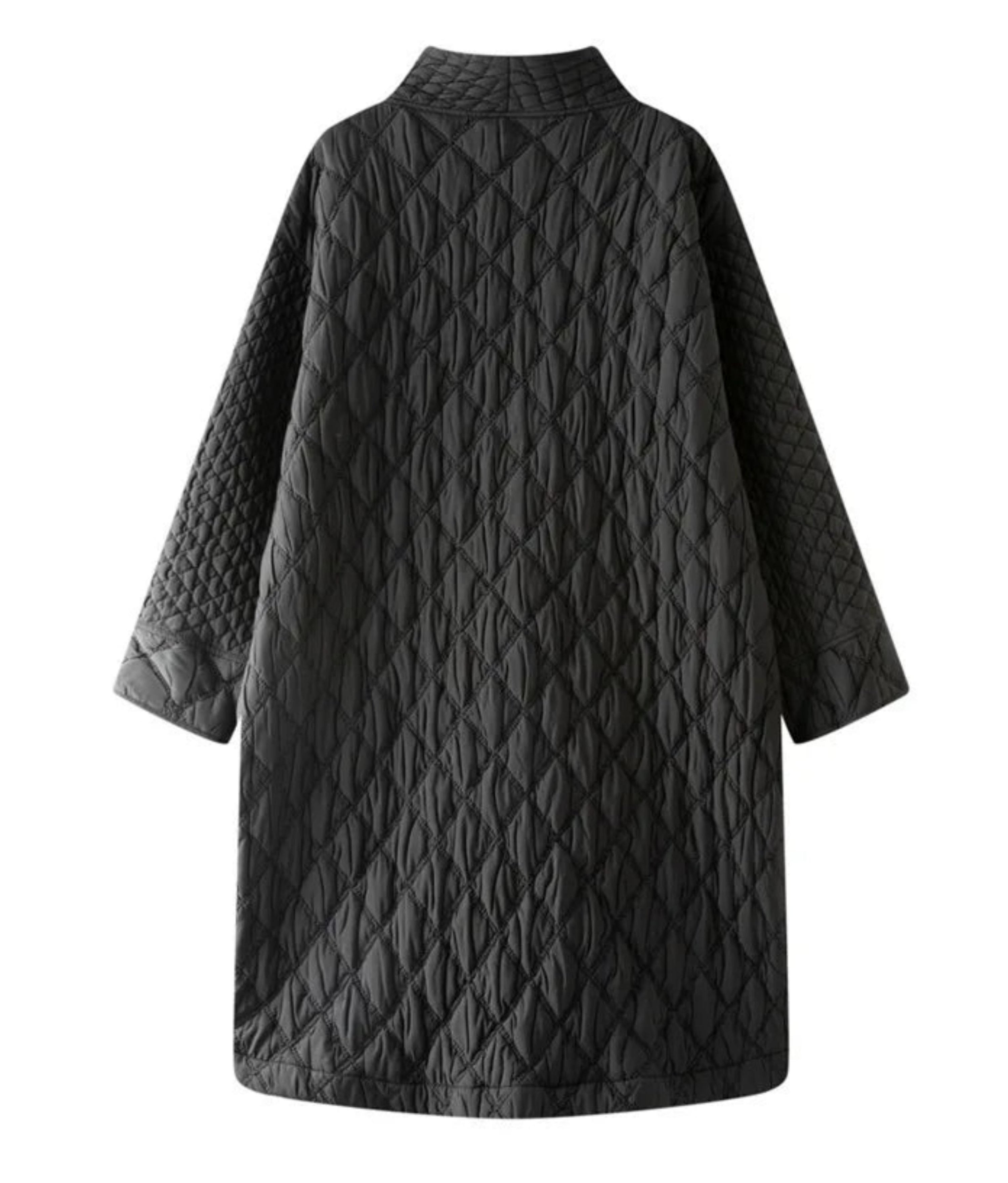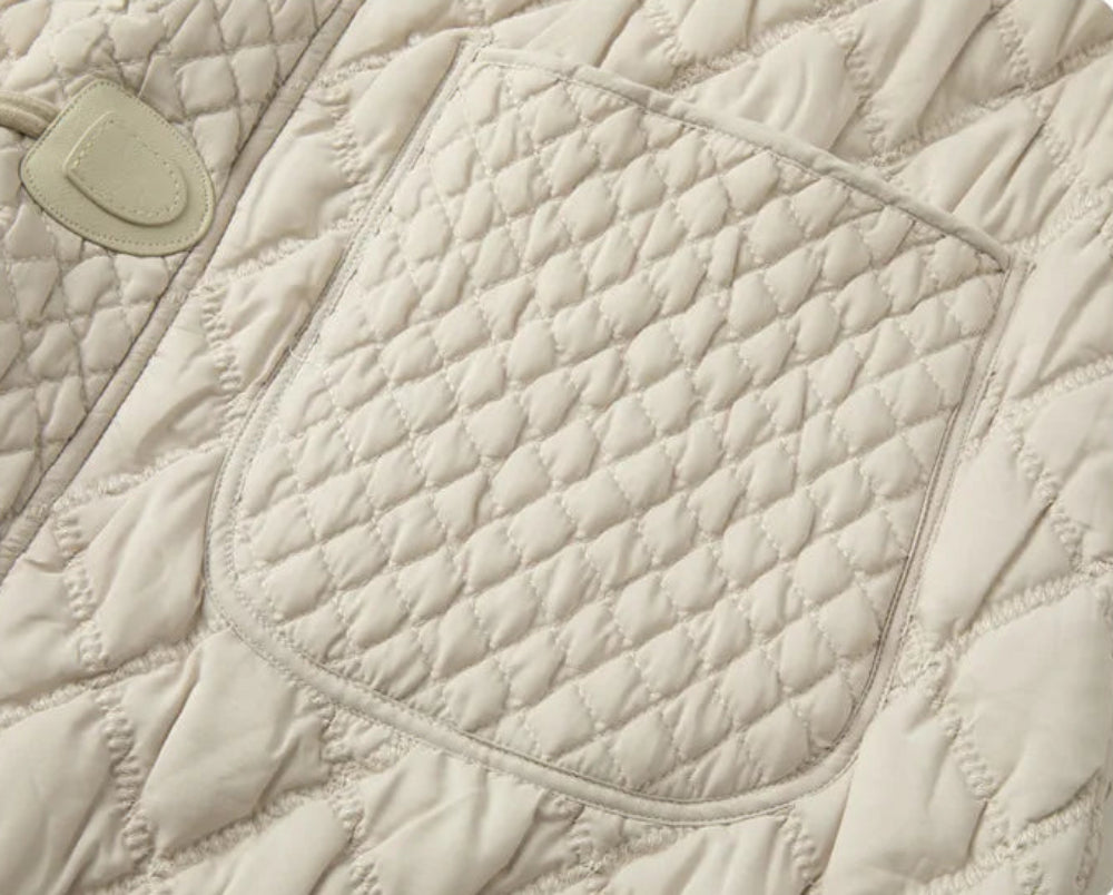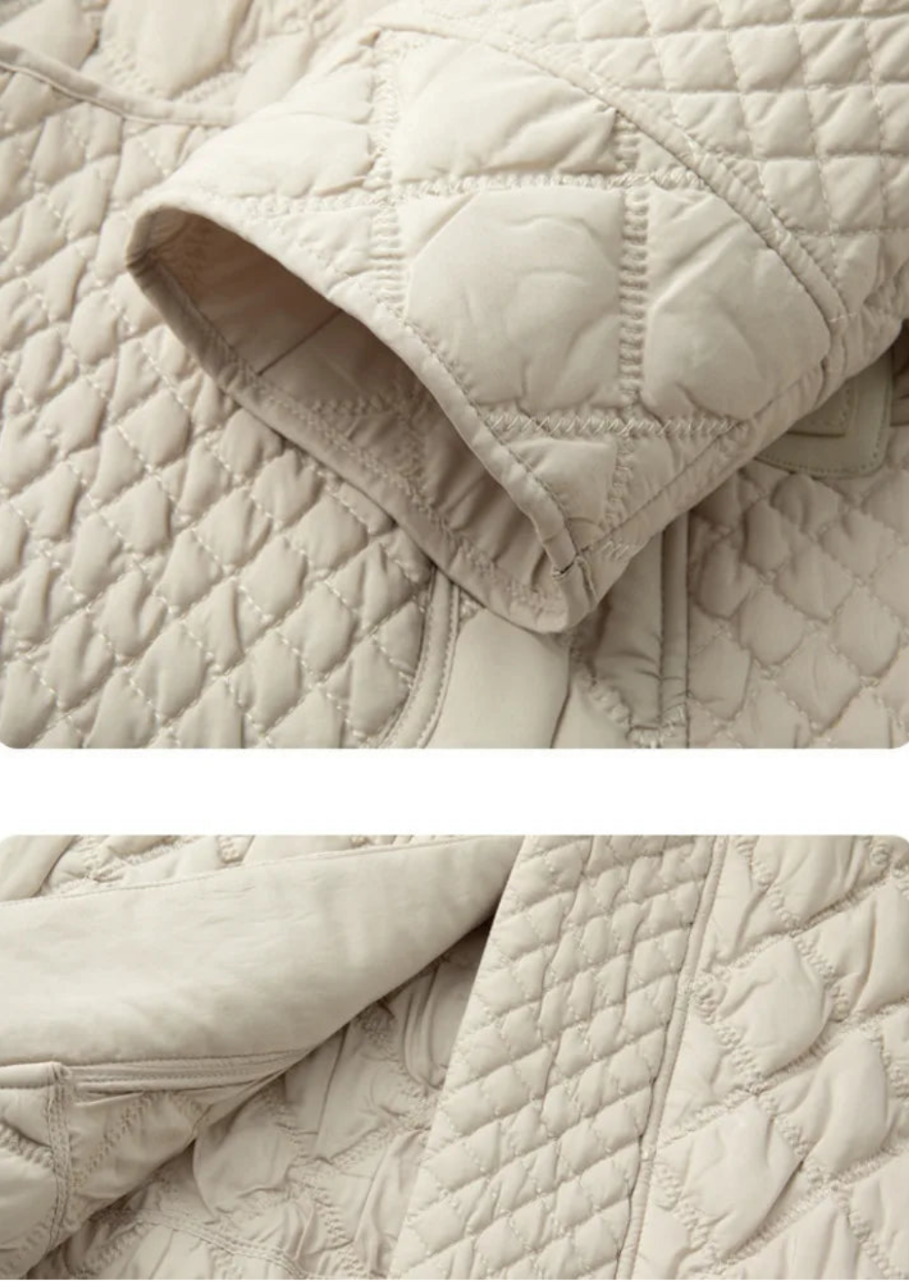 This collarless, elegant quilted coat features premium Japanese pleats, designed for women seeking comfortable, stylish daily wear or travel without bulk.