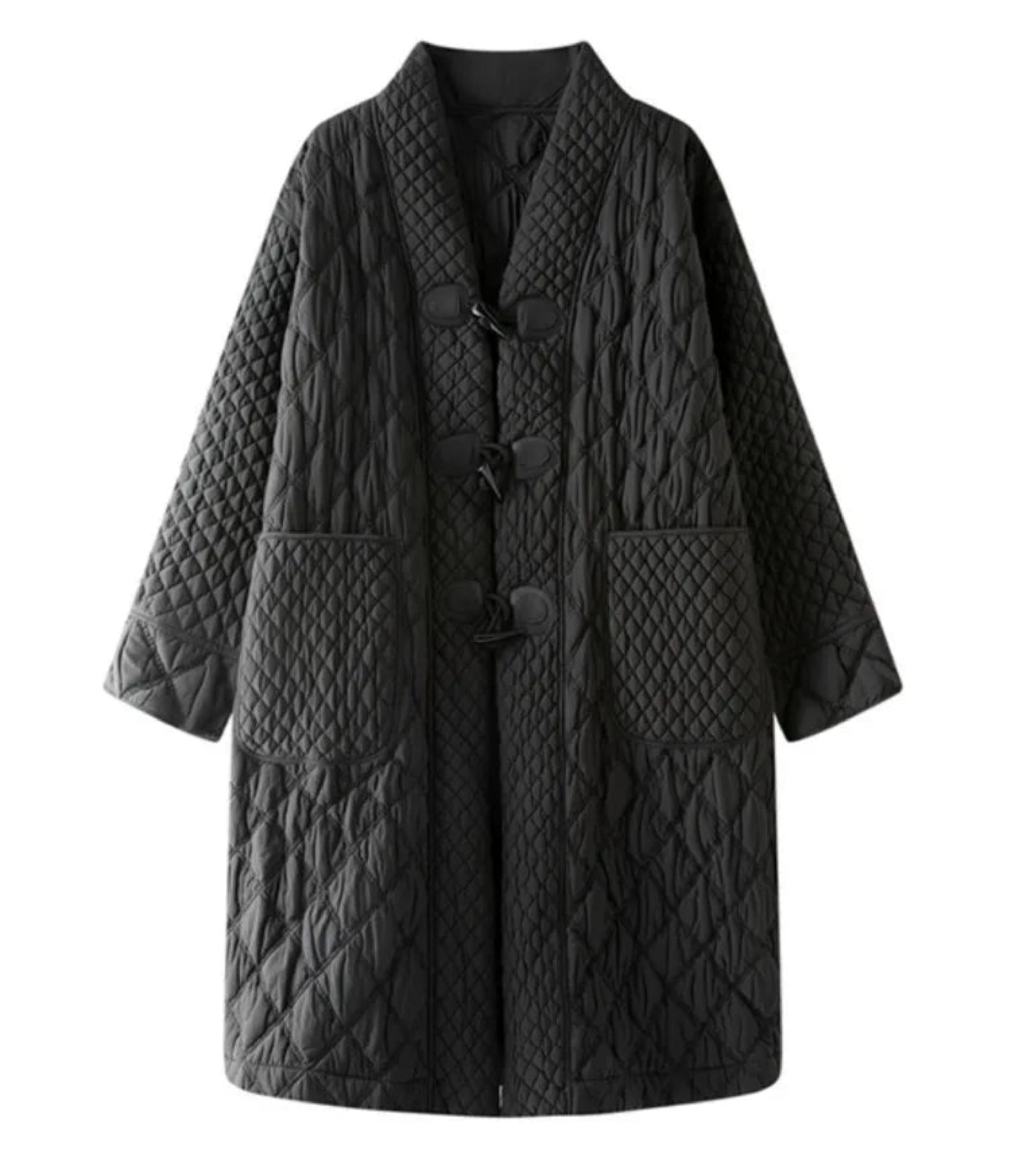 The three ornate frog closures and large patch pockets add style and function, while long quilted sleeves and a true mid-length cut provide warmth with a polished, luxurious silhouette.