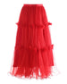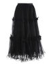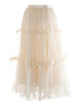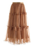 This high-waisted maxi skirt features layered tulle that creates a flowing, ethereal silhouette. The elastic waistband and pull-on design ensure comfort and easy wear.