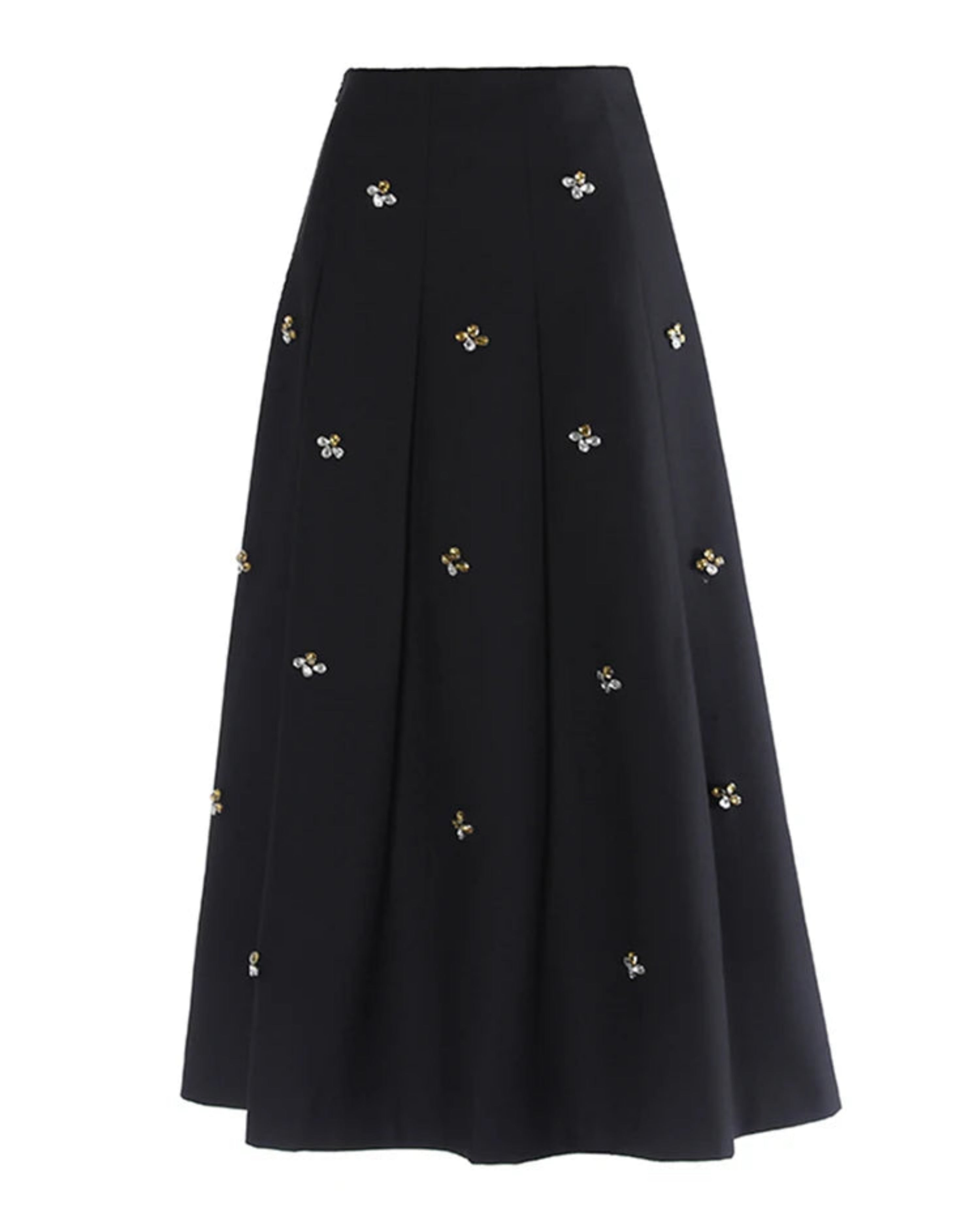 This high-waisted A-line maxi skirt features elegant pleats and delicate crystal and bead detailing for a sparkling, sophisticated look.