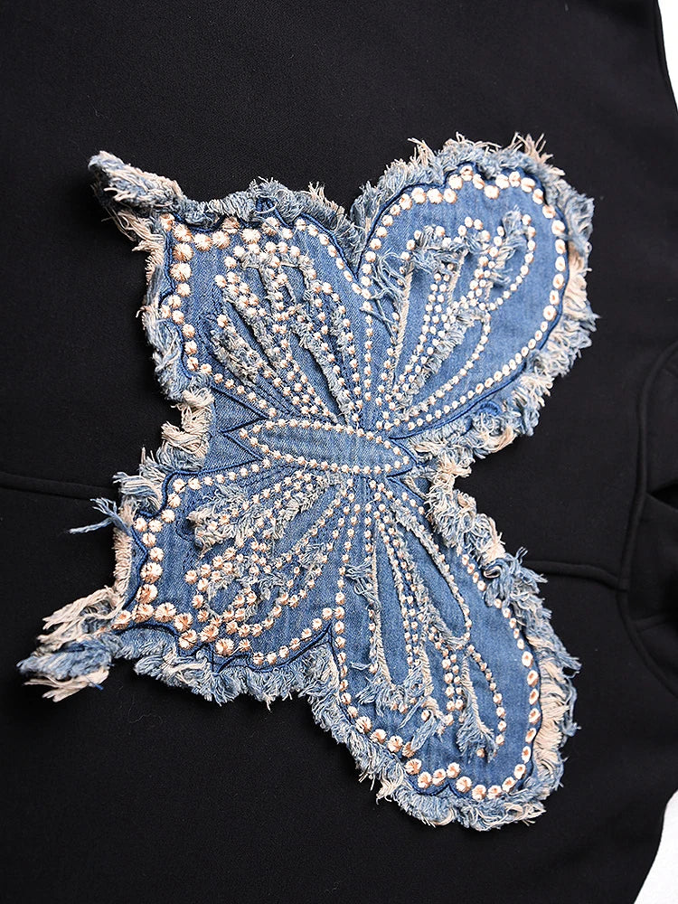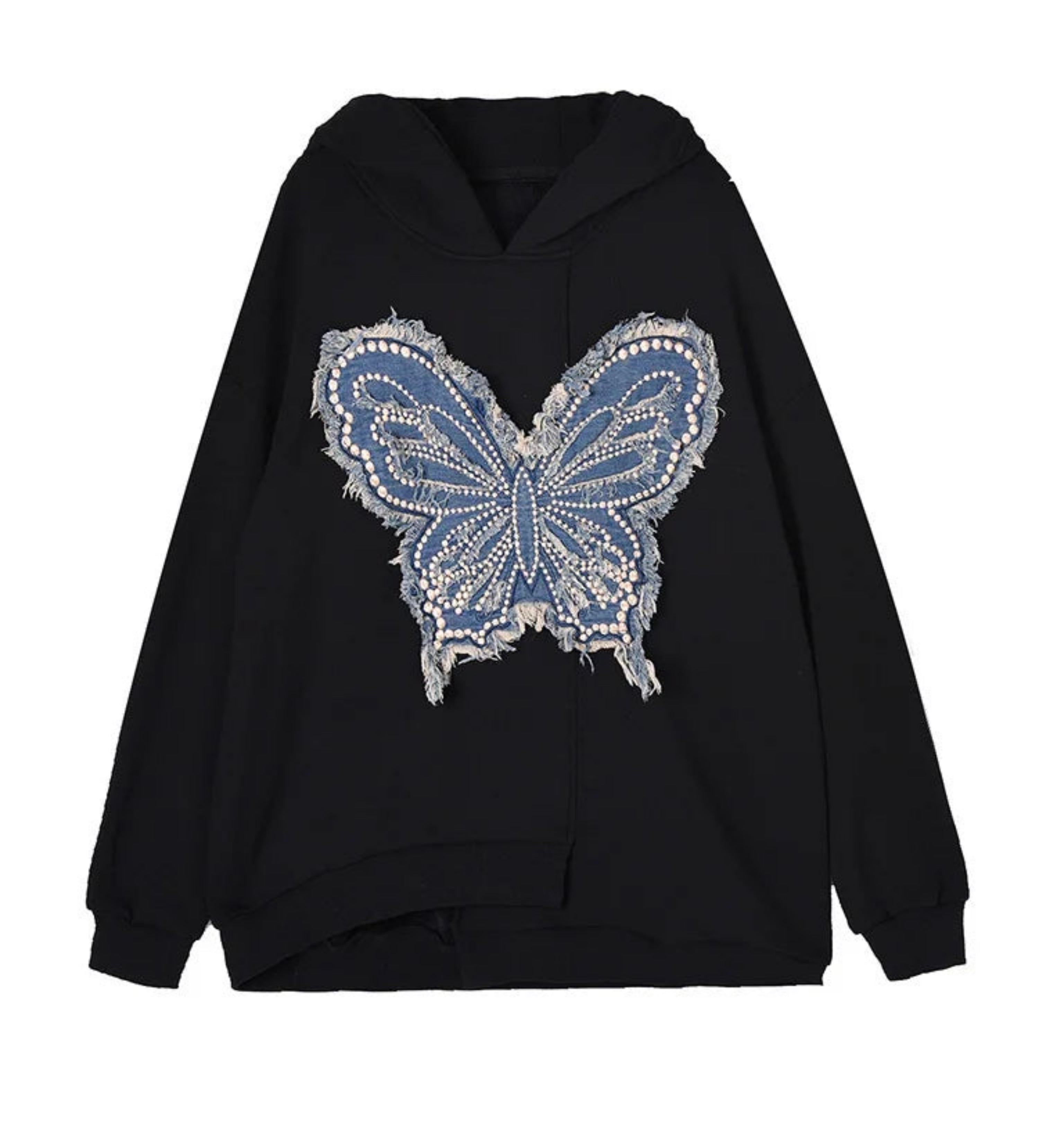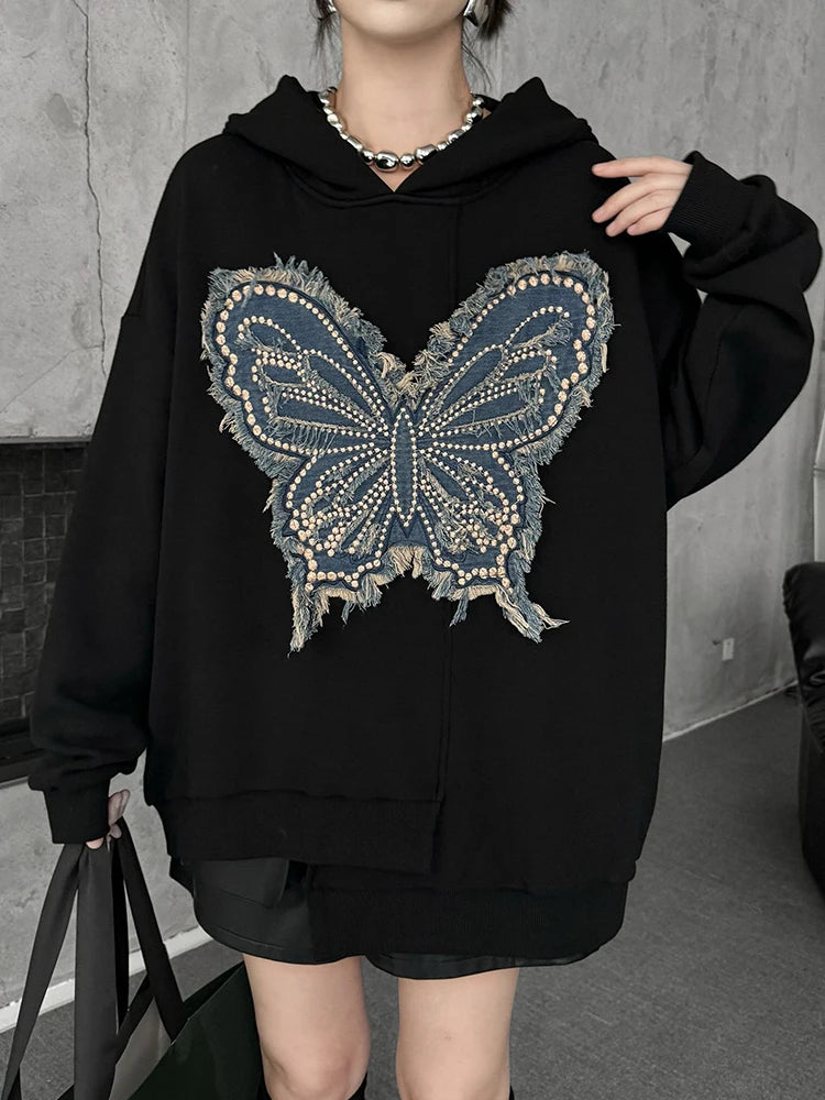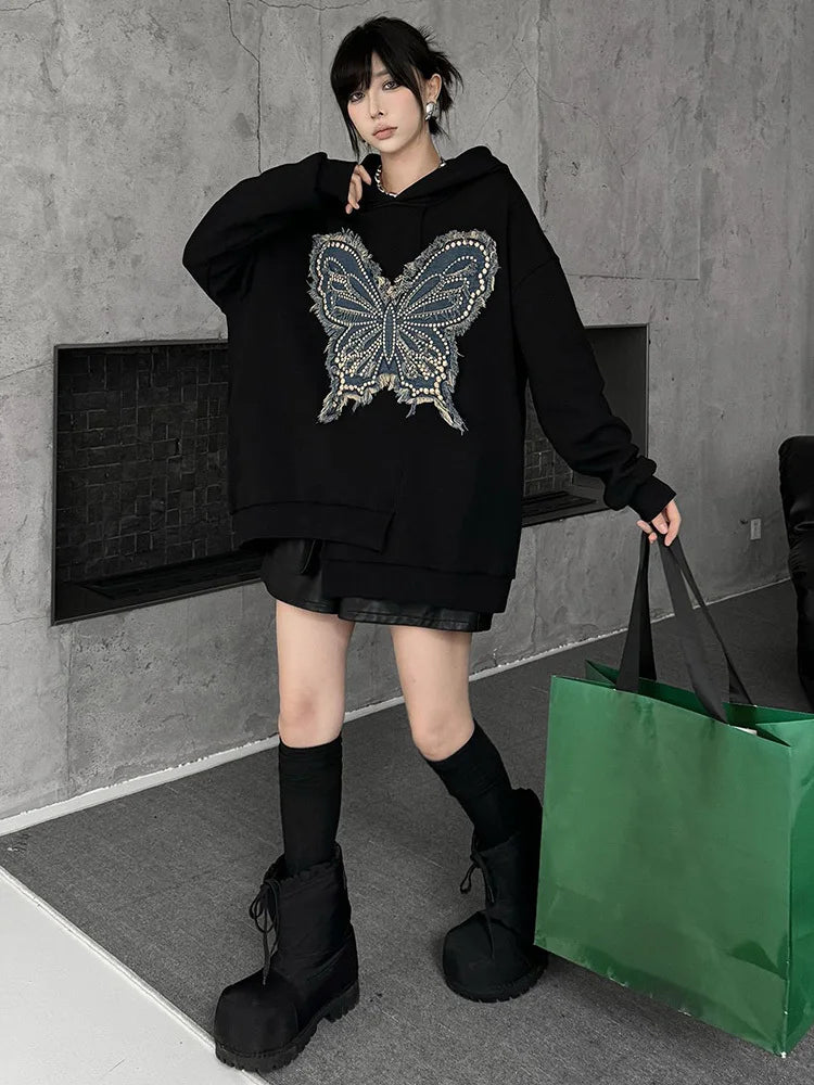 This luxury oversized streetwear hoodie features a relaxed, roomy fit with a distressed butterfly appliqué on the front.