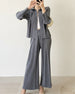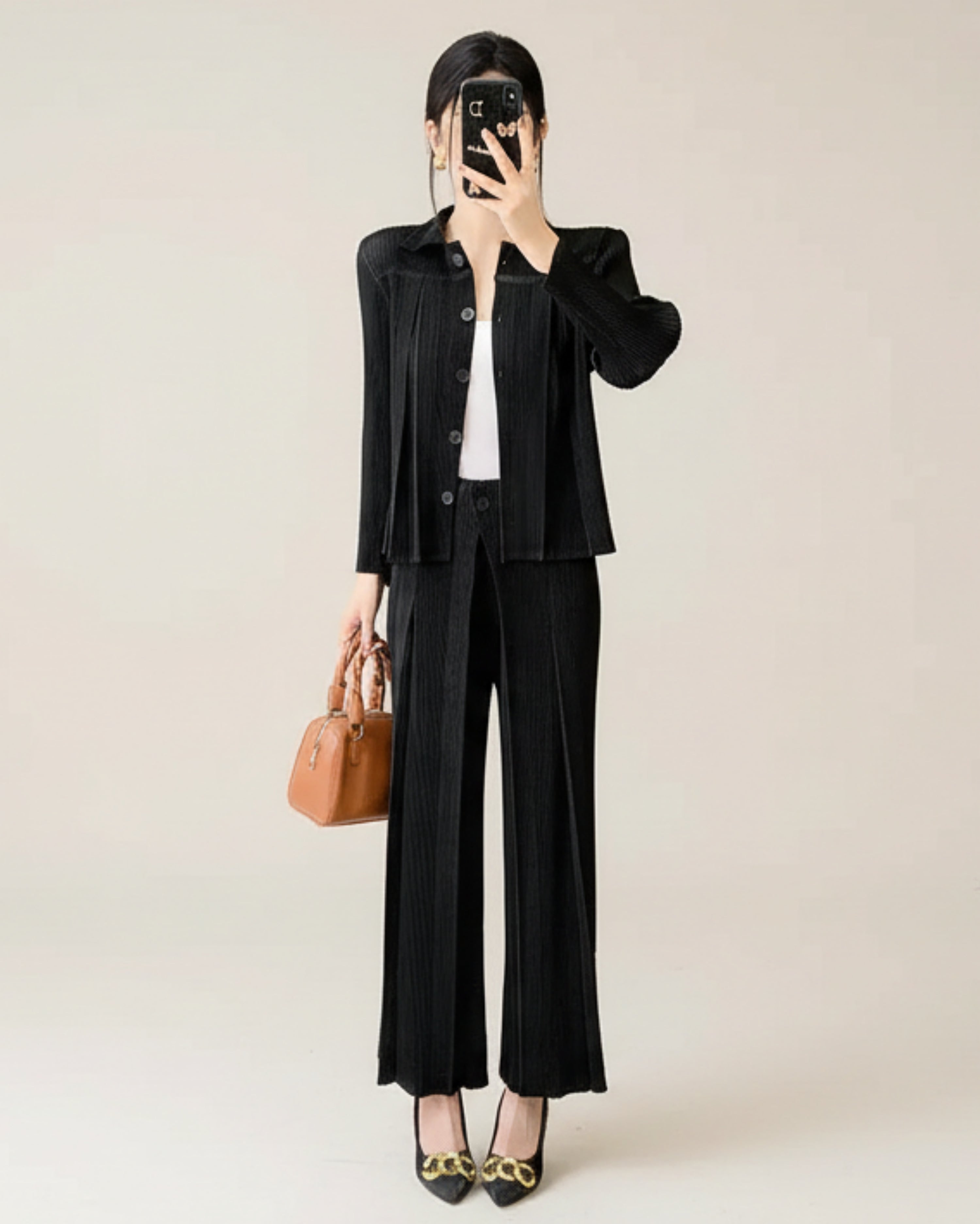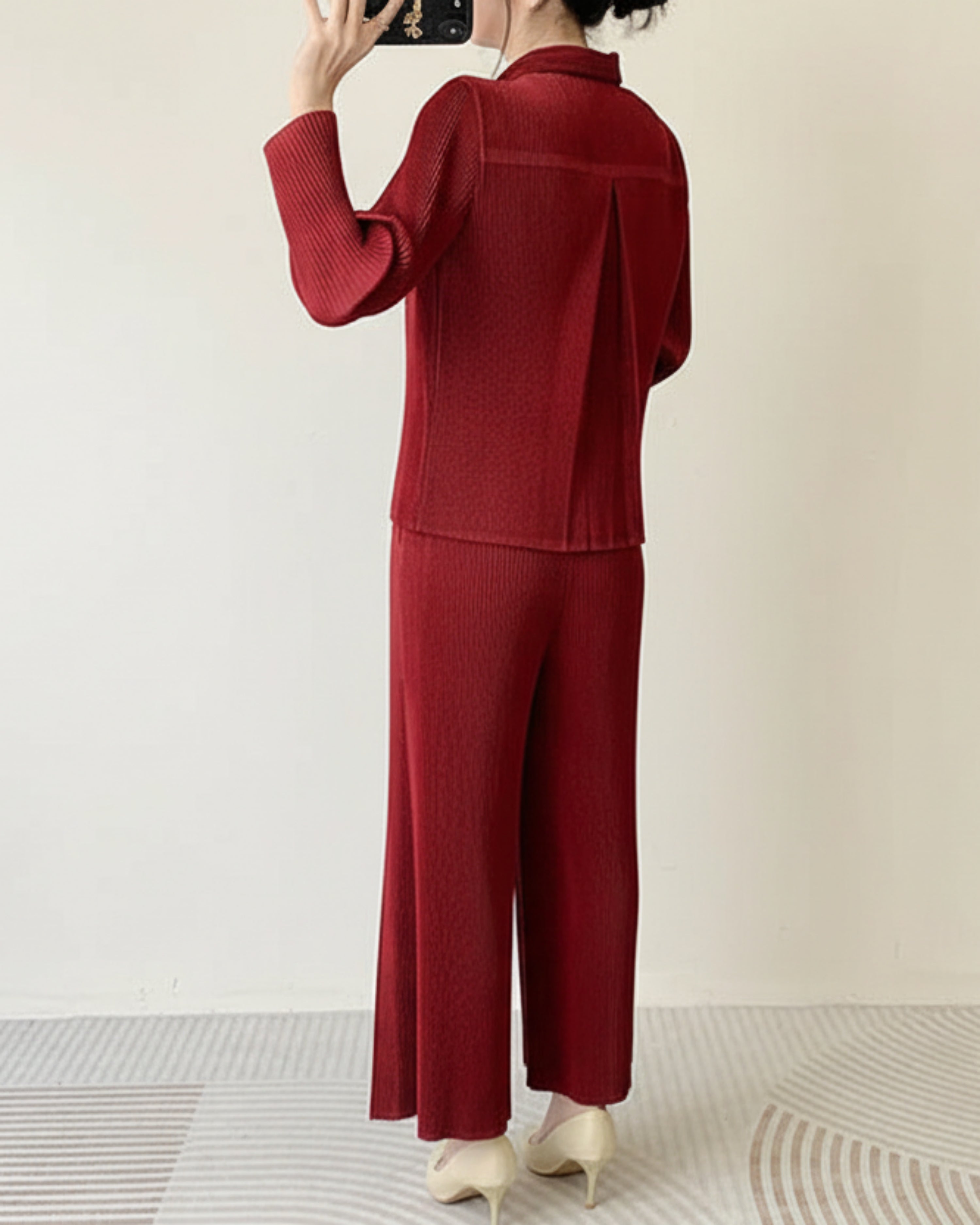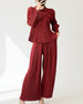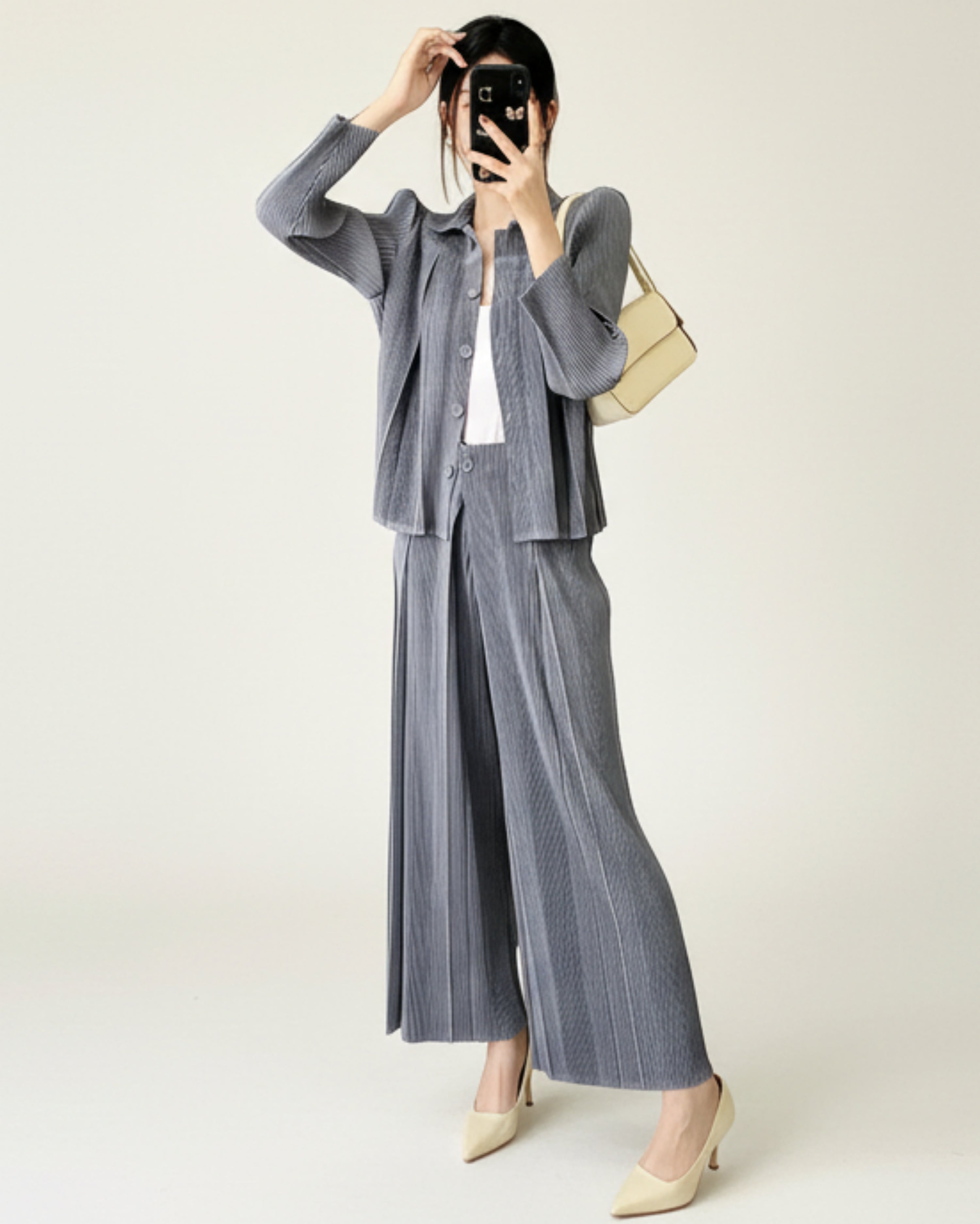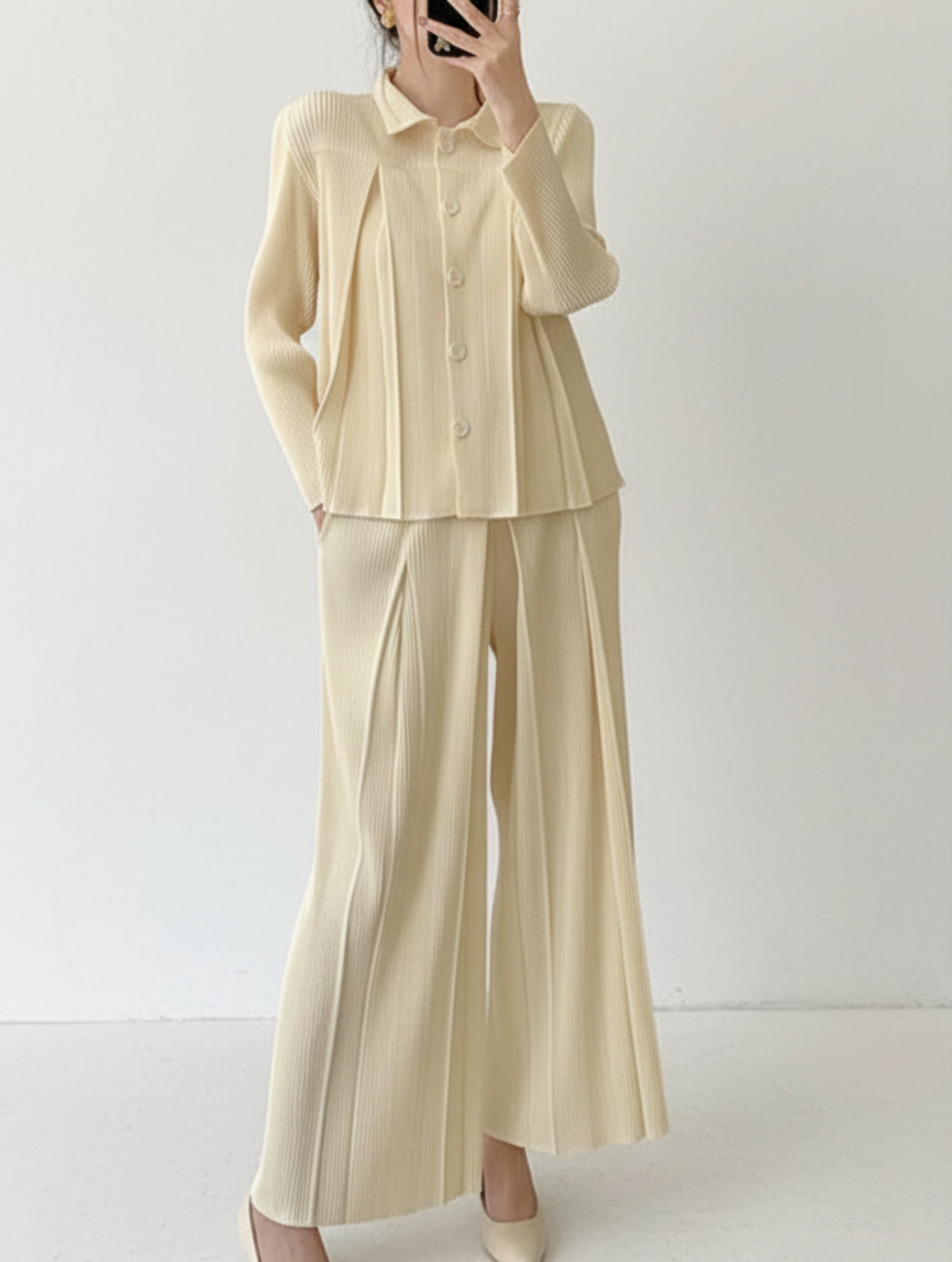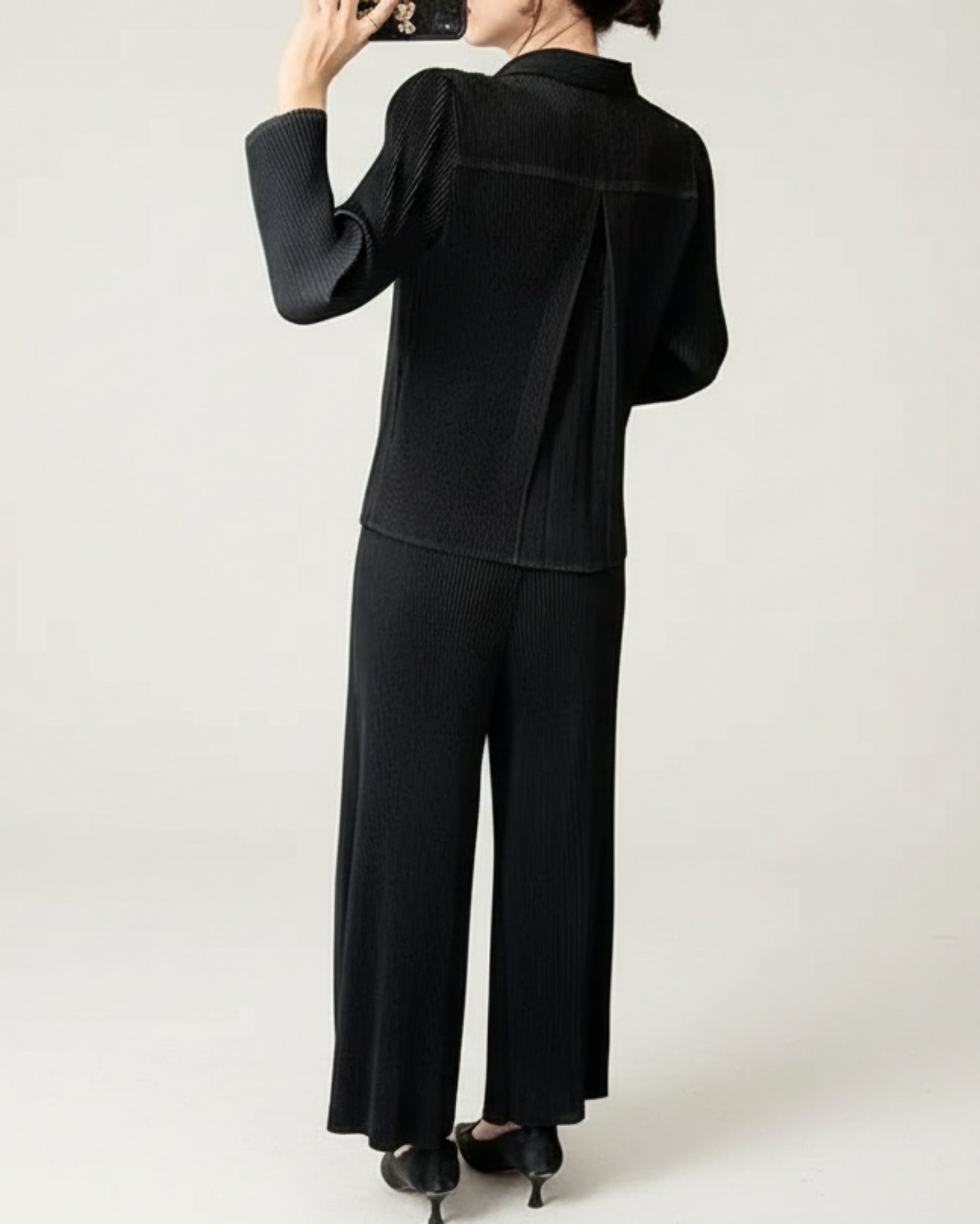 This luxurious two-piece Japanese plissé set pairs a micro-pleated long-sleeve blouse with matching wide-leg trousers for an elegant, versatile look across work, travel, formal, or casual days.