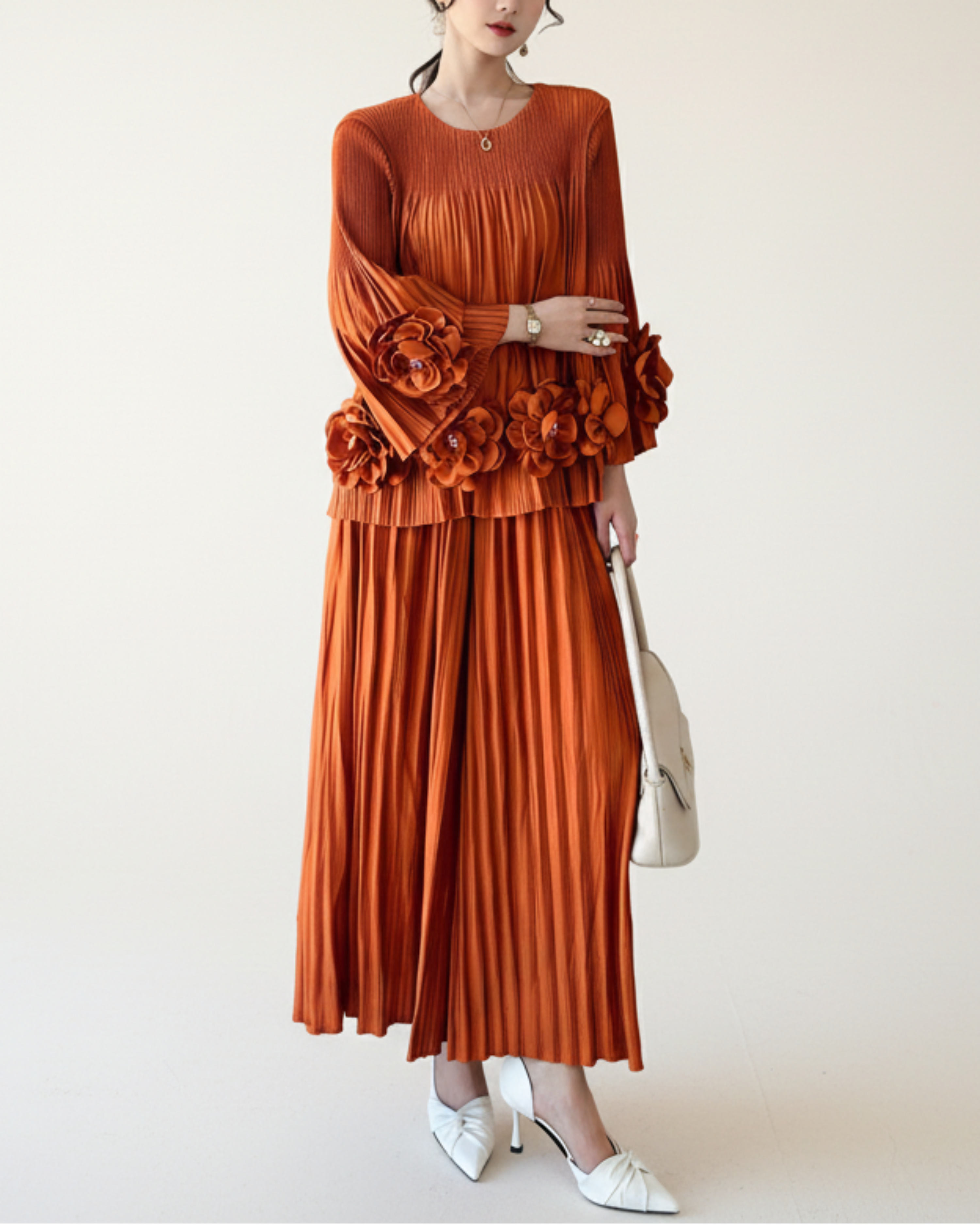 Designer-style plissé pleated two-piece matching set with a flowy top featuring luxurious 3D floral appliques on dramatic bell sleeves, paired with wide-leg loose trousers with an elastic waistband.