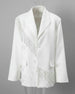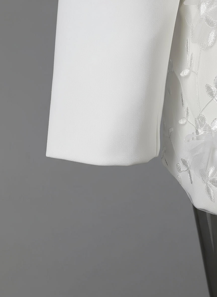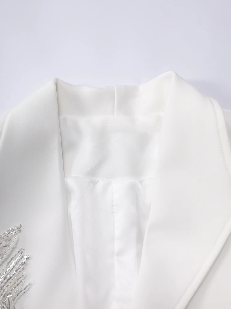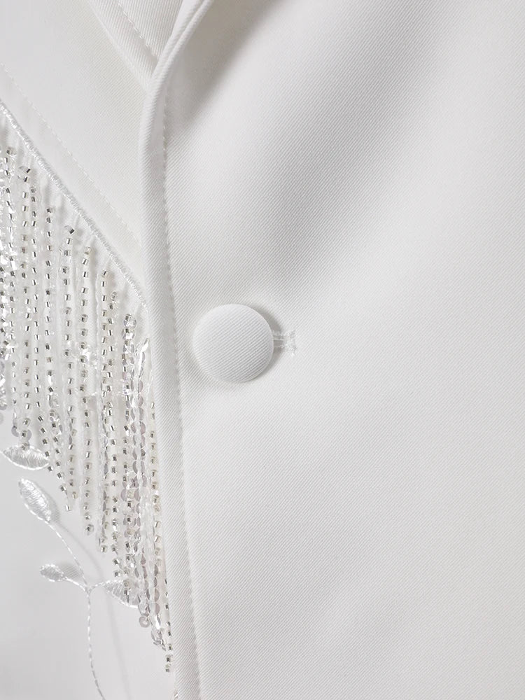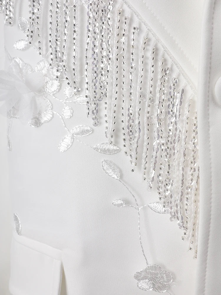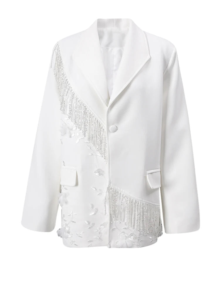 This oversized women’s blazer features intricate floral appliqué and cascading beaded fringe for a luxurious, dynamic effect.