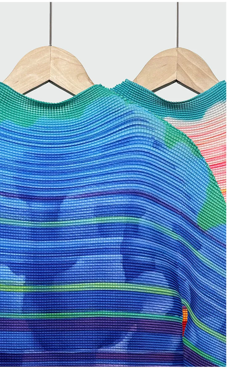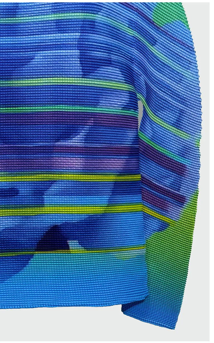This luxurious long-sleeve top features premium Japanese plissé with elegant floral prints and sculptural pleating.