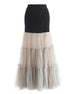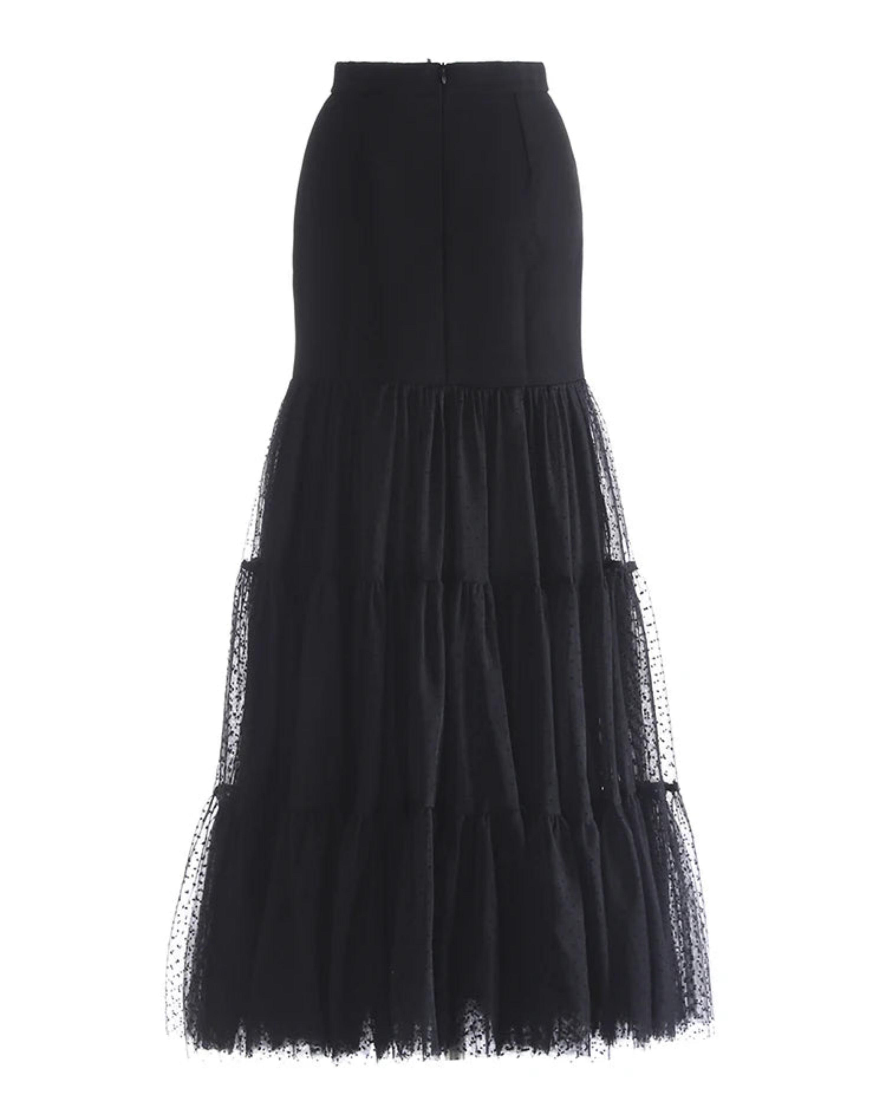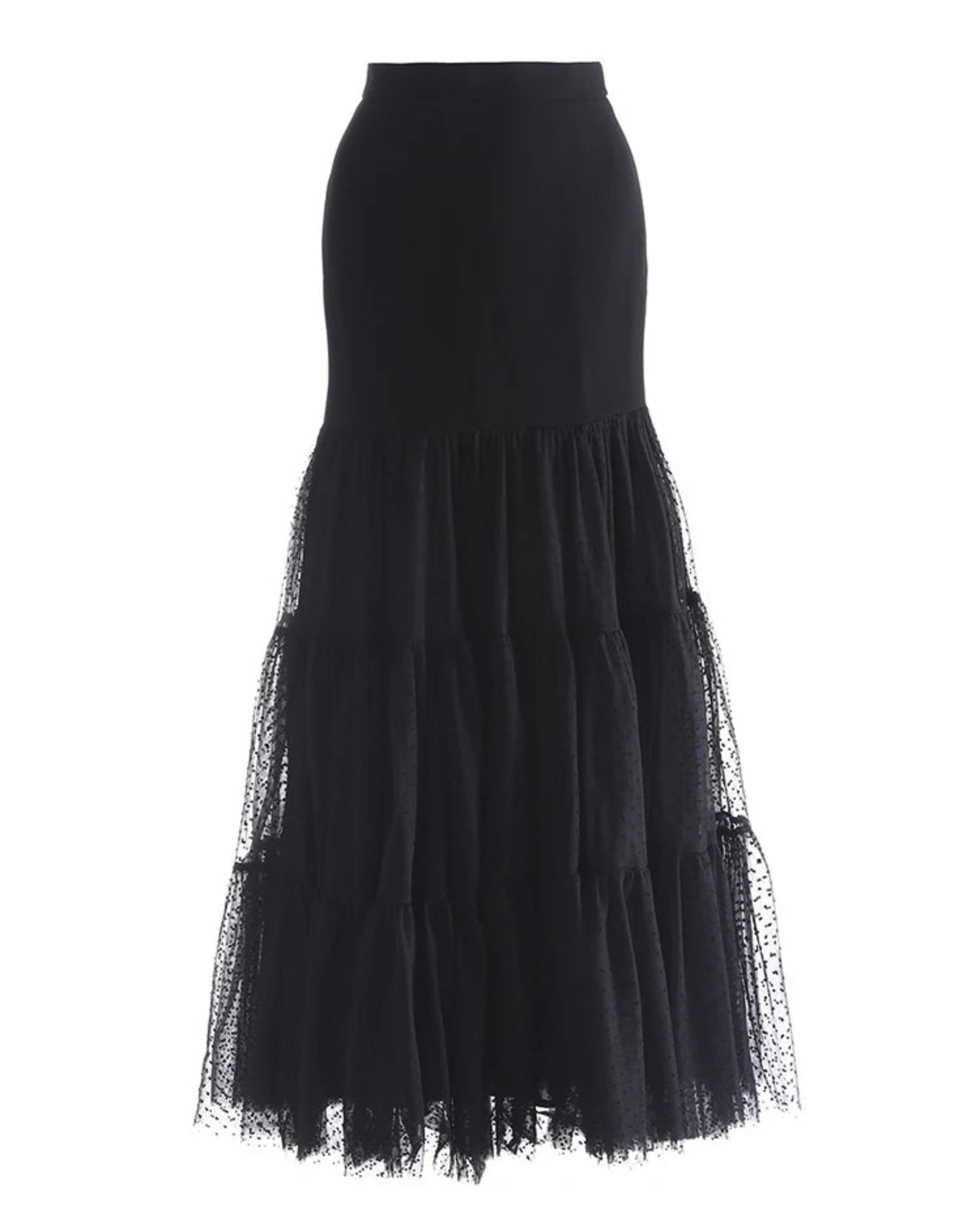 This luxurious midi-length skirt features a fitted waist and tiered, ruffled layers of sheer tulle.