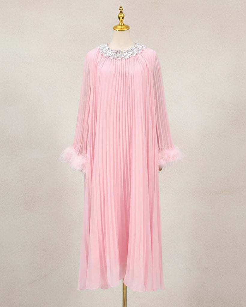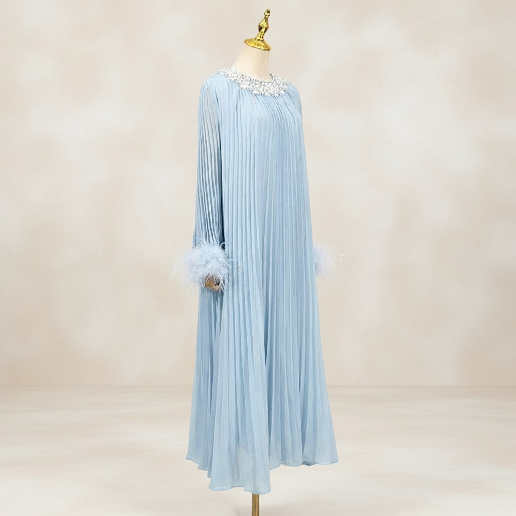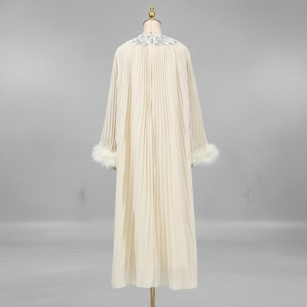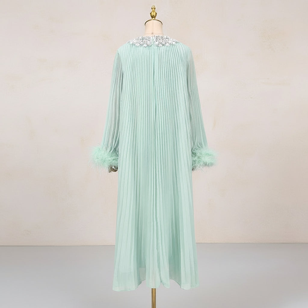 An elegant pleated plissé midi dress designed for special occasions. The round neckline features a sparkling rhinestone collar, while long sleeves finish with feather-trimmed cuffs.
