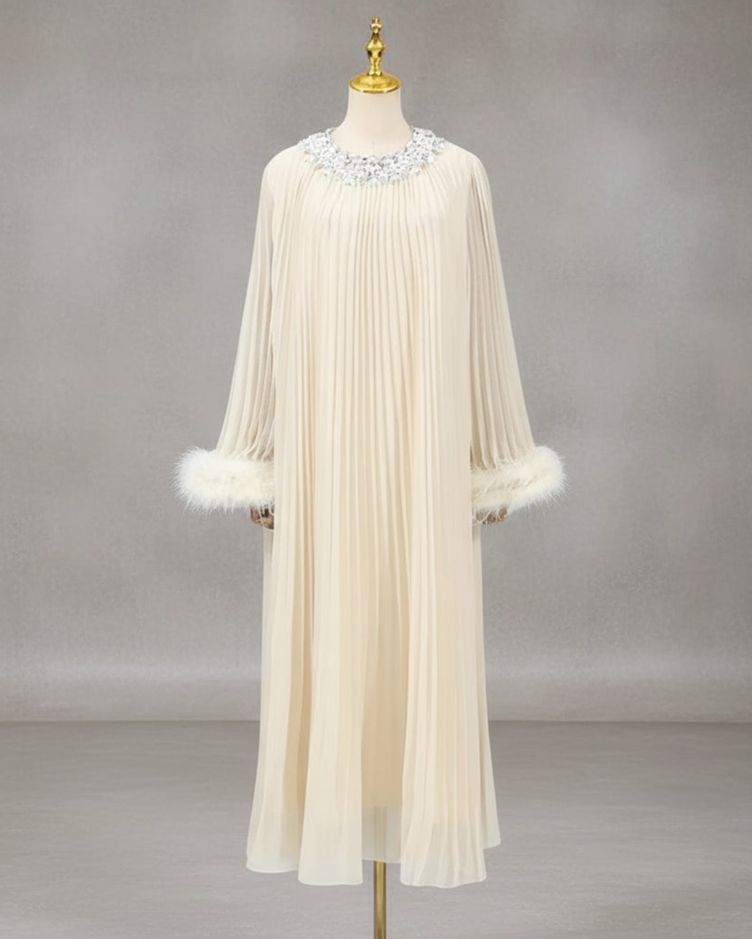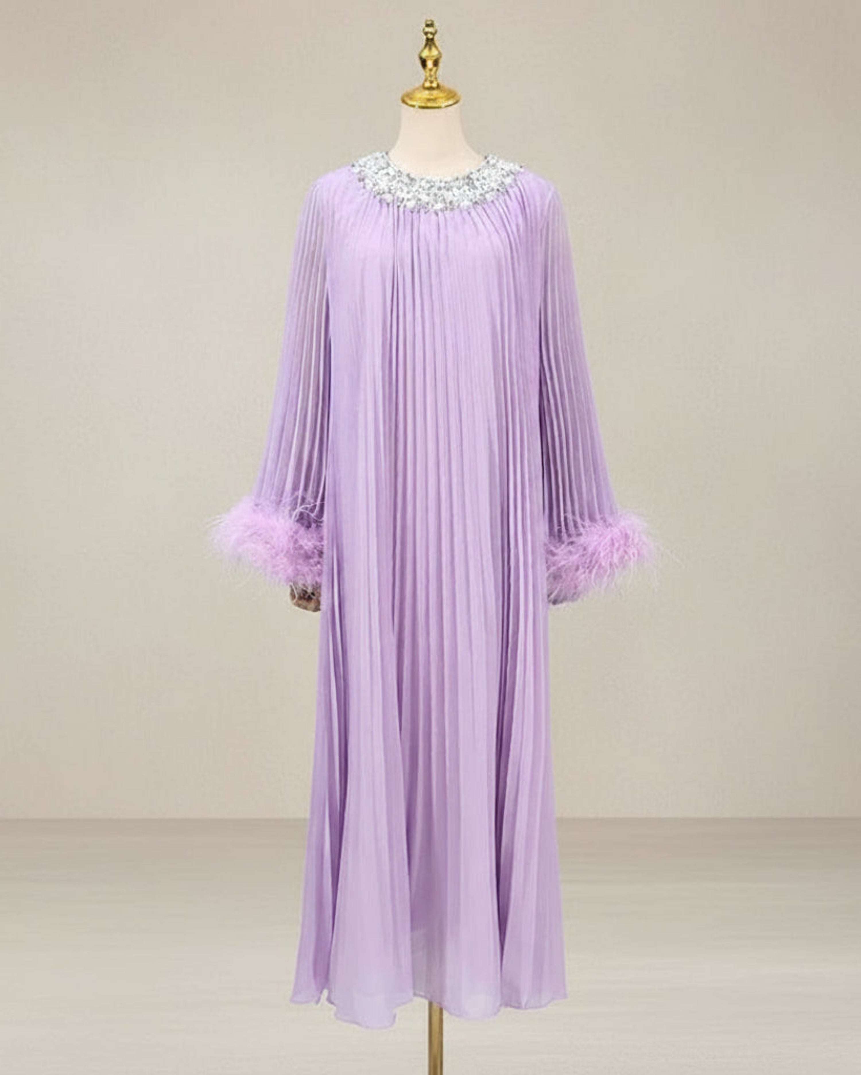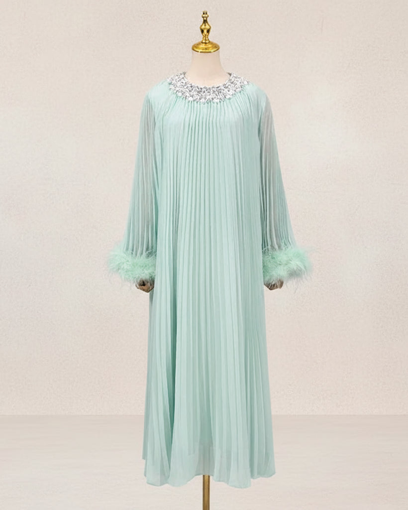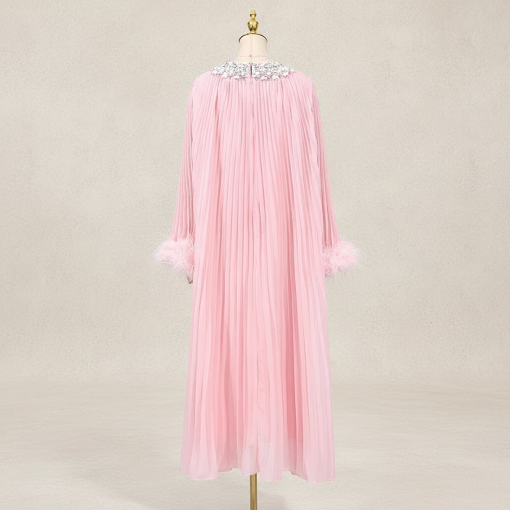 An elegant pleated plissé midi dress designed for special occasions. The round neckline features a sparkling rhinestone collar, while long sleeves finish with feather-trimmed cuffs.
