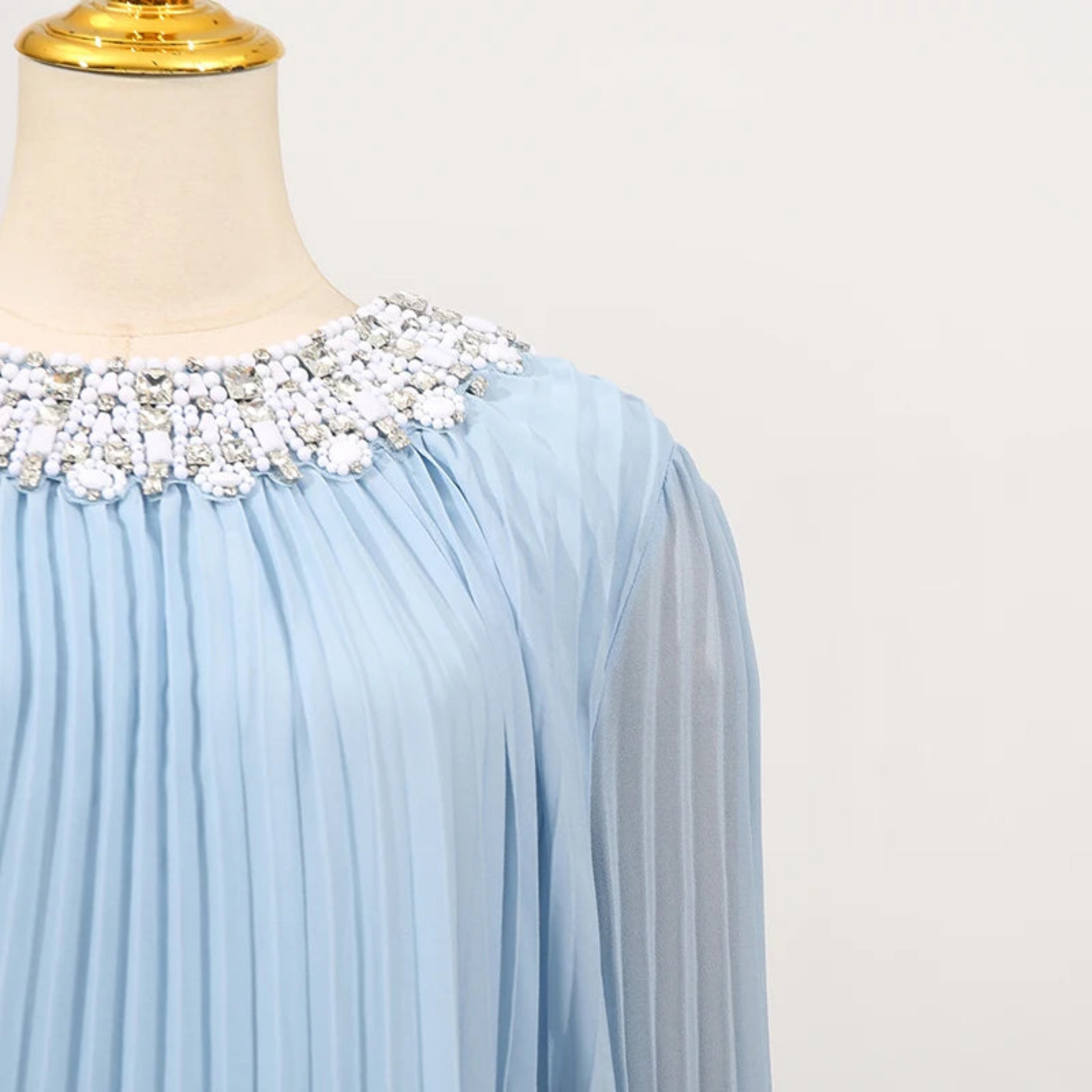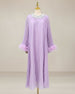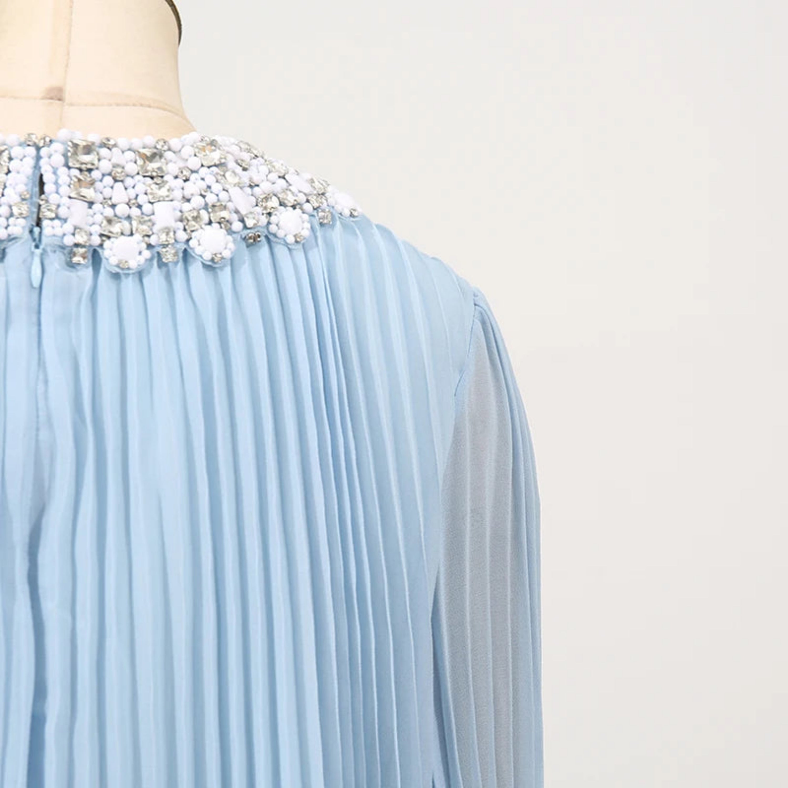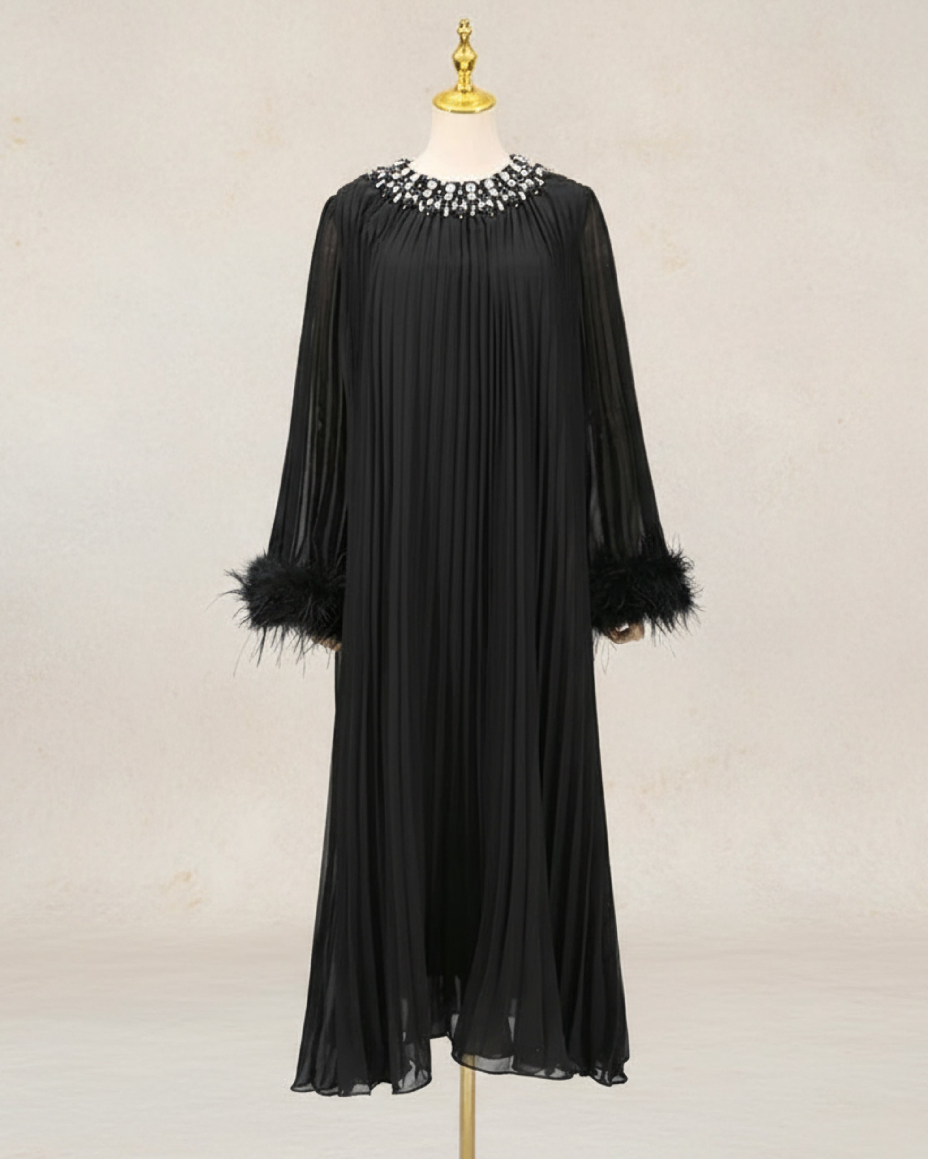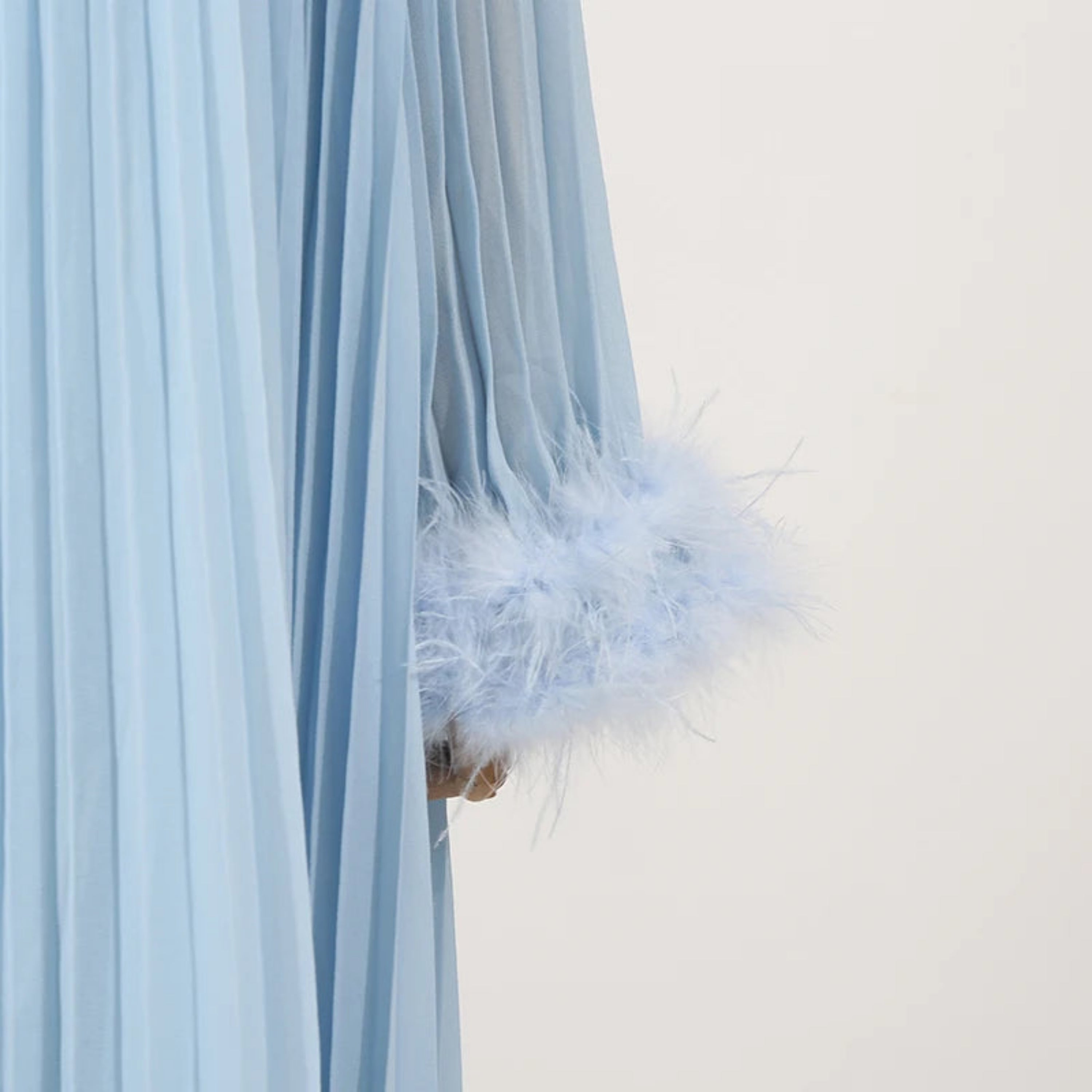 An elegant pleated plissé midi dress designed for special occasions. The round neckline features a sparkling rhinestone collar, while long sleeves finish with feather-trimmed cuffs.