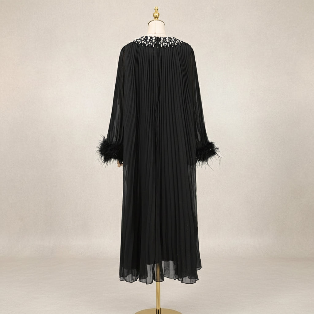 Formal Travel Luxury Plissé Midi Dress – Rhinestone Collar & Feather Cuffs