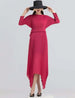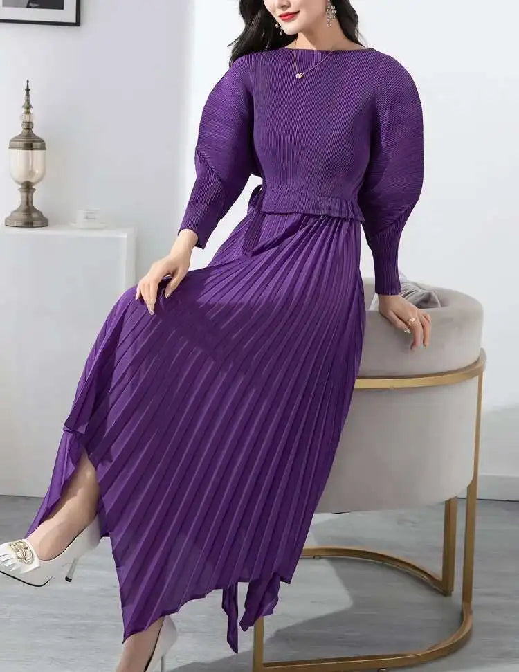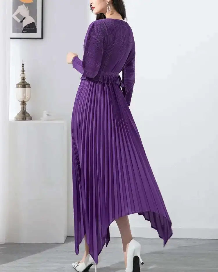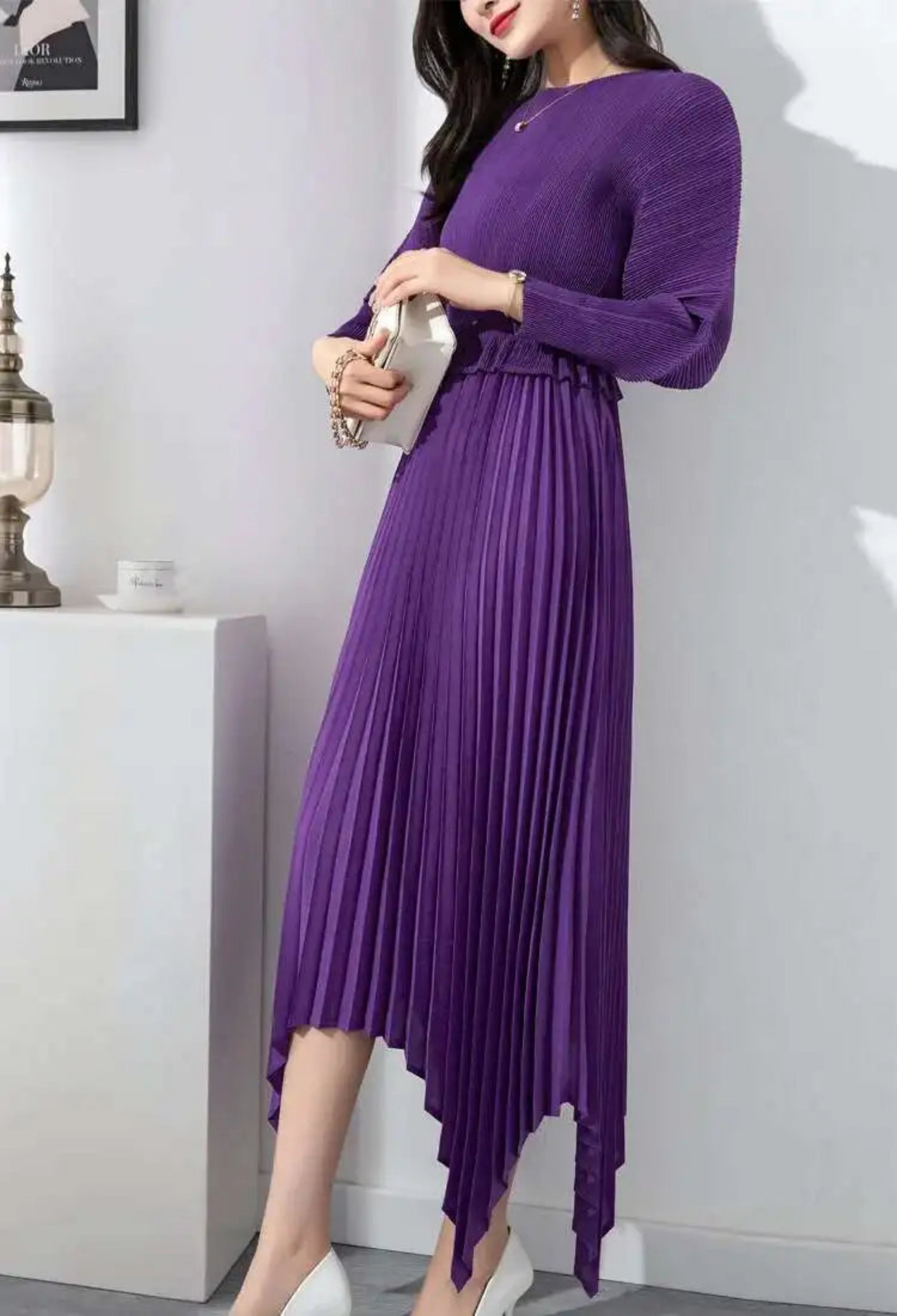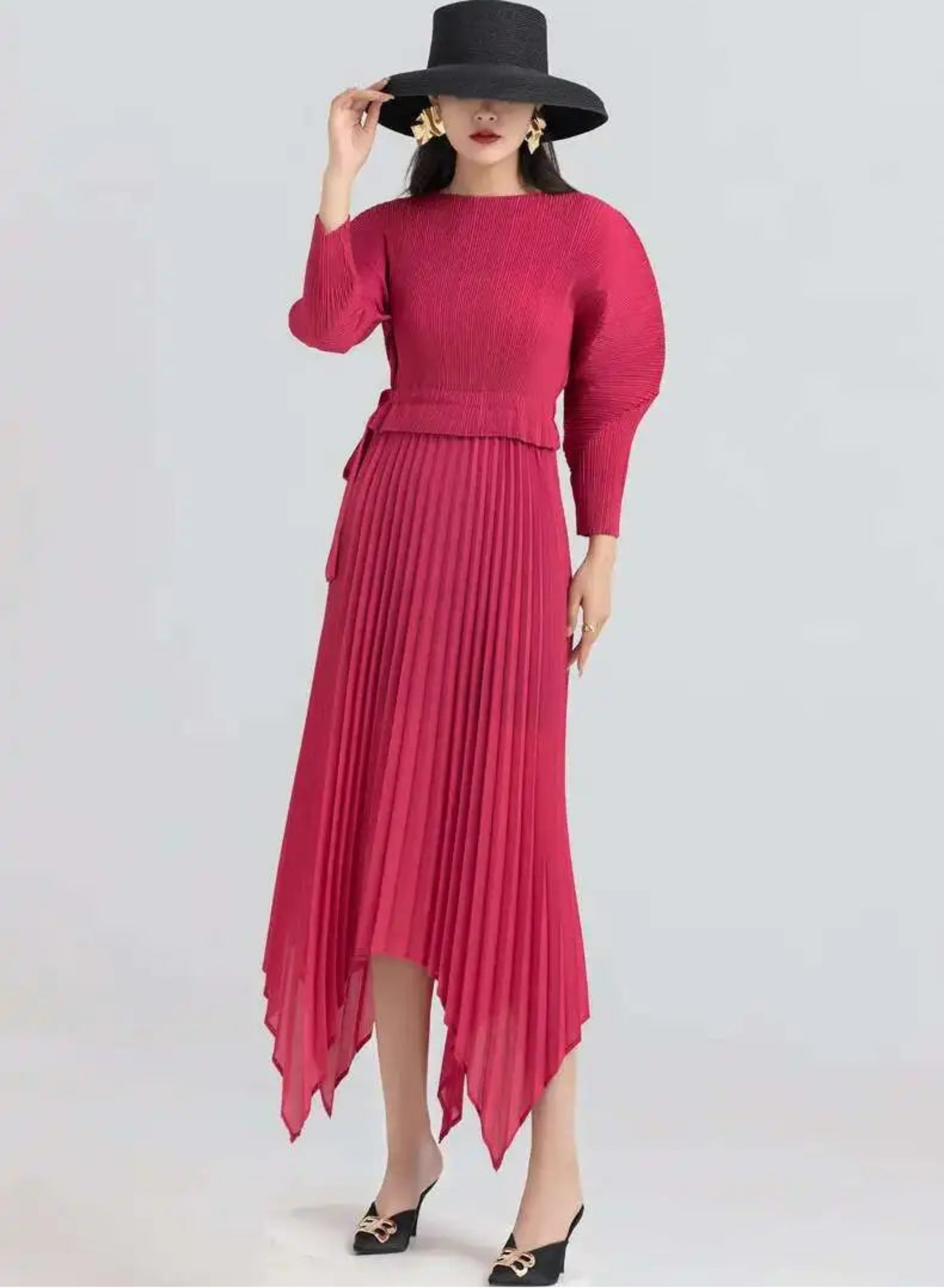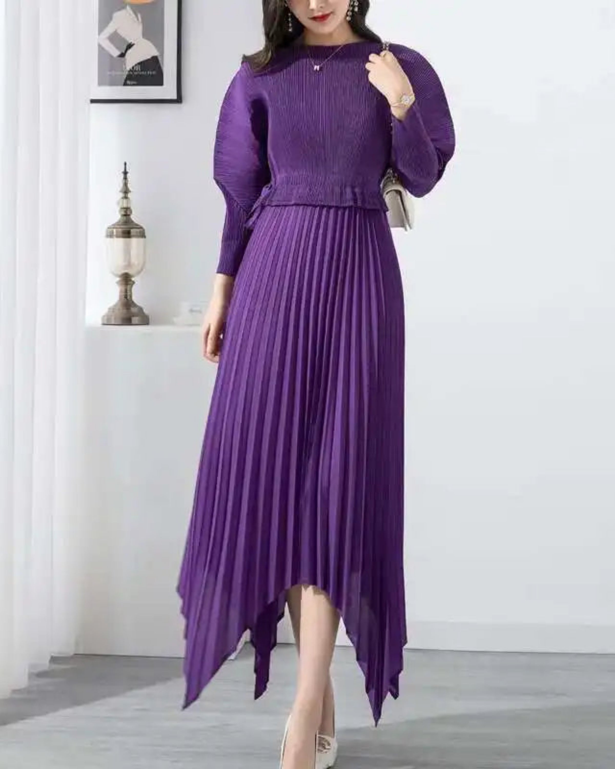 It features an asymmetrical hem, flowing pleats, a loose batwing-style top, and long sleeves with a modest neckline — perfect for travel, work, formal events, or vacations.