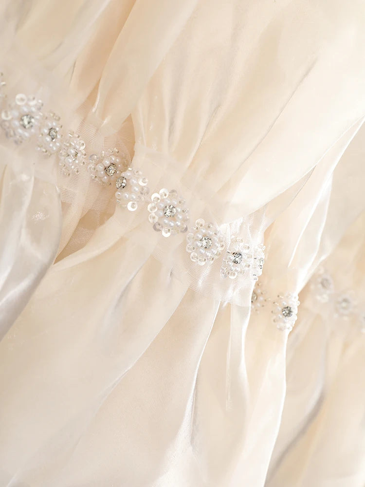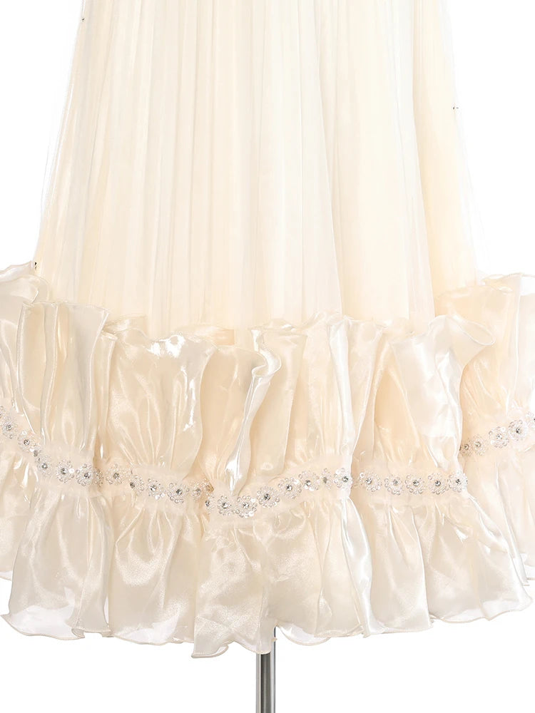 Elegant ruffle hem is accented with sparkling sequins and crystal-like embellishments for glamorous texture. Full-length layered tulle makes it perfect for formal events, evening occasions, and special gatherings.