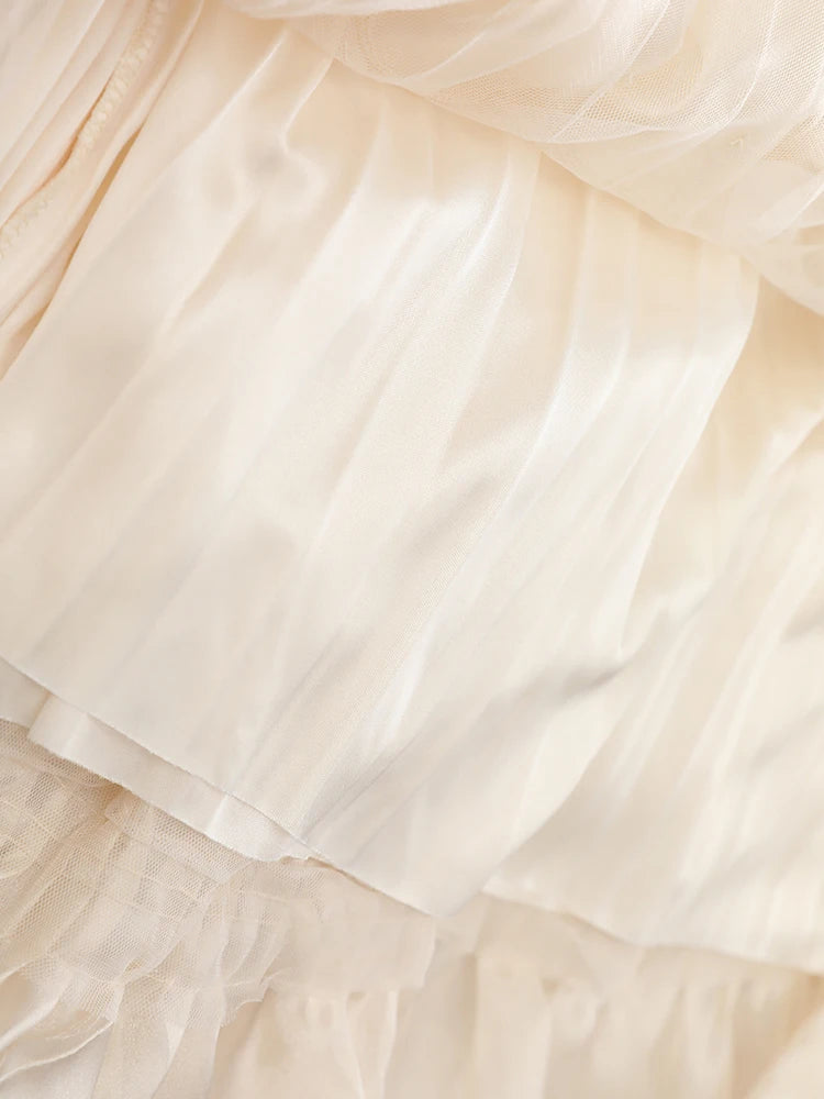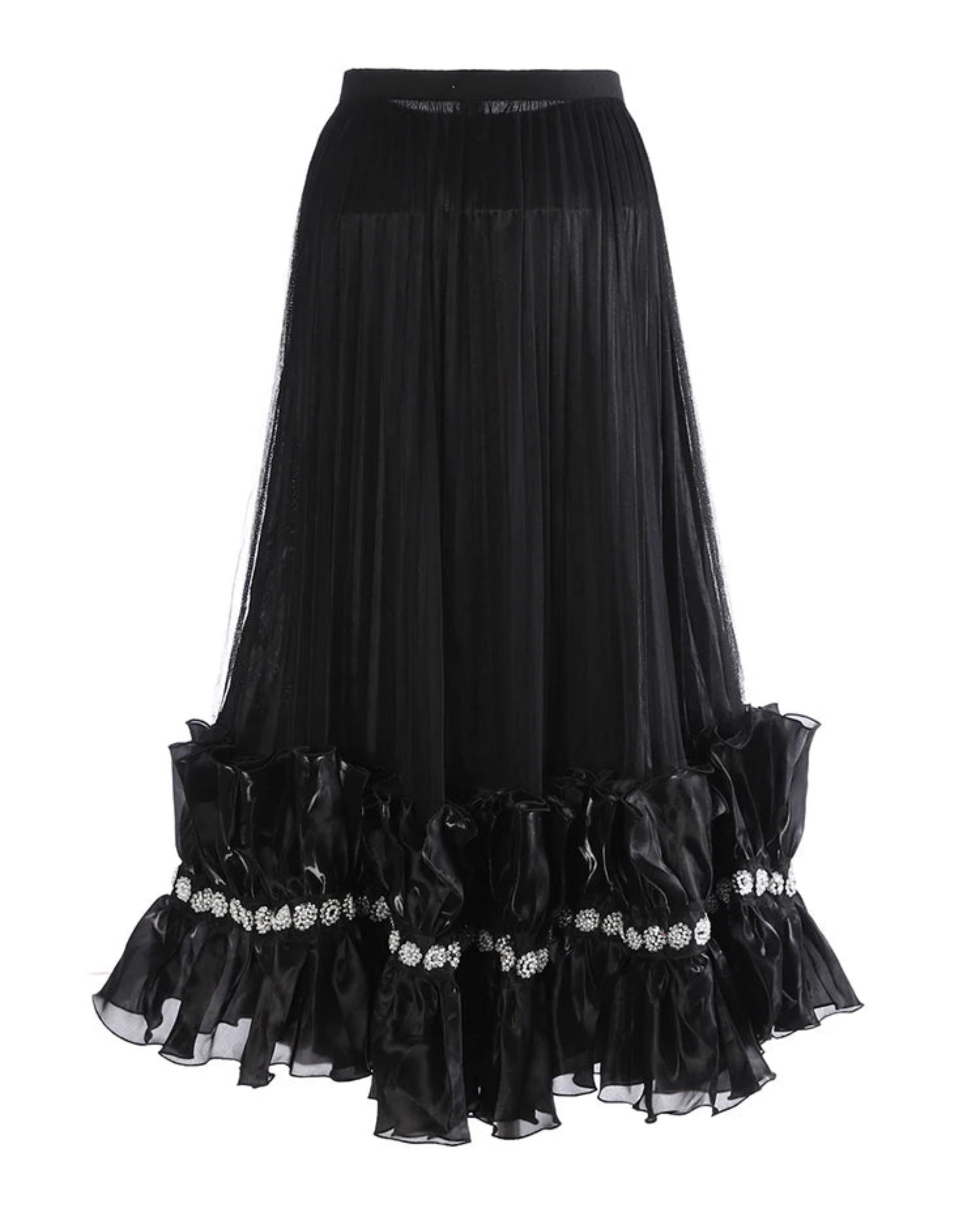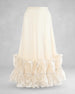 Haute couture tulle maxi skirt with a flowing double-layered silhouette. High-waisted elastic waistband ensures a secure, comfortable fit.