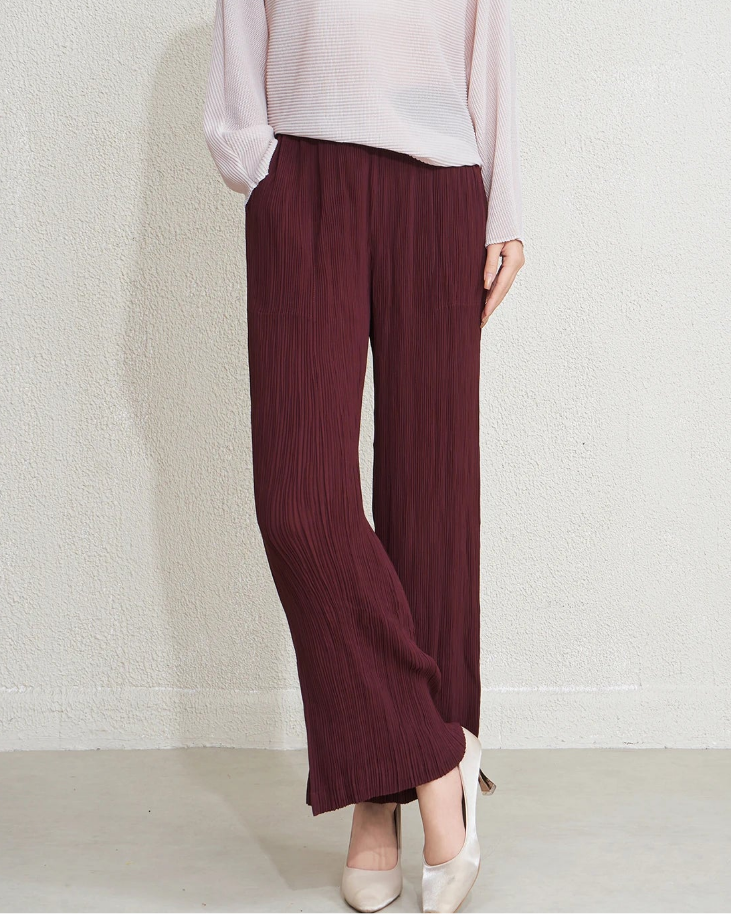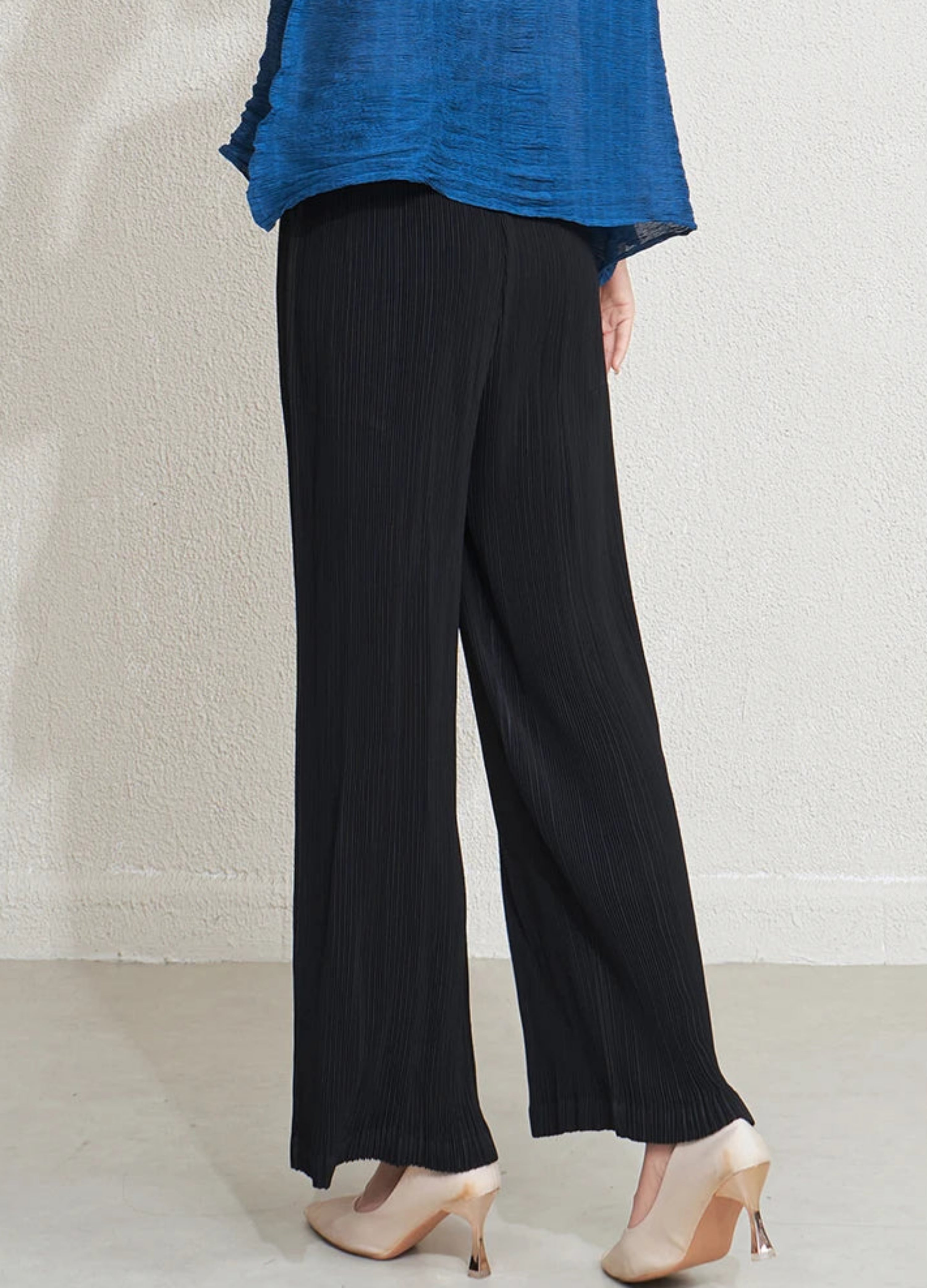 Elegant high-waisted wide-leg trousers made from premium Japanese pleated fabric with an elastic waistband for added comfort.