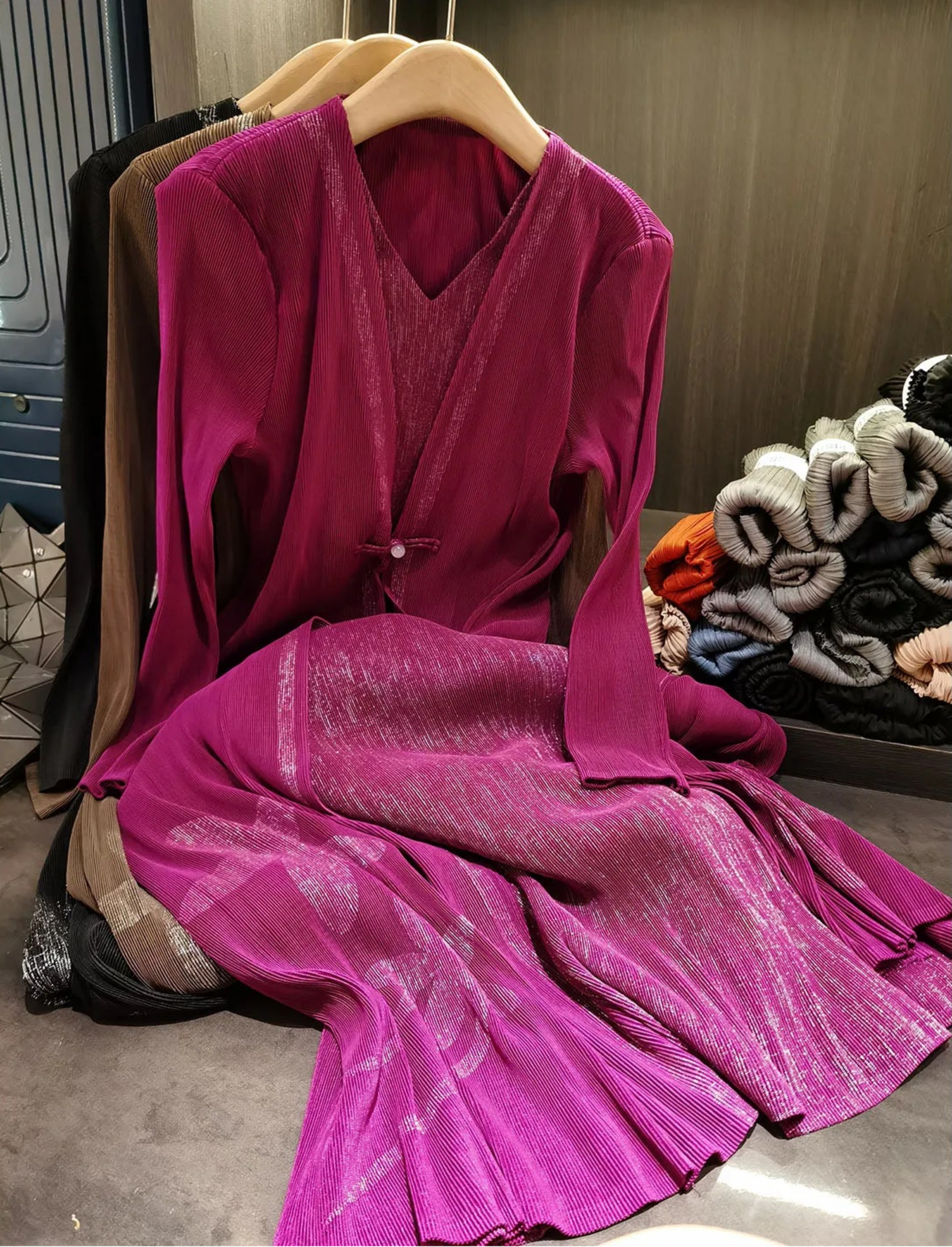 Exquisite Japanese pleats and floral embroidery create a bold, luxurious statement. Stretchy, wrinkle-resistant fabric moves with you—no ironing needed.