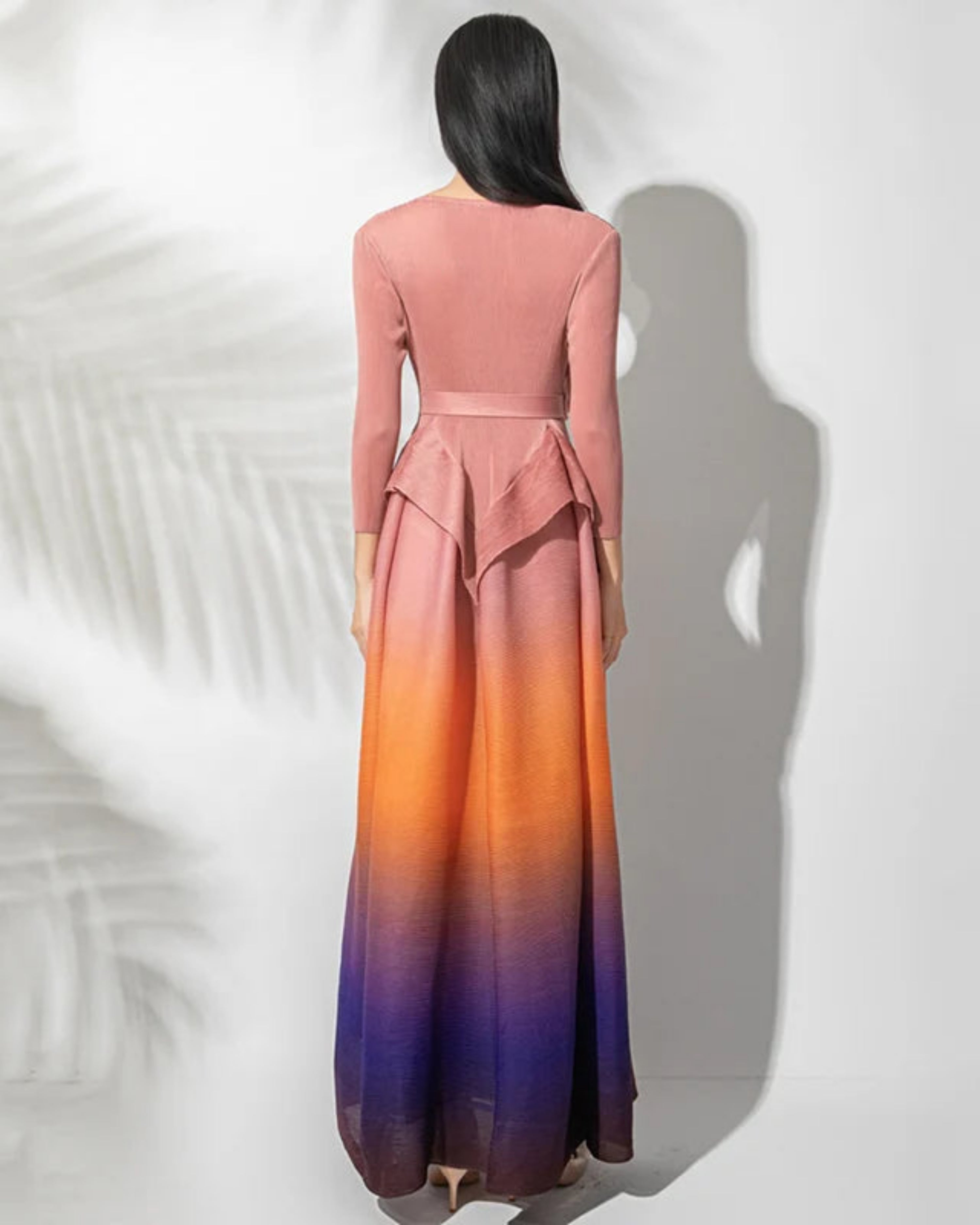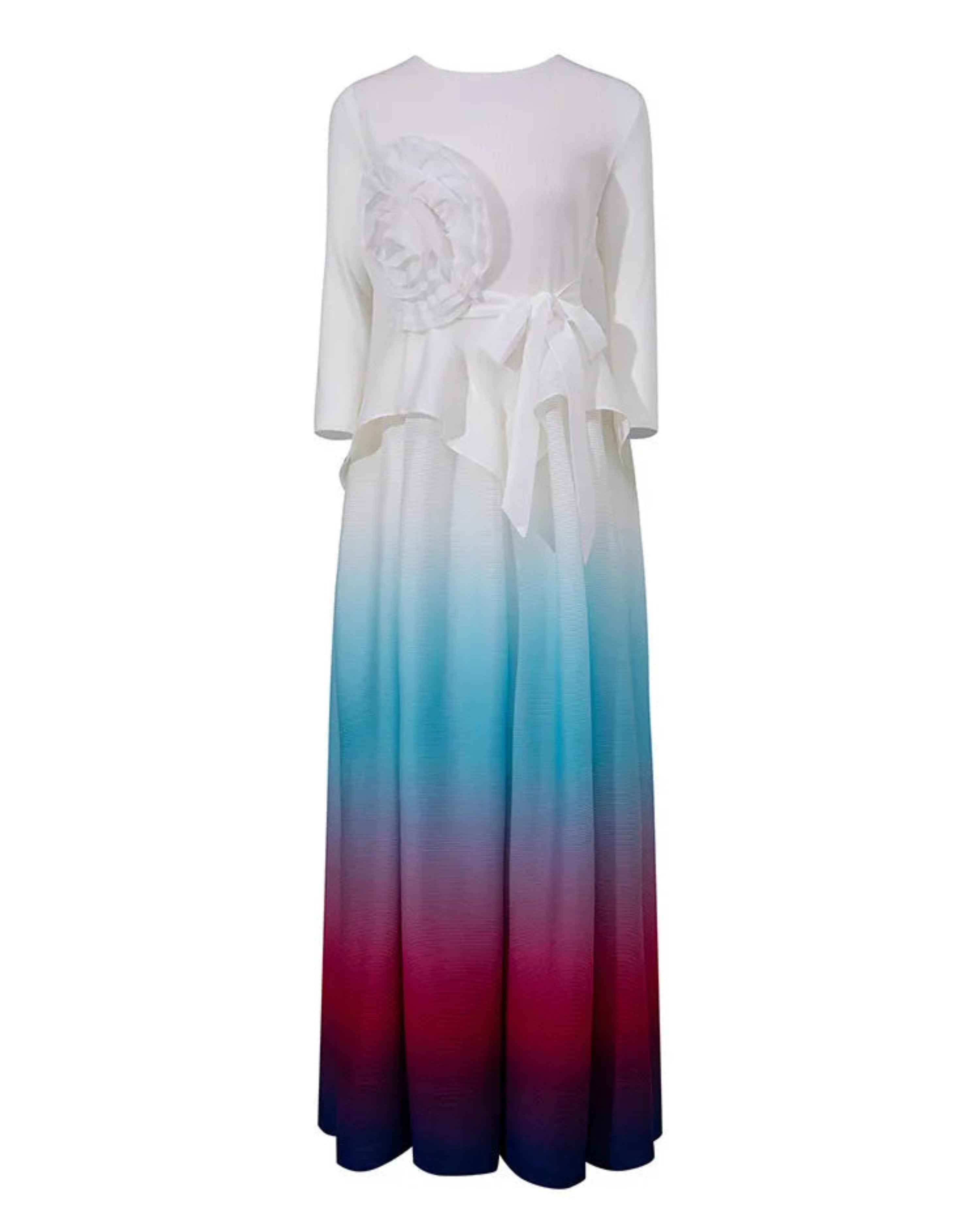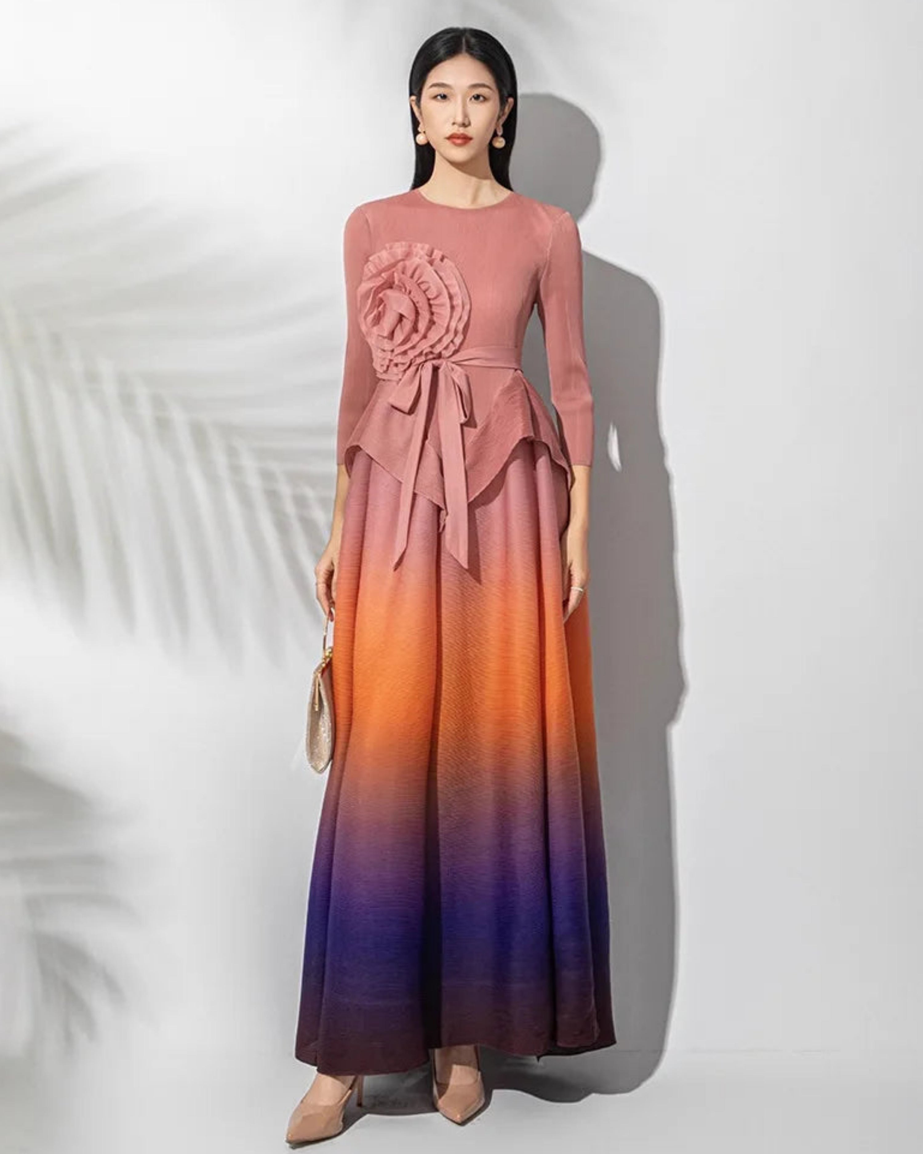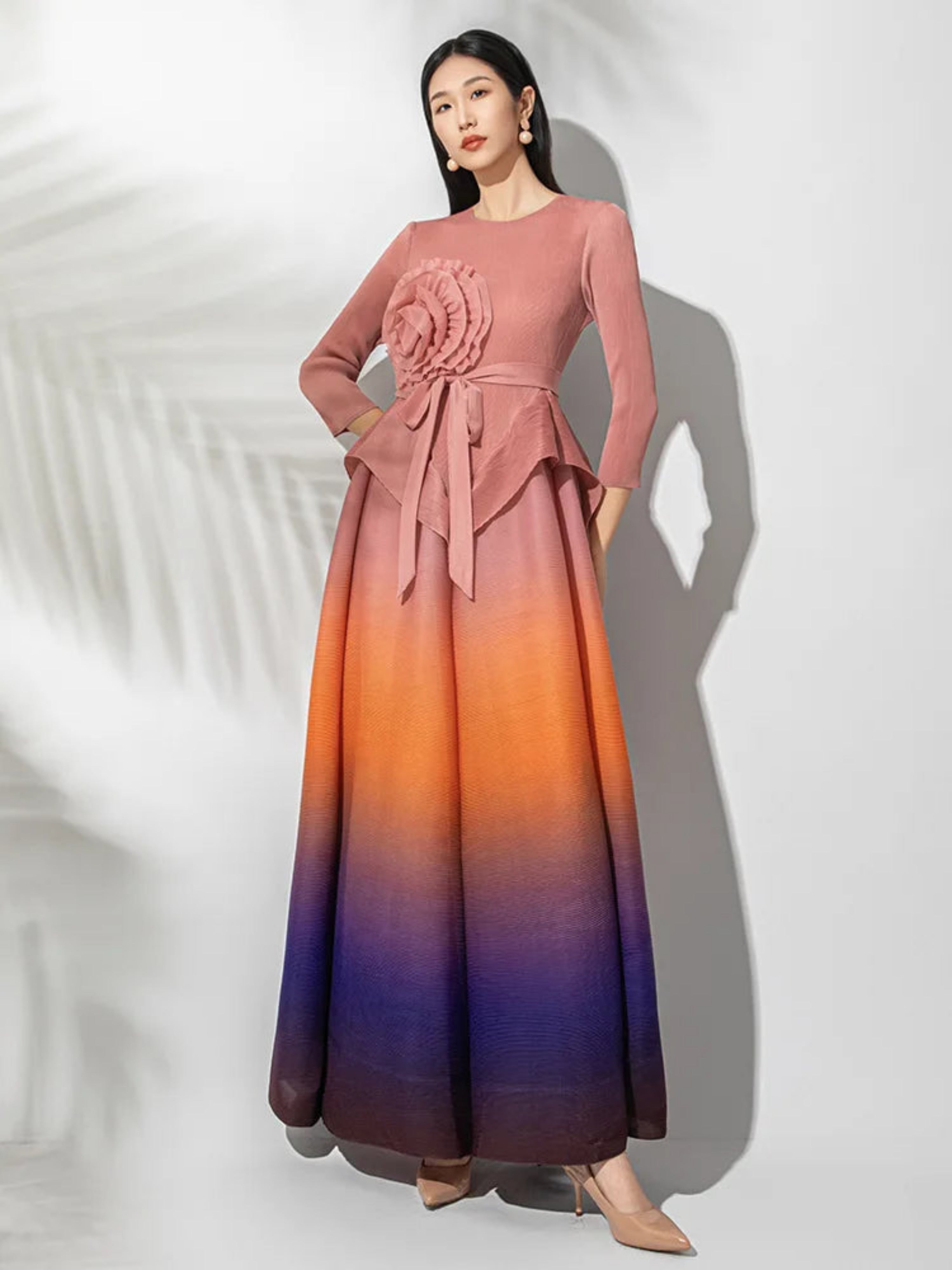 This luxurious Japanese micro-pleated midi dress features elegant floral appliqué at the bodice, three-quarter sleeves, and a peplum waist, offering a unique, flowing silhouette.