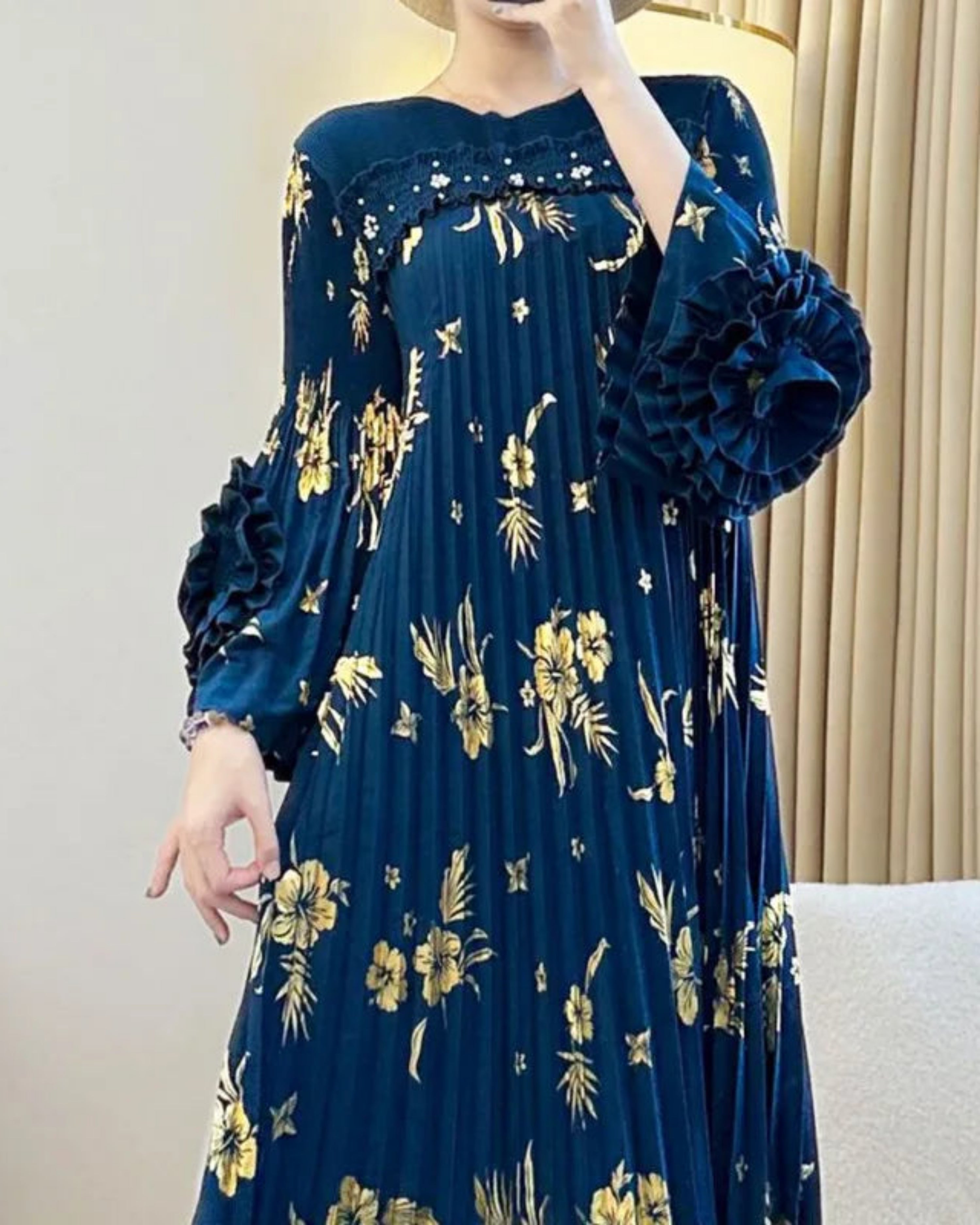 Elegant Japanese plissé midi dress with long bell sleeves featuring floral ruffles.