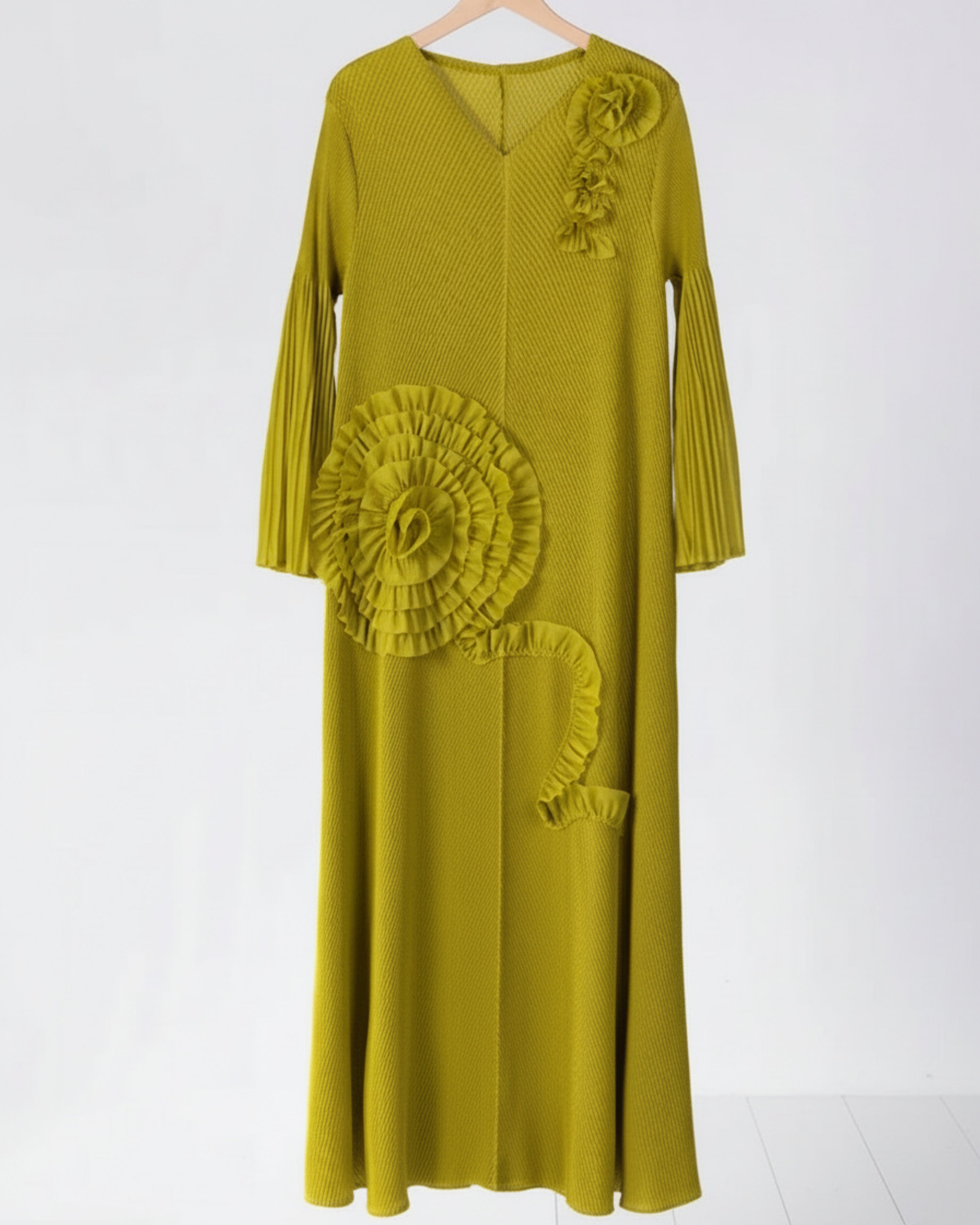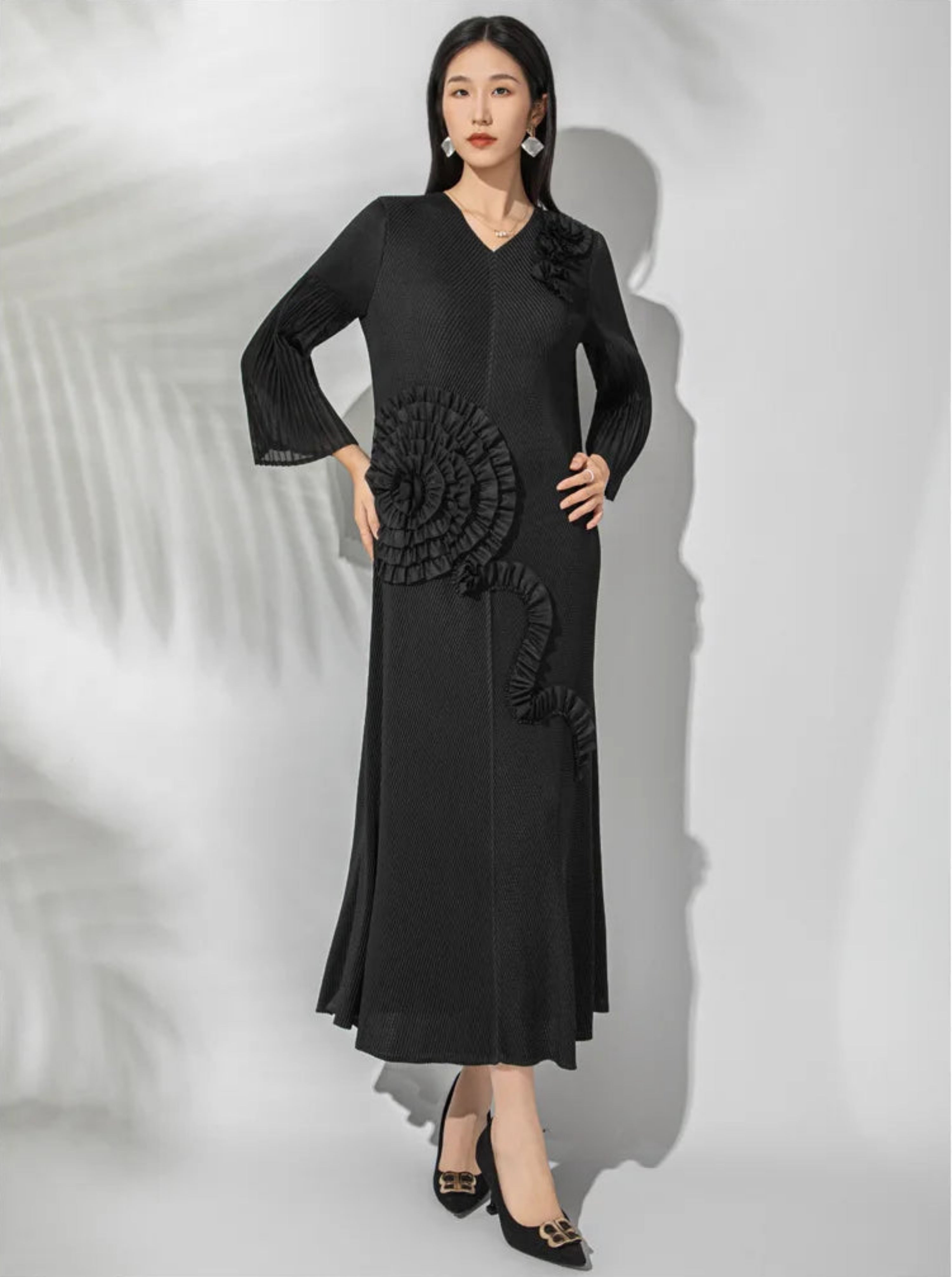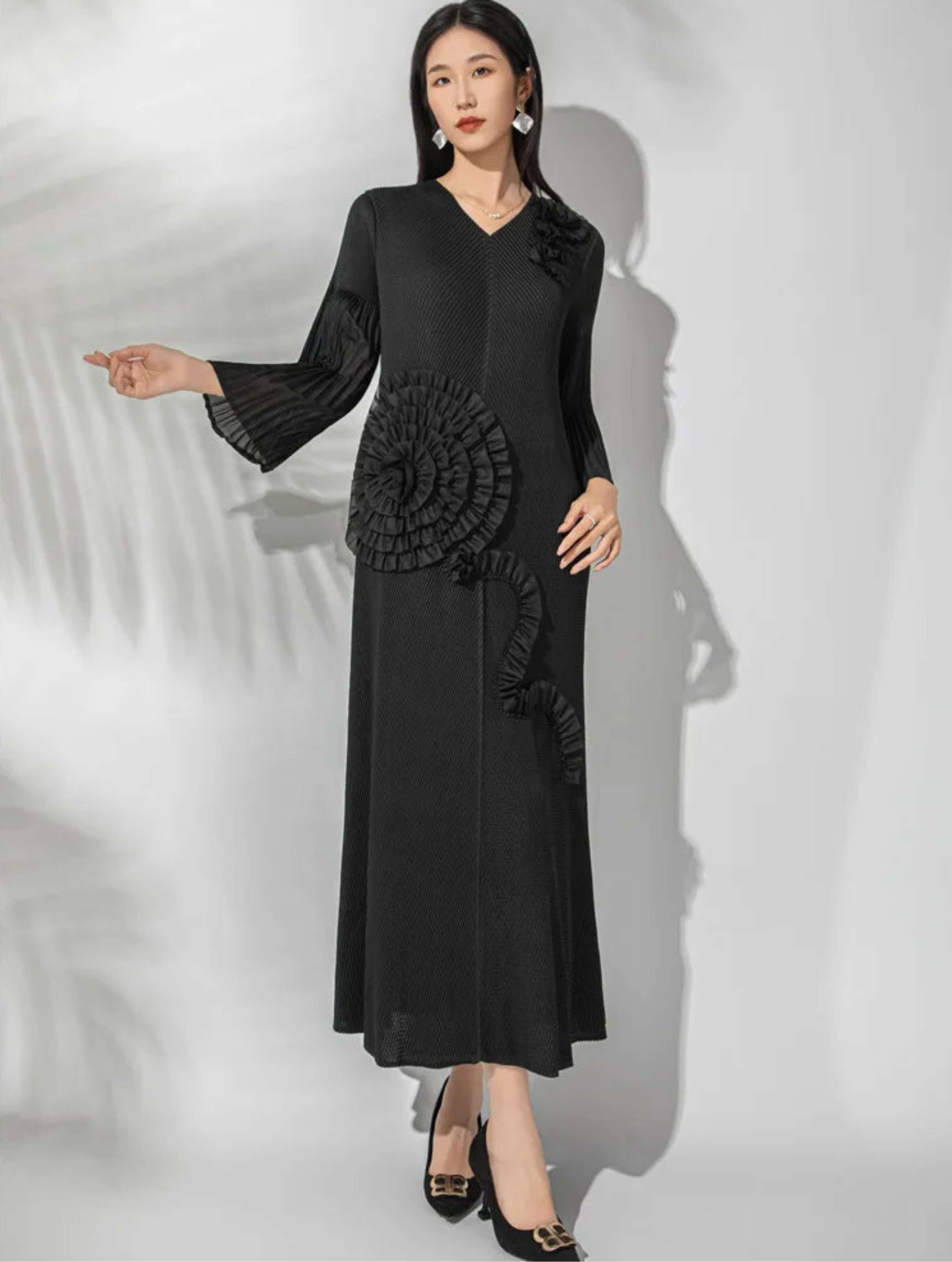 This luxury micro-pleated midi dress features a soft V-neckline and long sleeves finished with elegant flared bell cuffs.