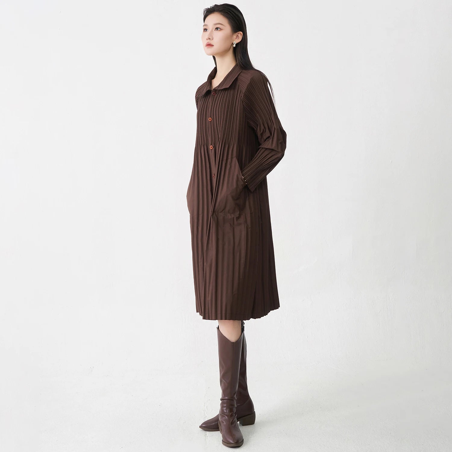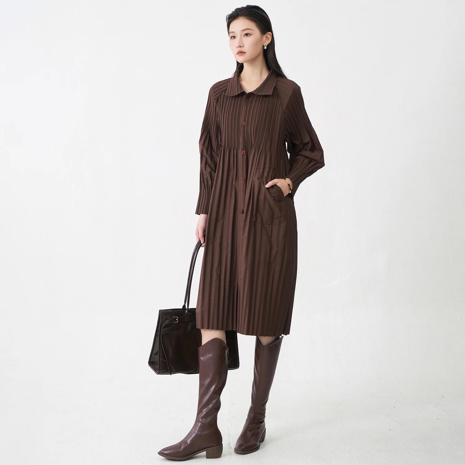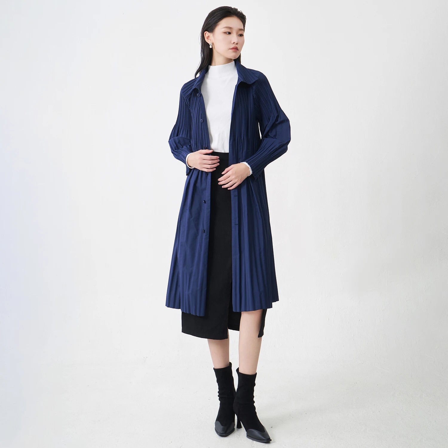 A flowing, longline coat in Japanese plissé fabric with an elegant A-line silhouette.