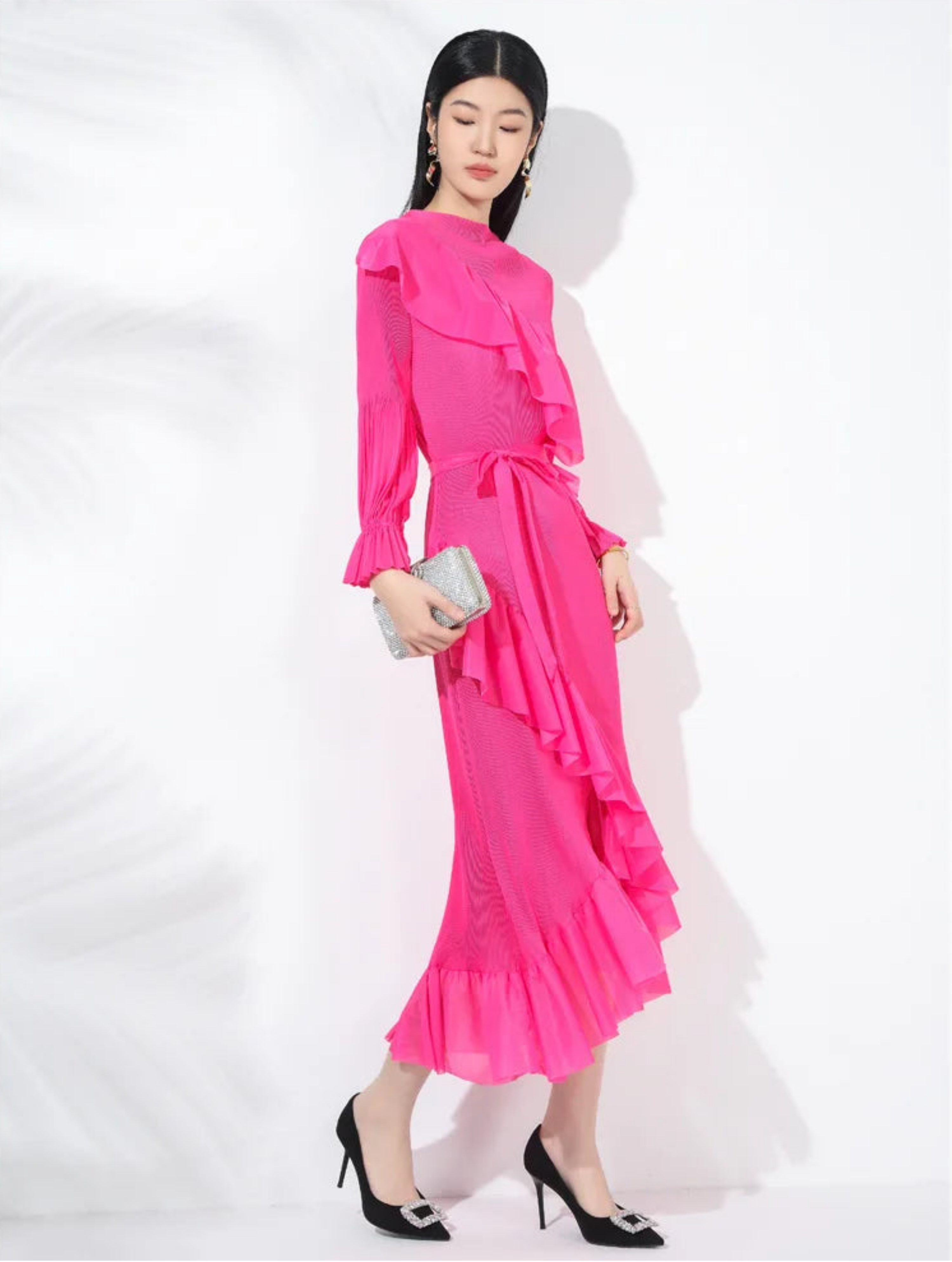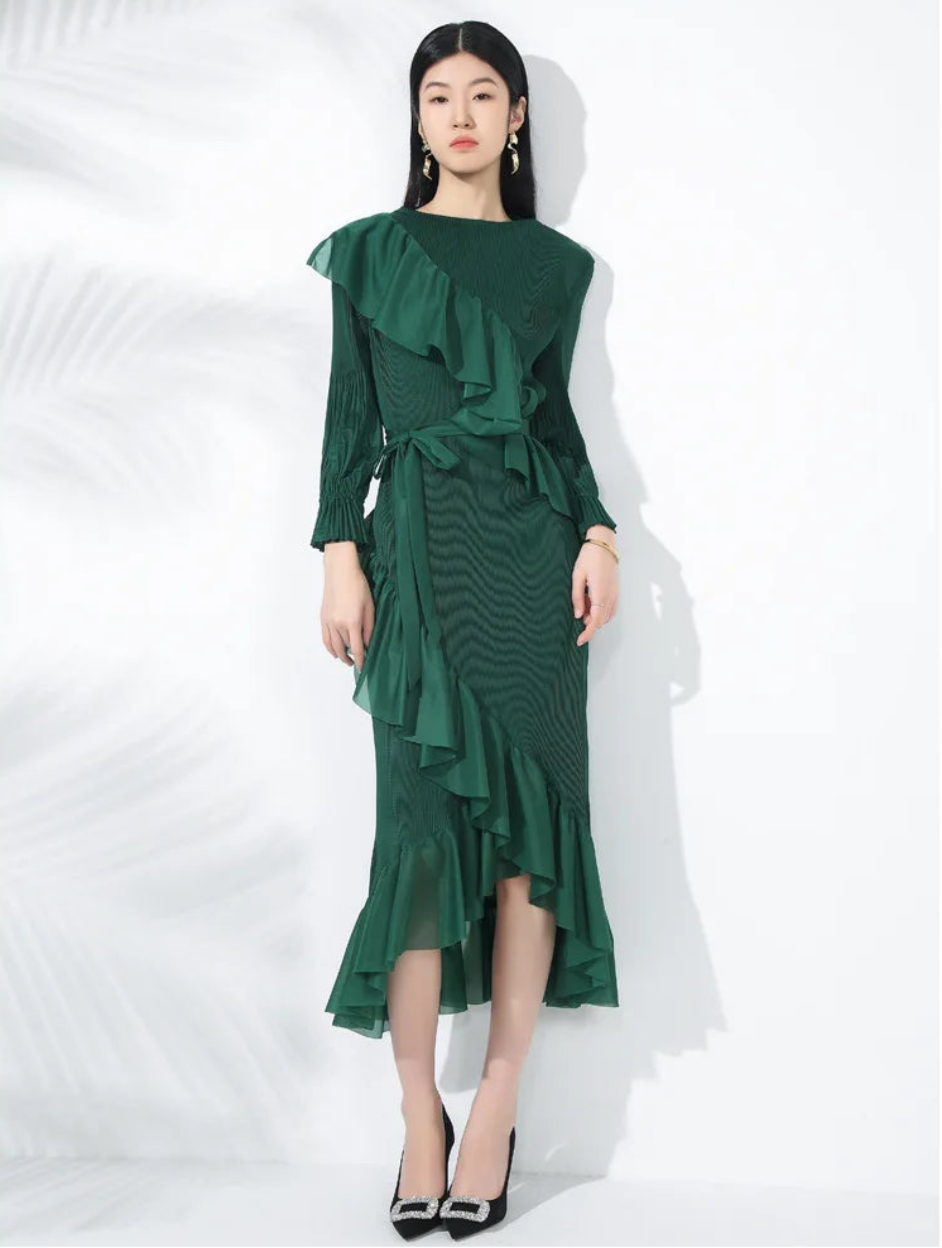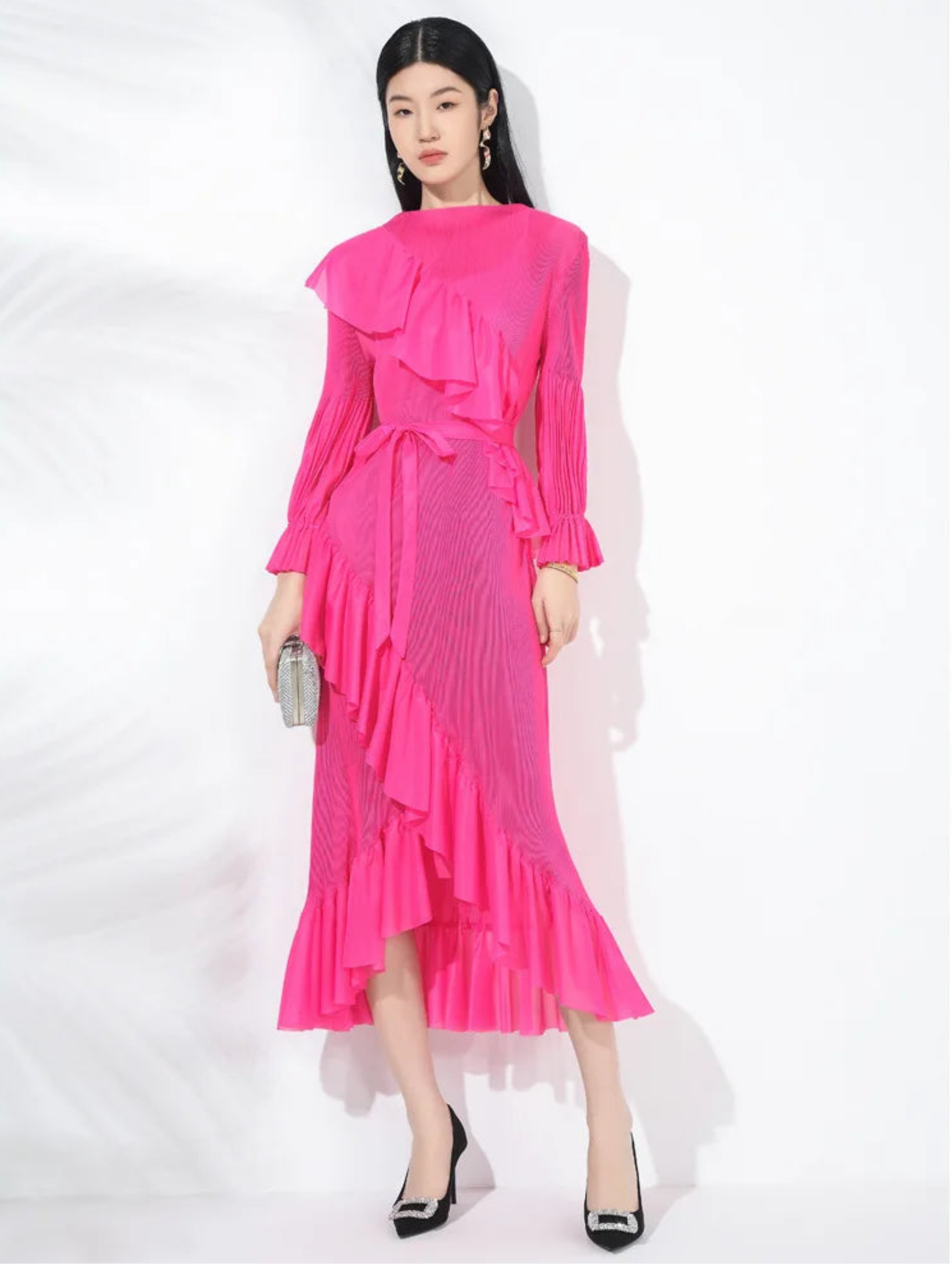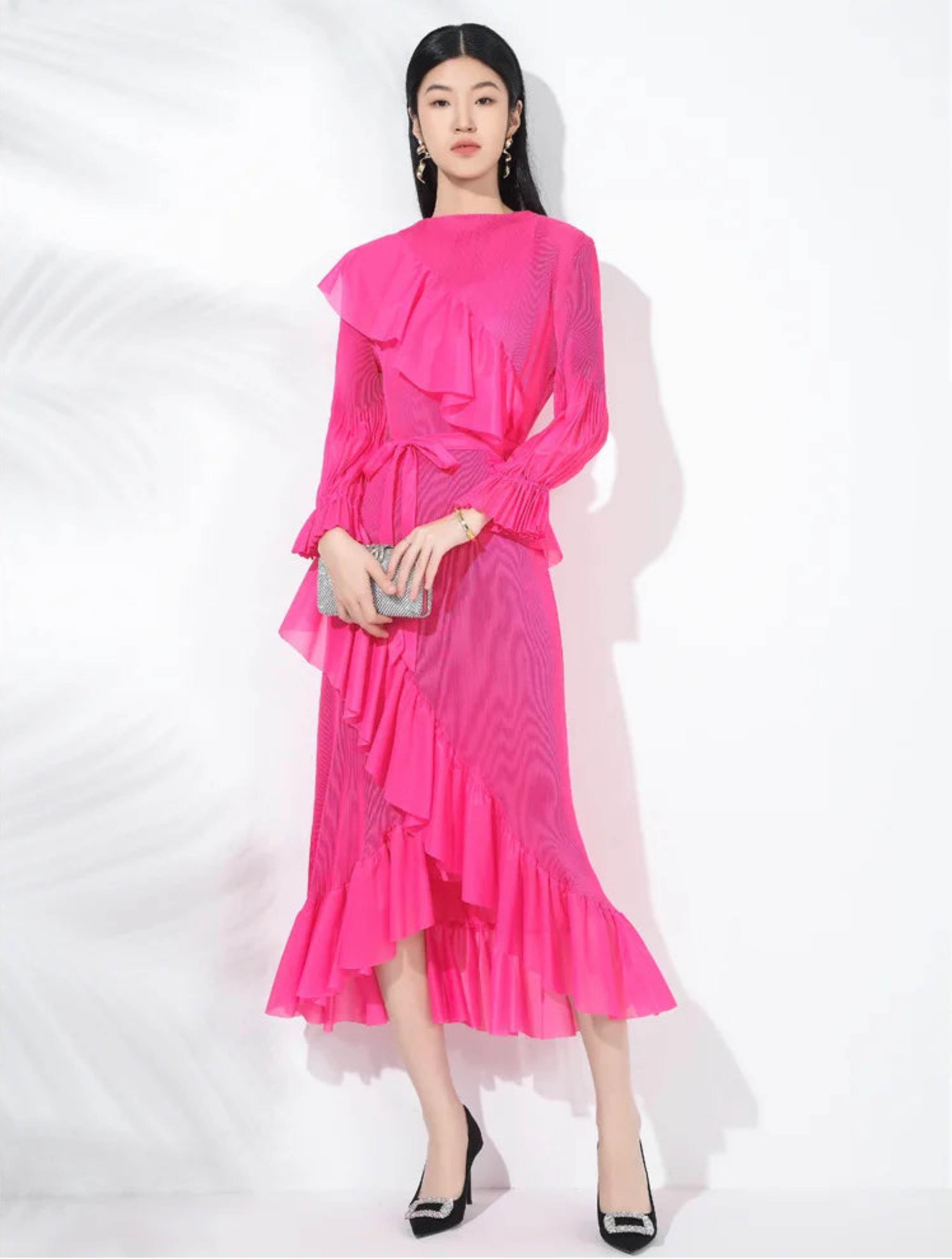 A self-tie belt defines the waist, while the asymmetrical ruffled hemline adds a modern, sophisticated finish. Lightweight, stretchy, and wrinkle-resistant, it’s ideal for travel, everyday wear, or formal occasions.