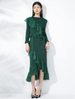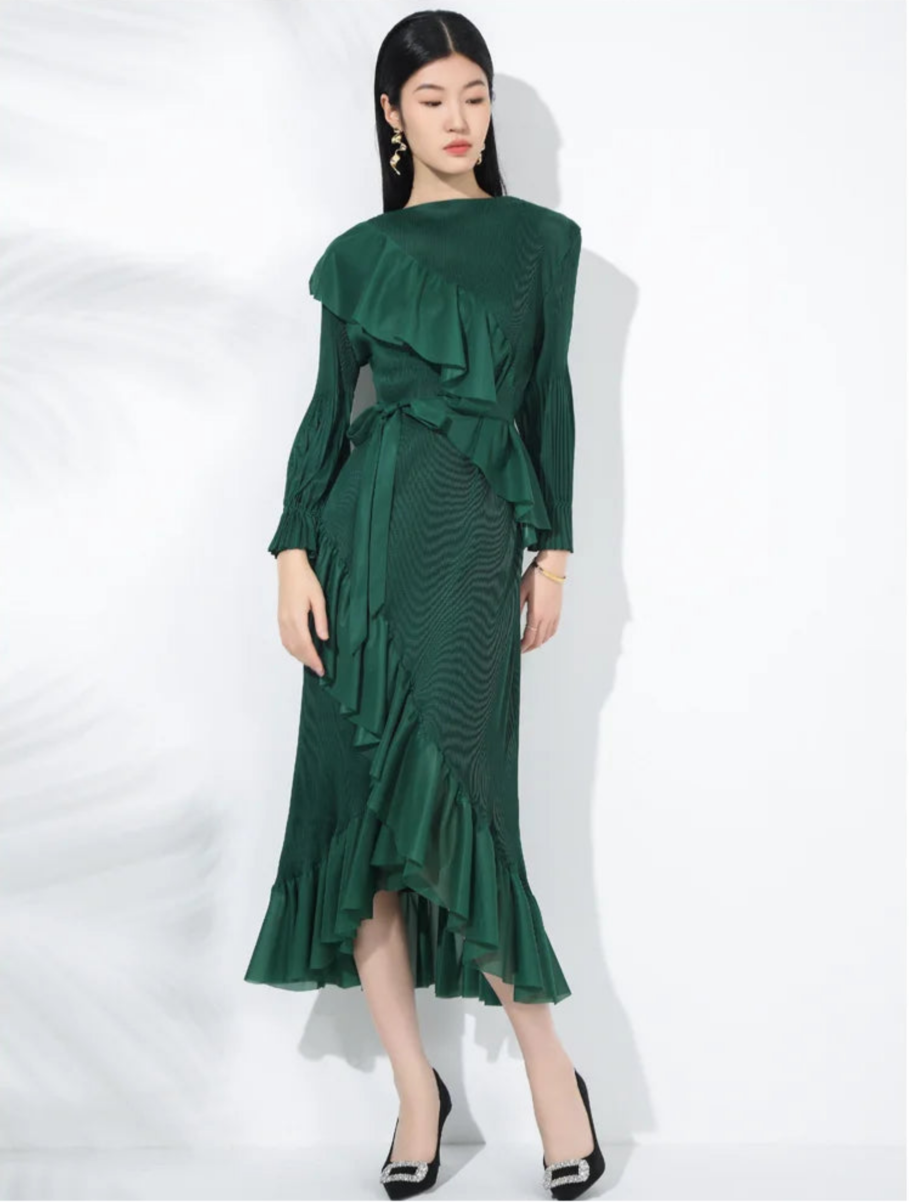 This luxurious Japanese plissé midi dress features long cuffed sleeves for dynamic movement and a feminine aesthetic.