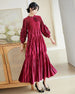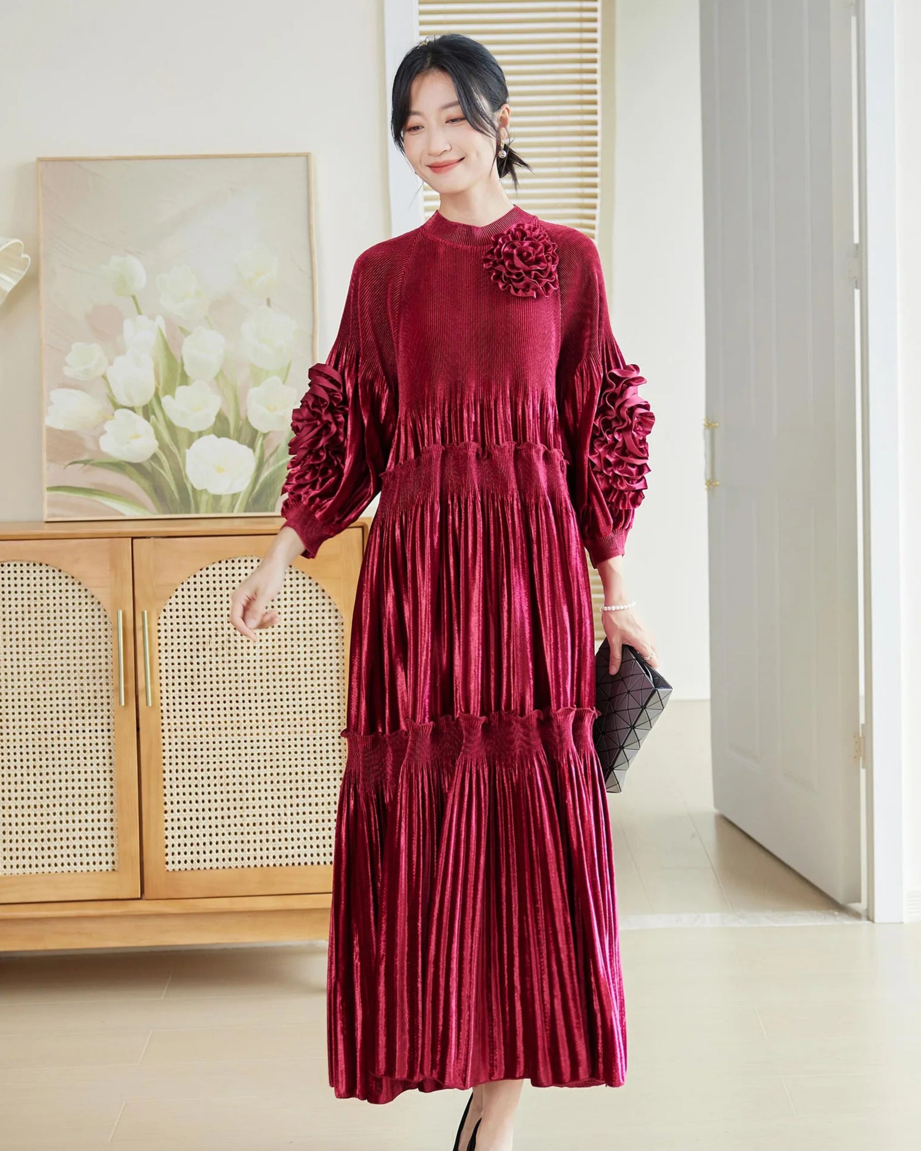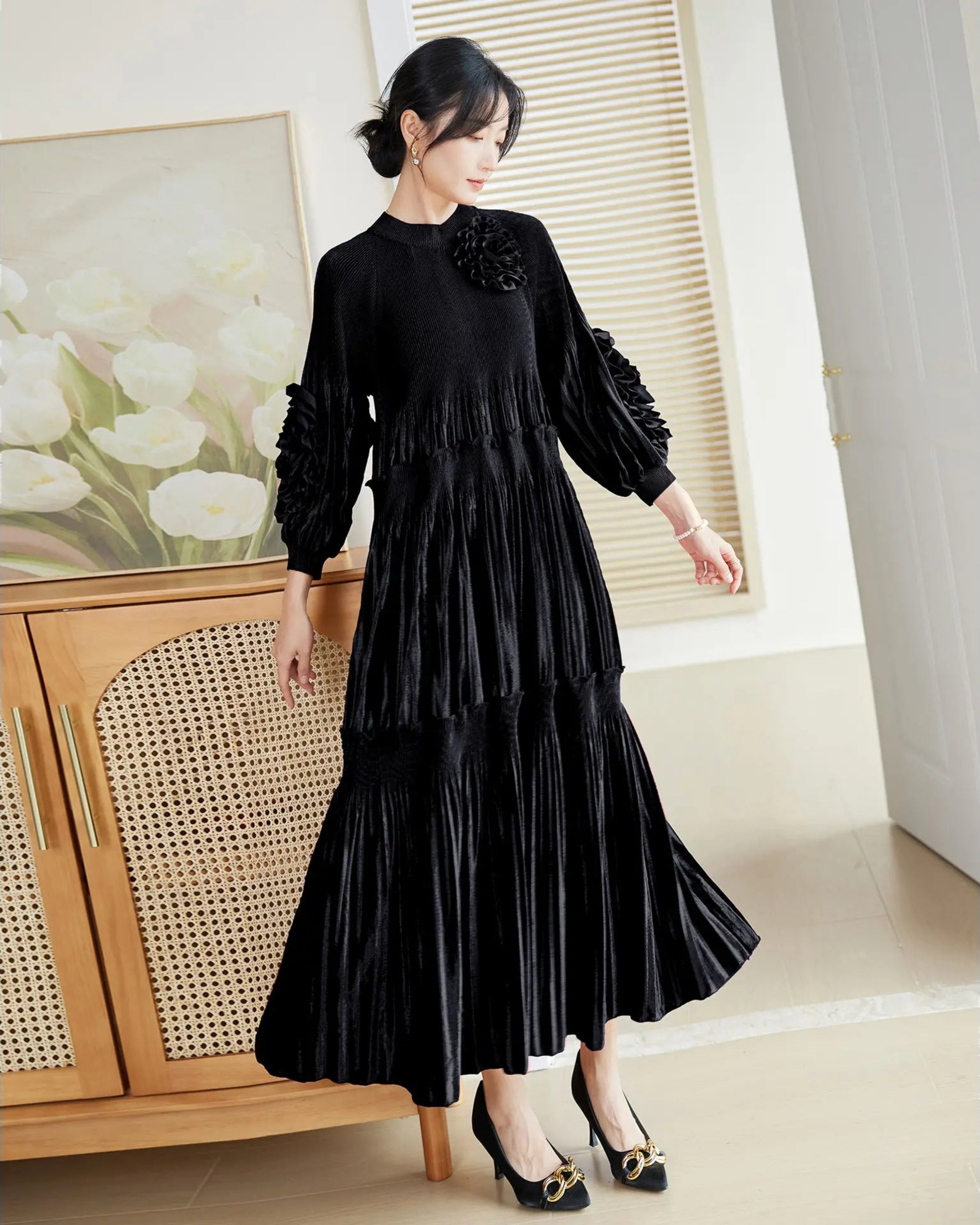 Elegant Japanese velvet plissé midi dress with long sleeves featuring floral pleats. Loose-fit, soft, and luxurious, made from premium pleated velvet that is stretchy and wrinkle-resistant, offering comfort without sacrificing style.