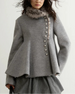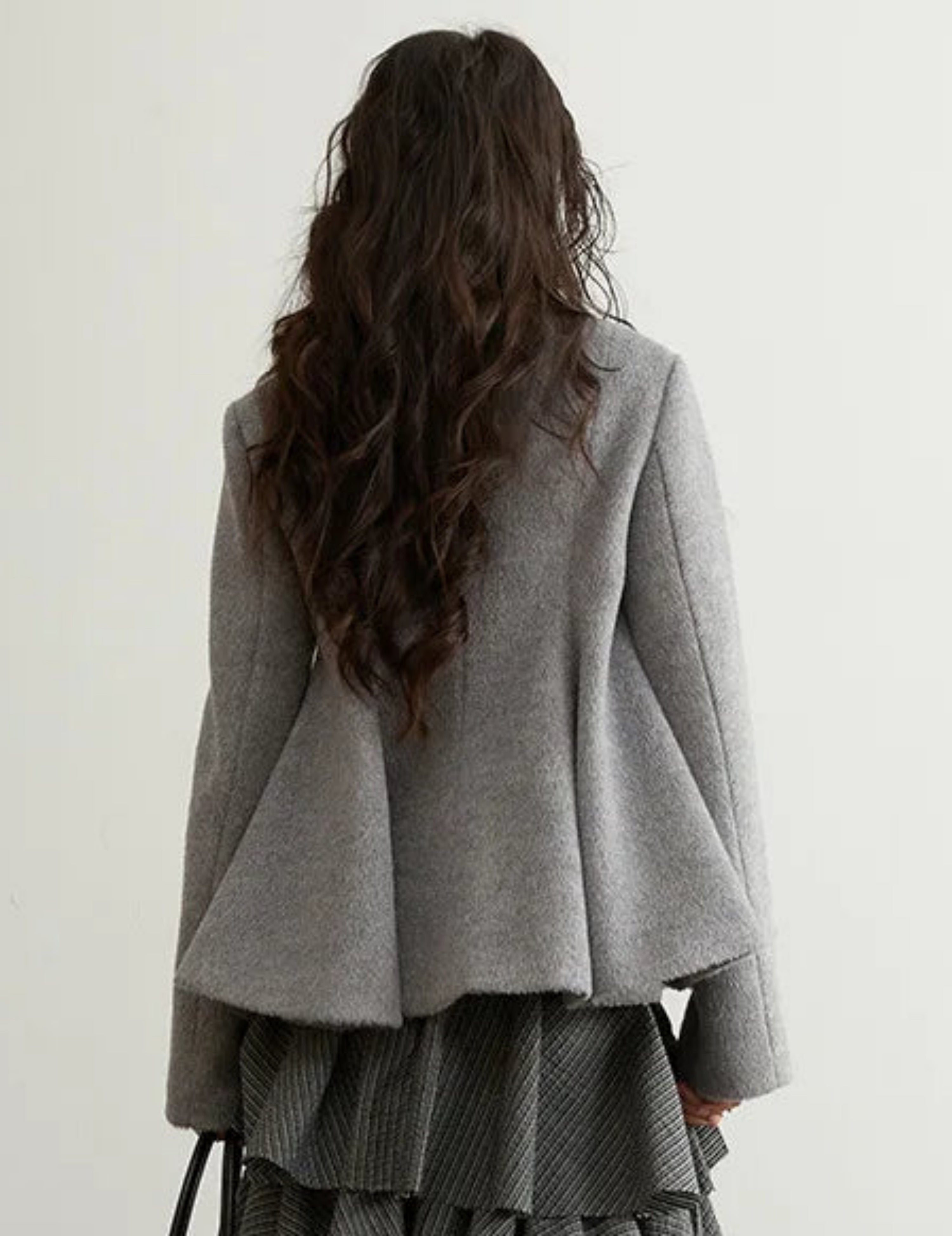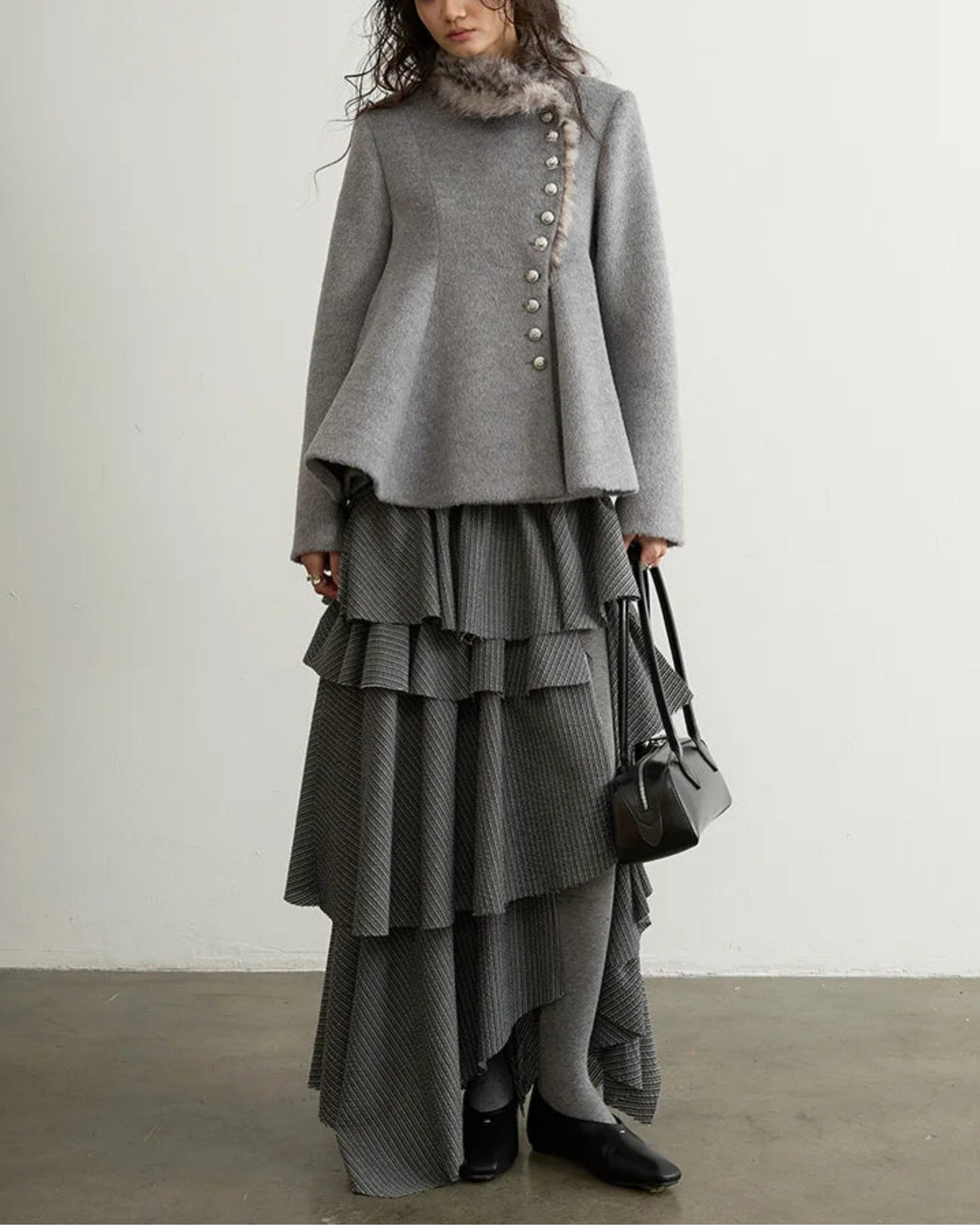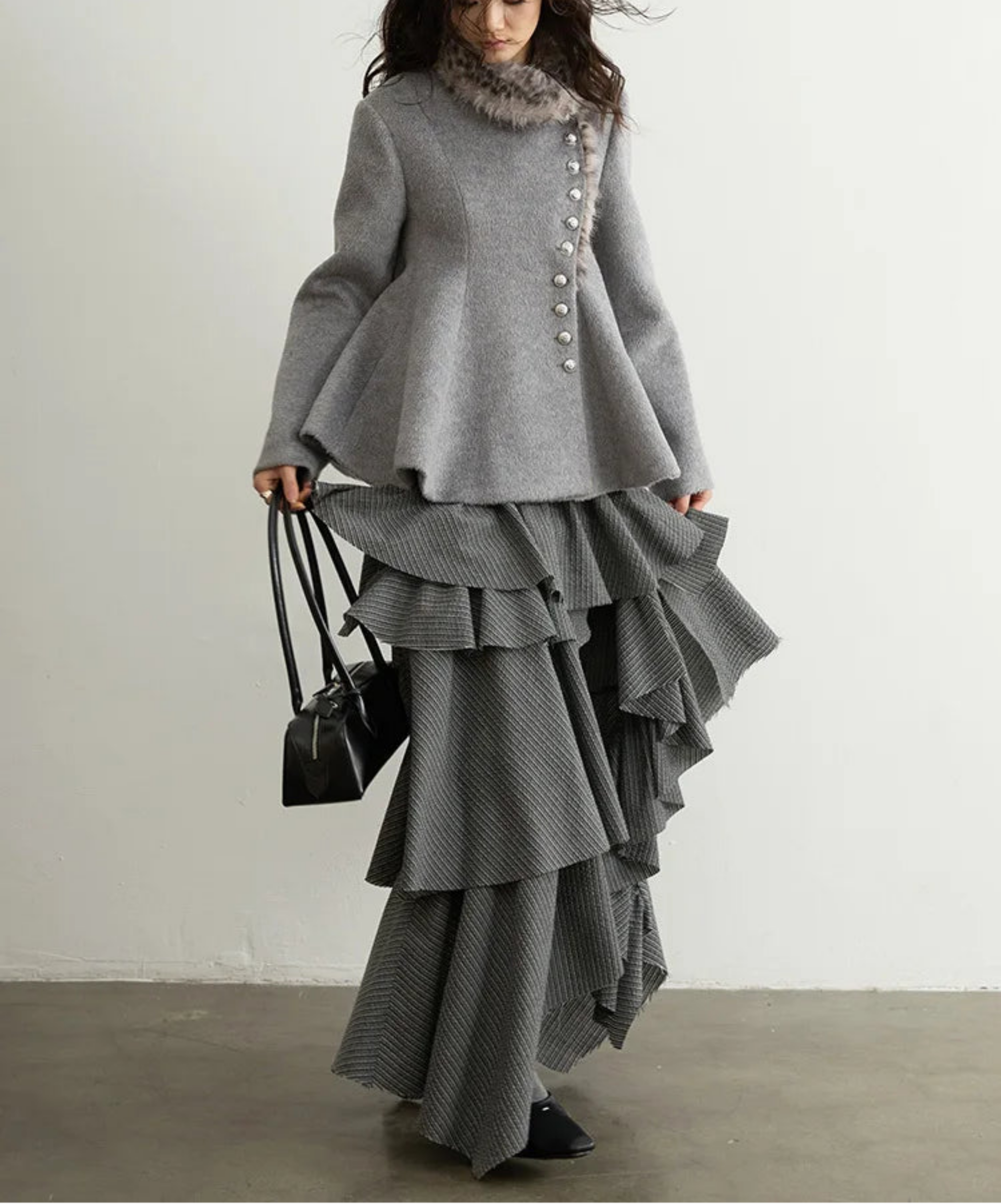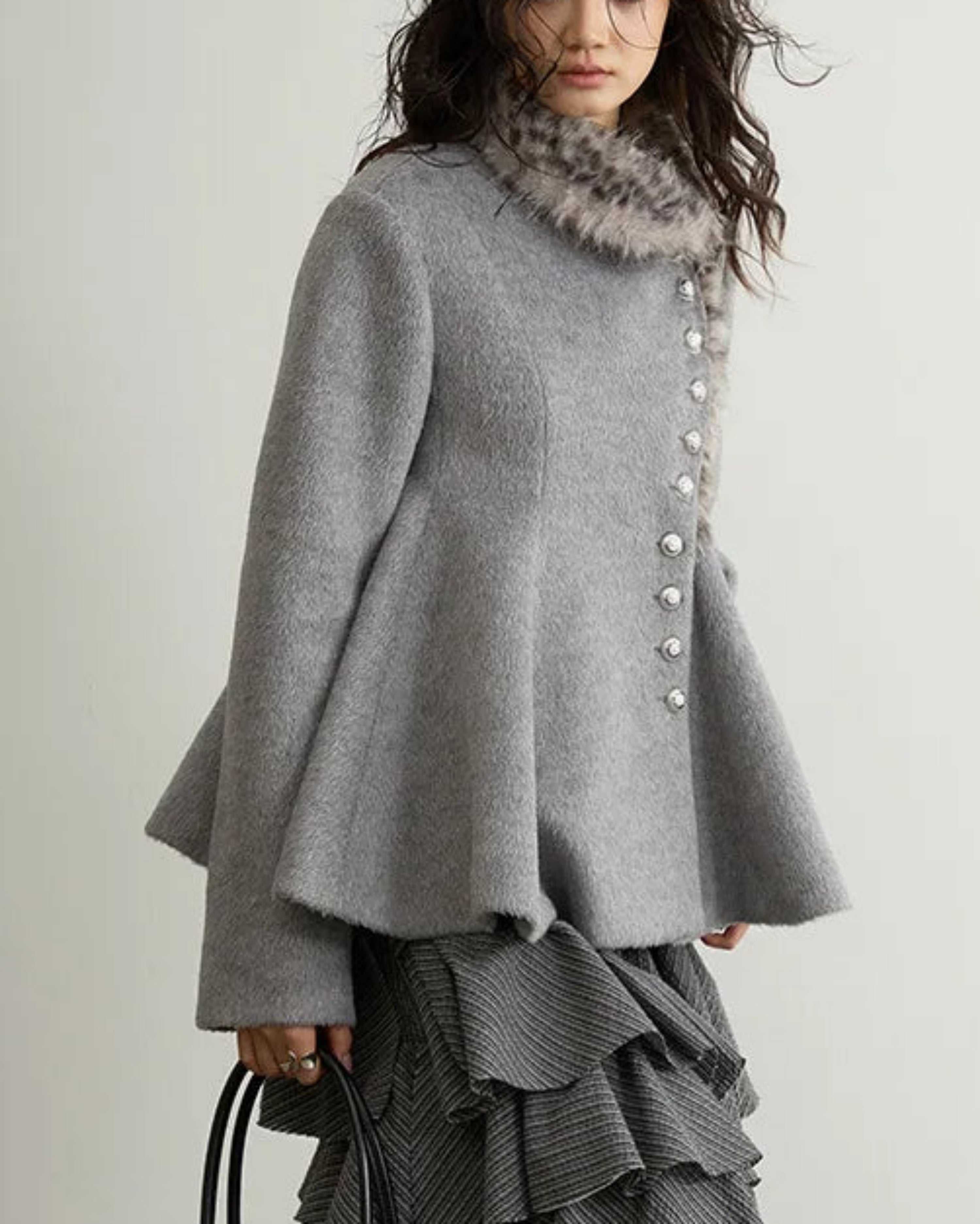 This luxurious grey woolen peplum jacket features an asymmetrical hem and avant-garde silhouette with a faux fur leopard-print collar and hem.
