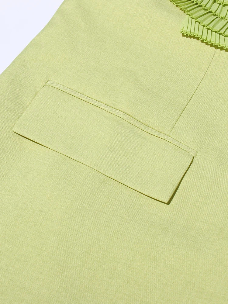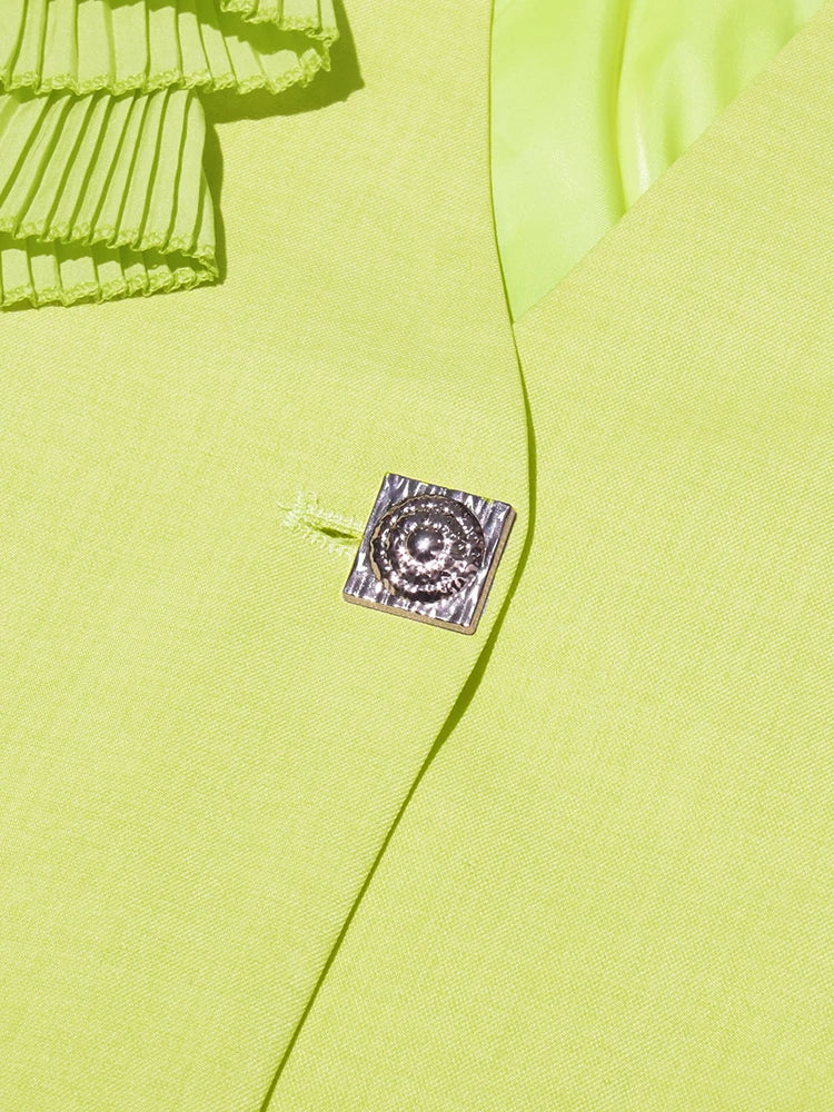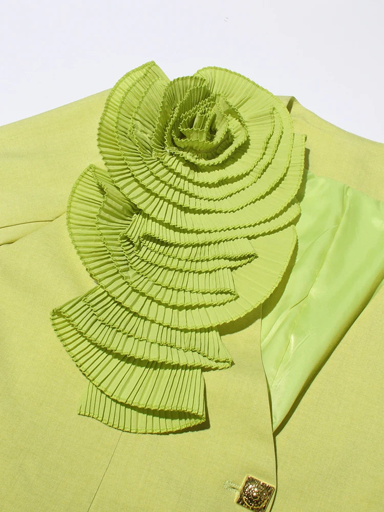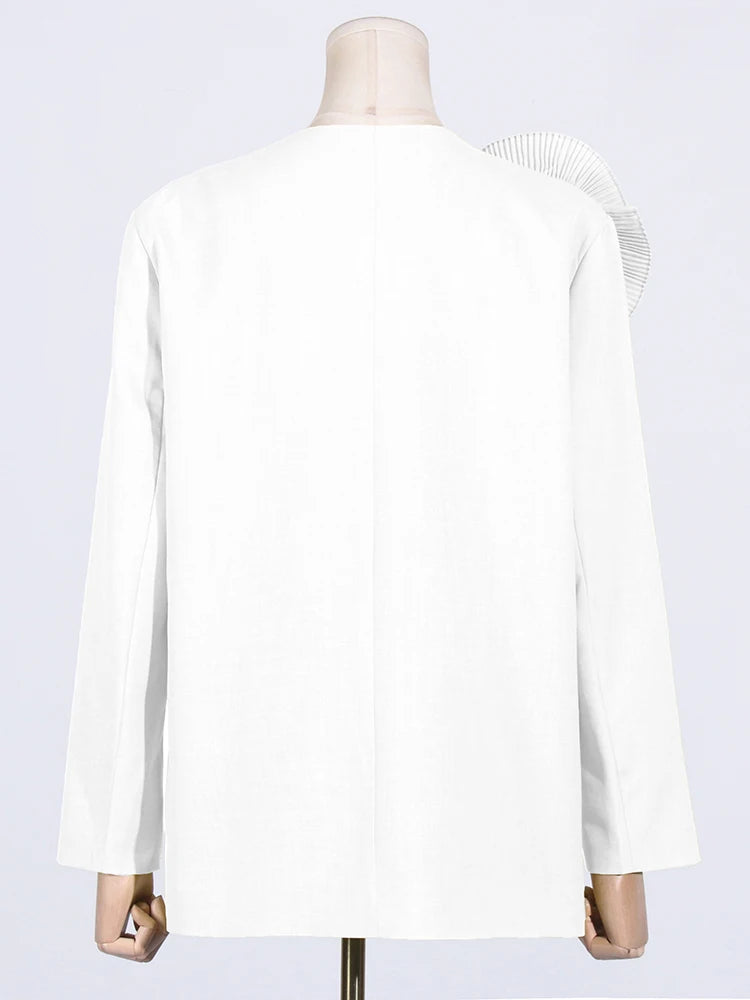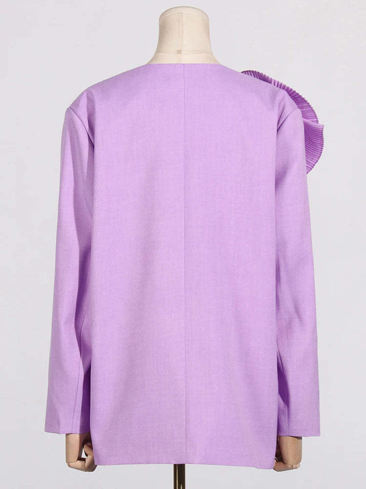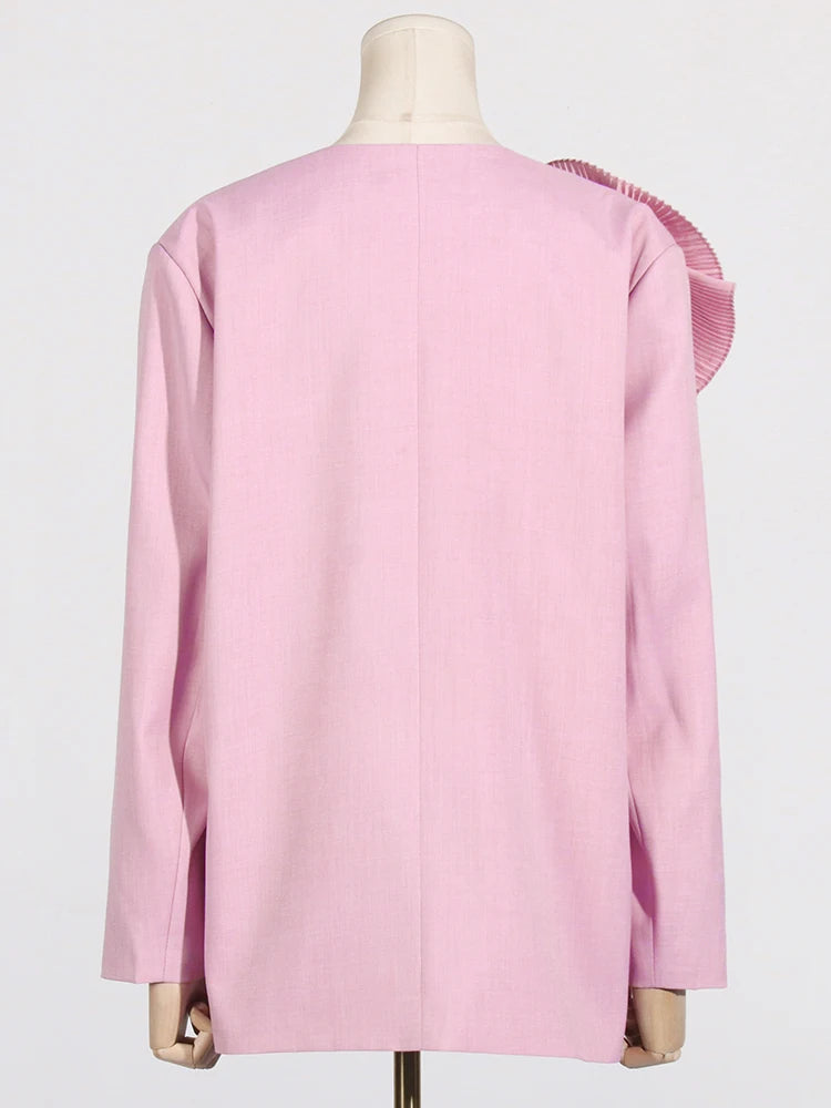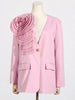 A relaxed-fit blazer with a dramatic pleated rosette shoulder, elegant couture styling, and unique design.