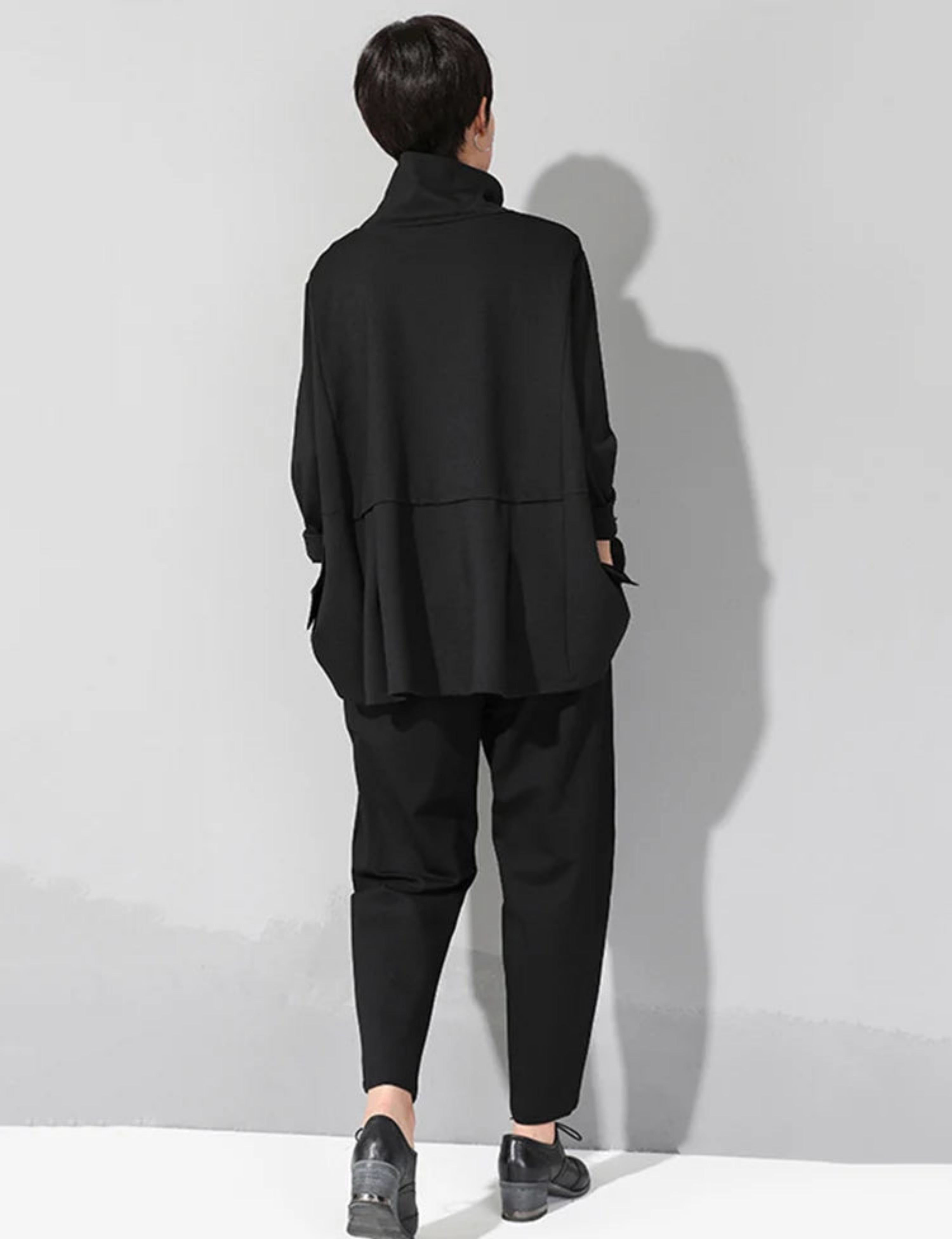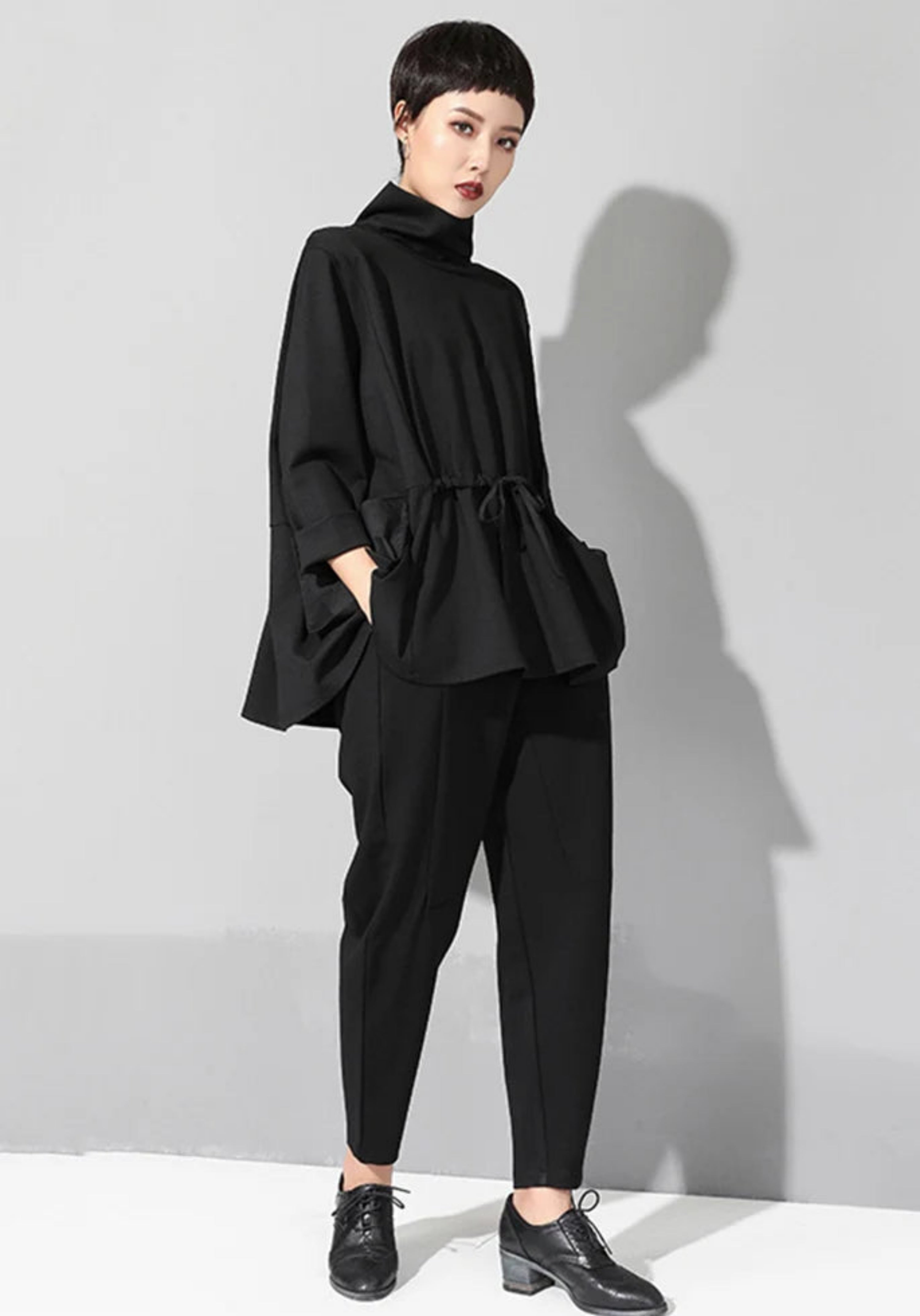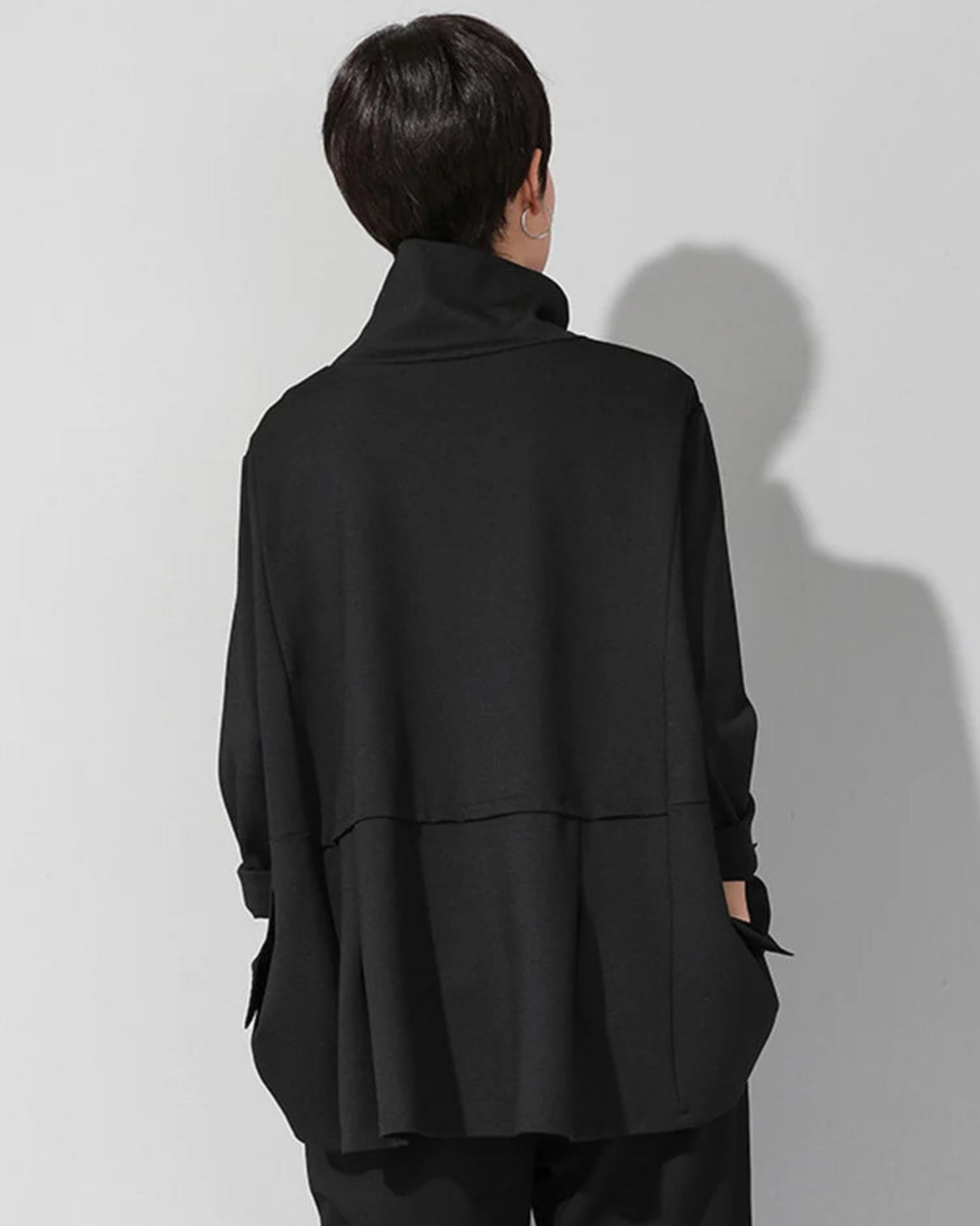 This top features a high turtleneck, an adjustable drawstring waist for a cinched or relaxed shape, and an asymmetrical hem that adds a modern, directional look.