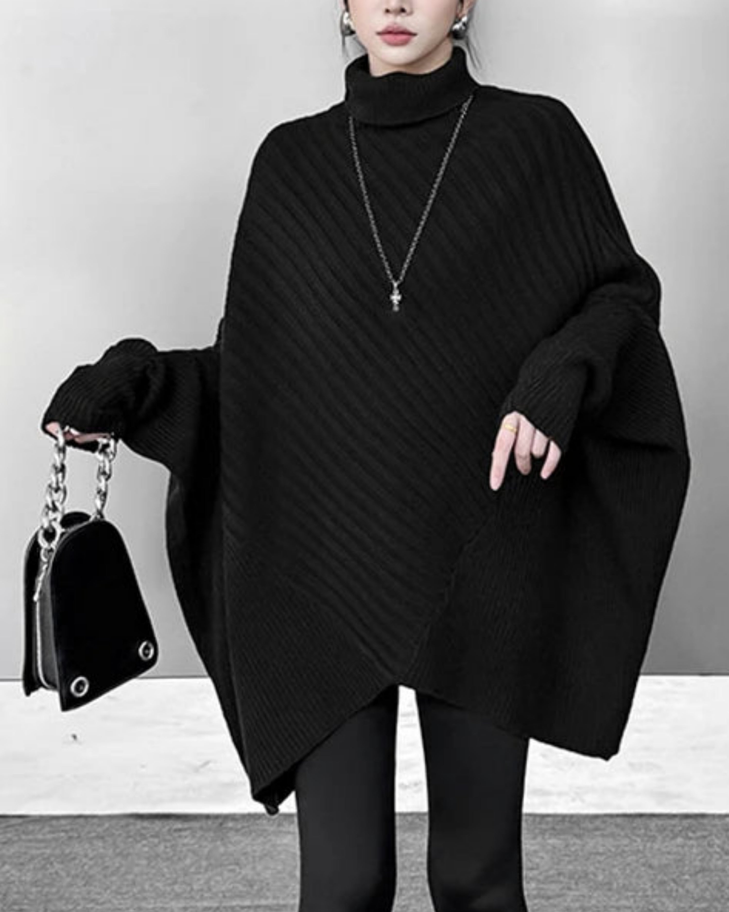 Made from soft ribbed knit, it includes a high turtleneck and voluminous sleeves, perfect for travel, workwear, weekend outings, and cool-weather layering.