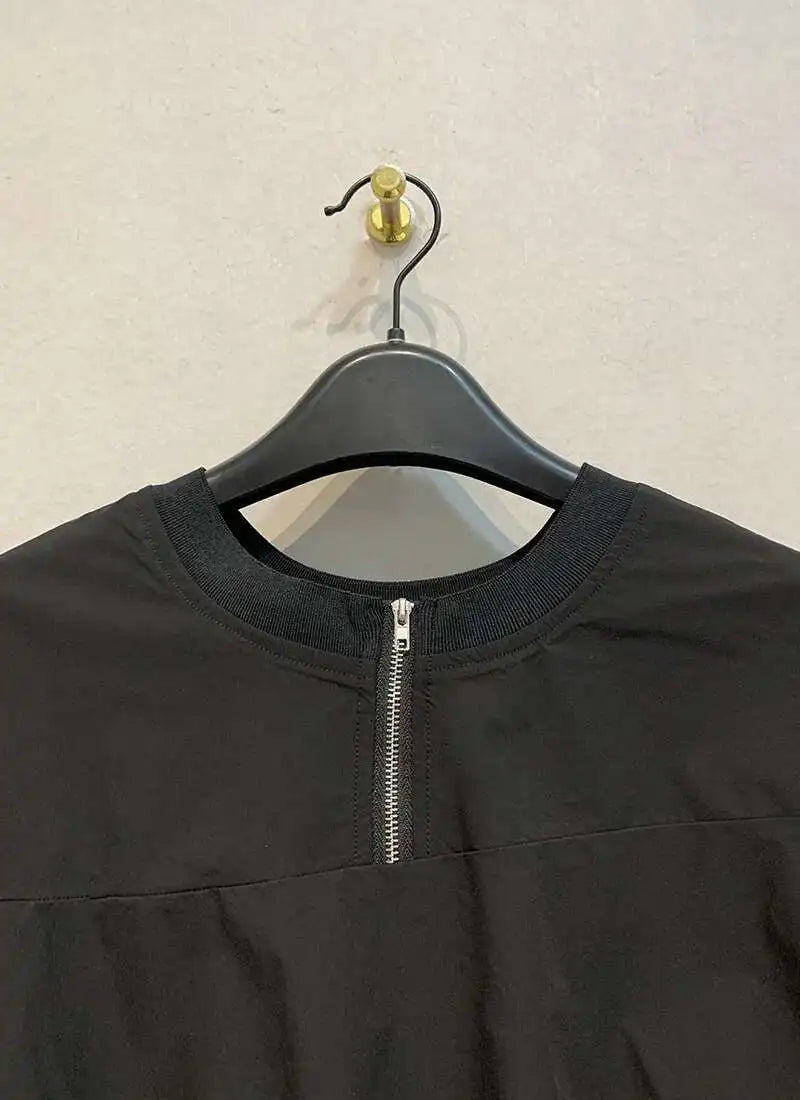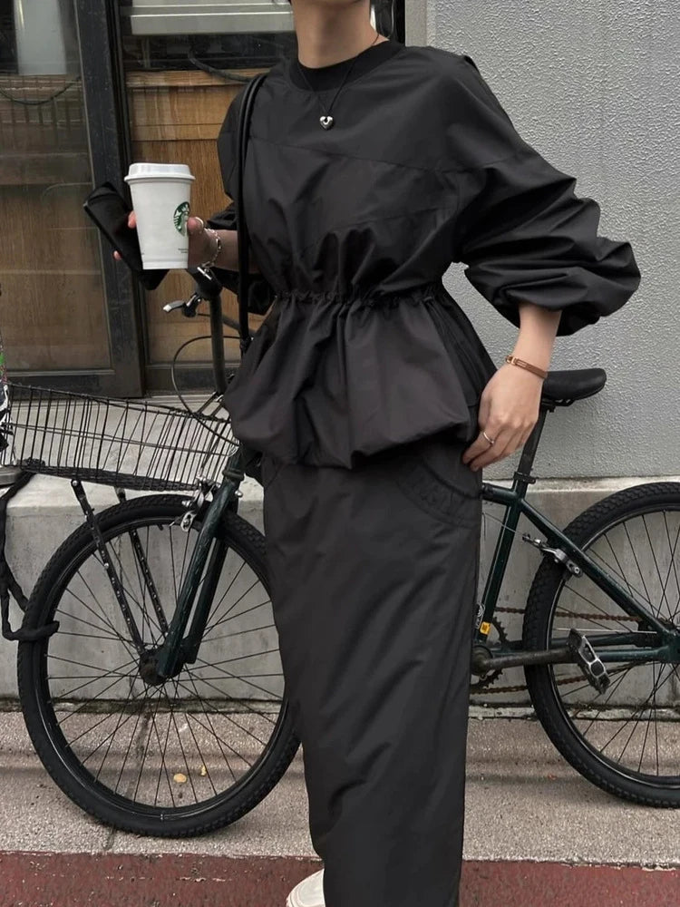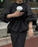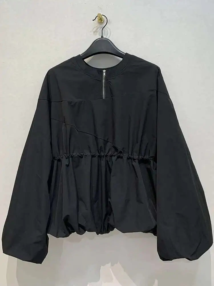 This black balloon sleeve blouse features a cinched waist and oversized yet tailored fit for a modern, elegant silhouette.