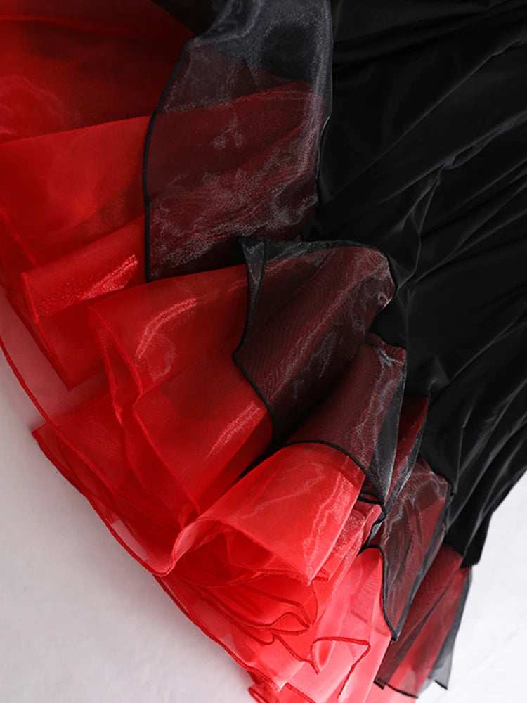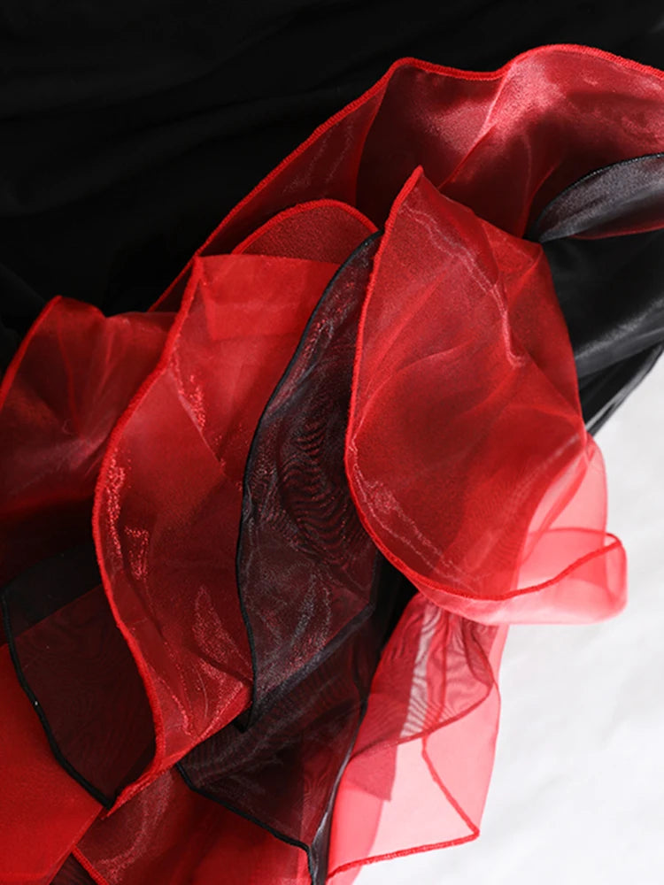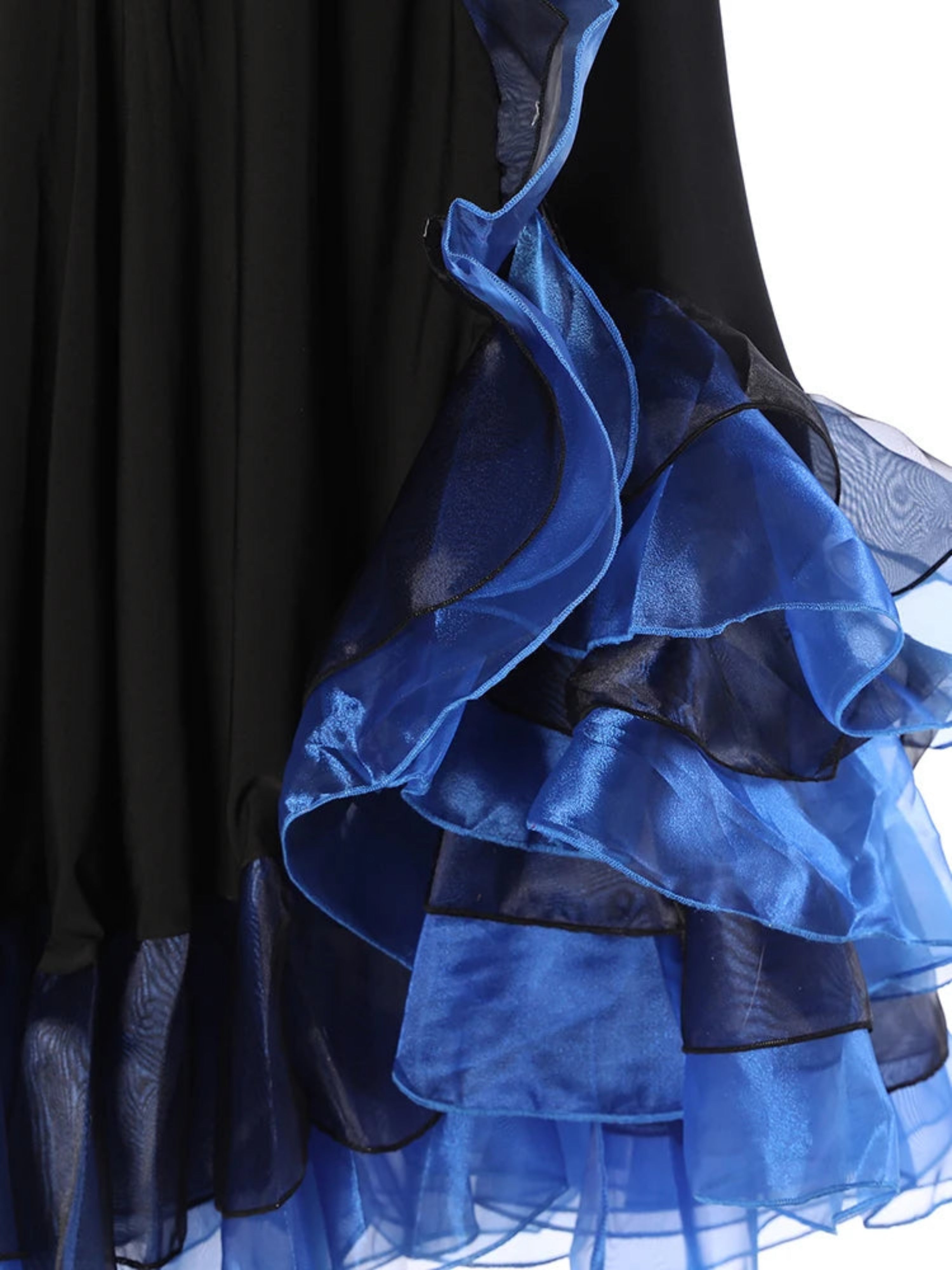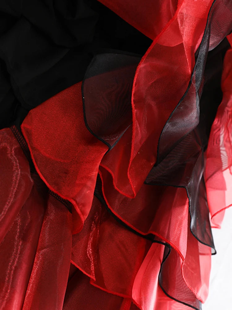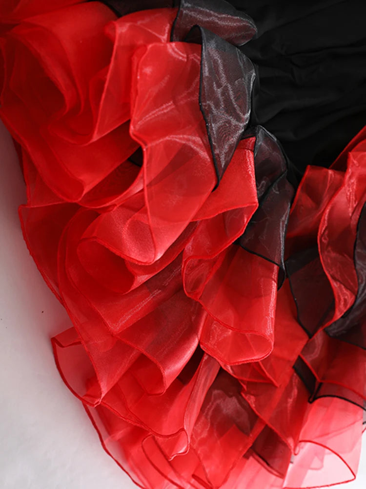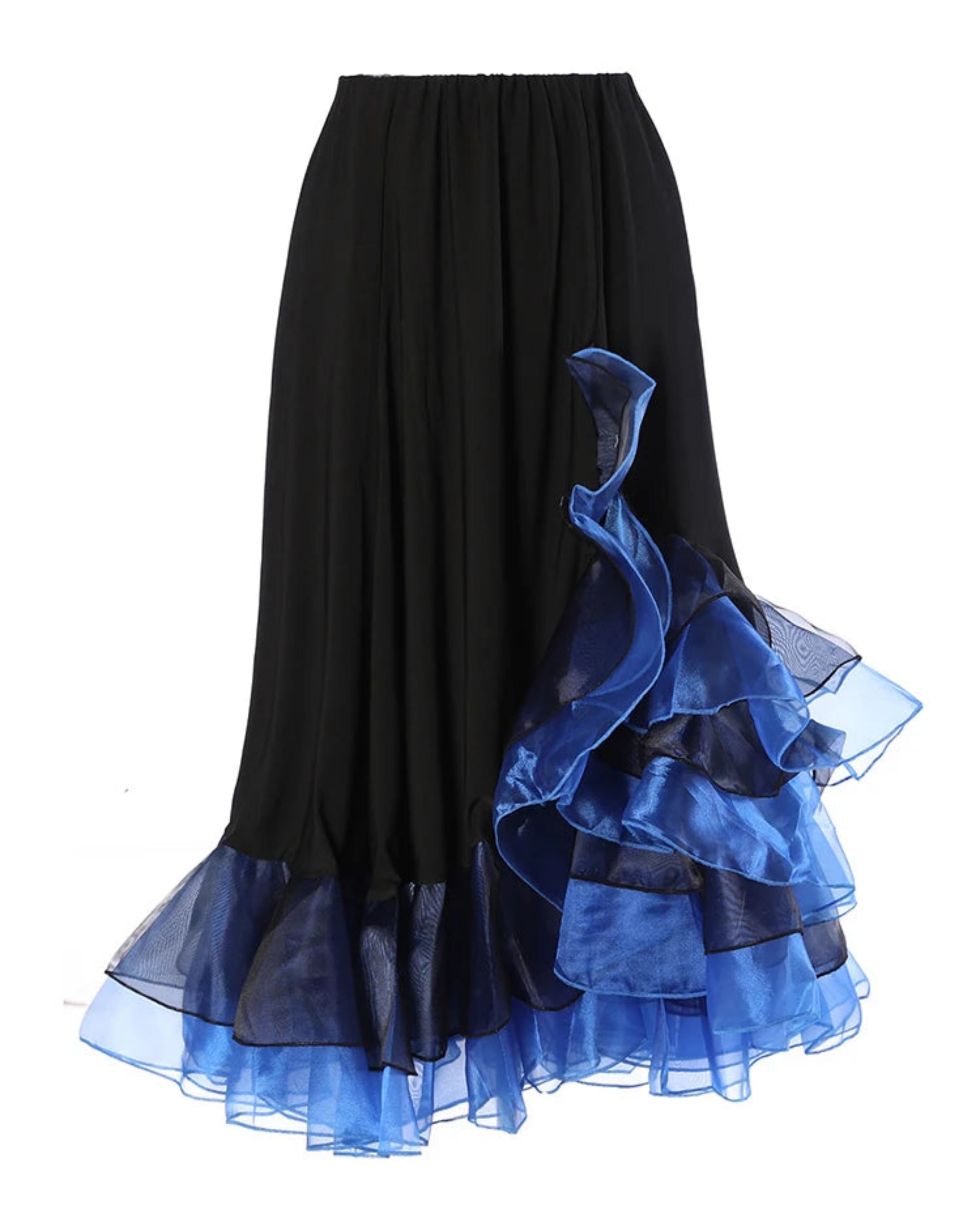 This luxury cascading mesh ruffle midi skirt features a smooth elastic stretchy waistband, a fitted upper panel, and layered mesh ruffles that create striking movement.