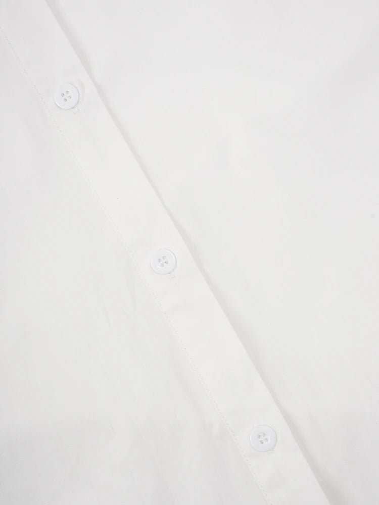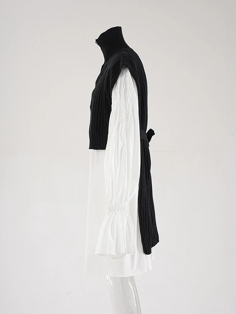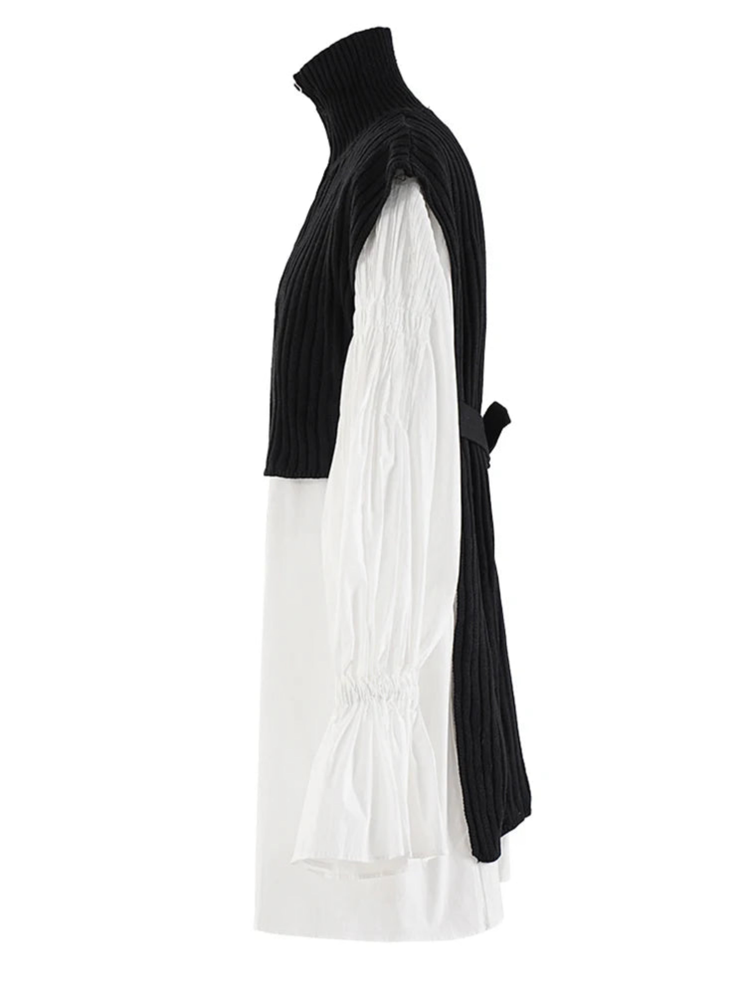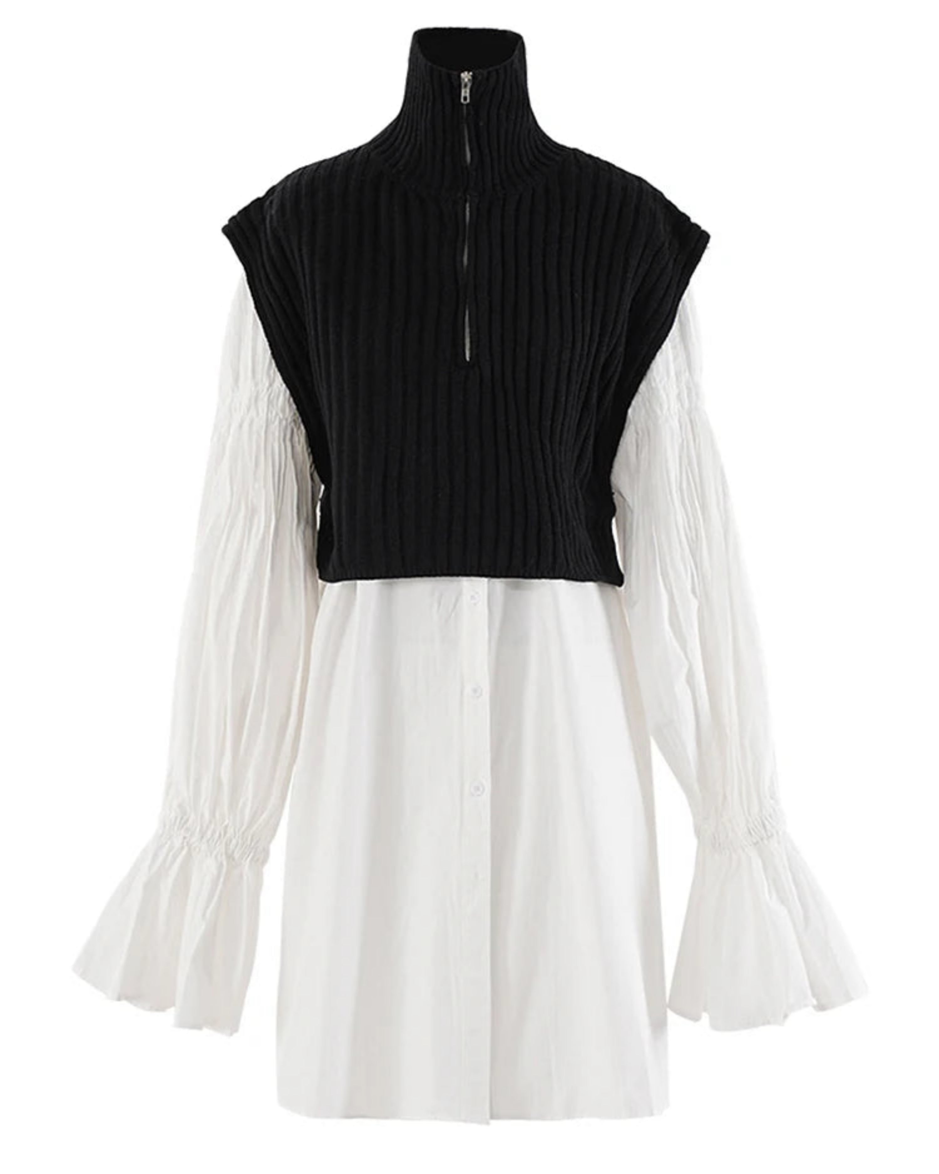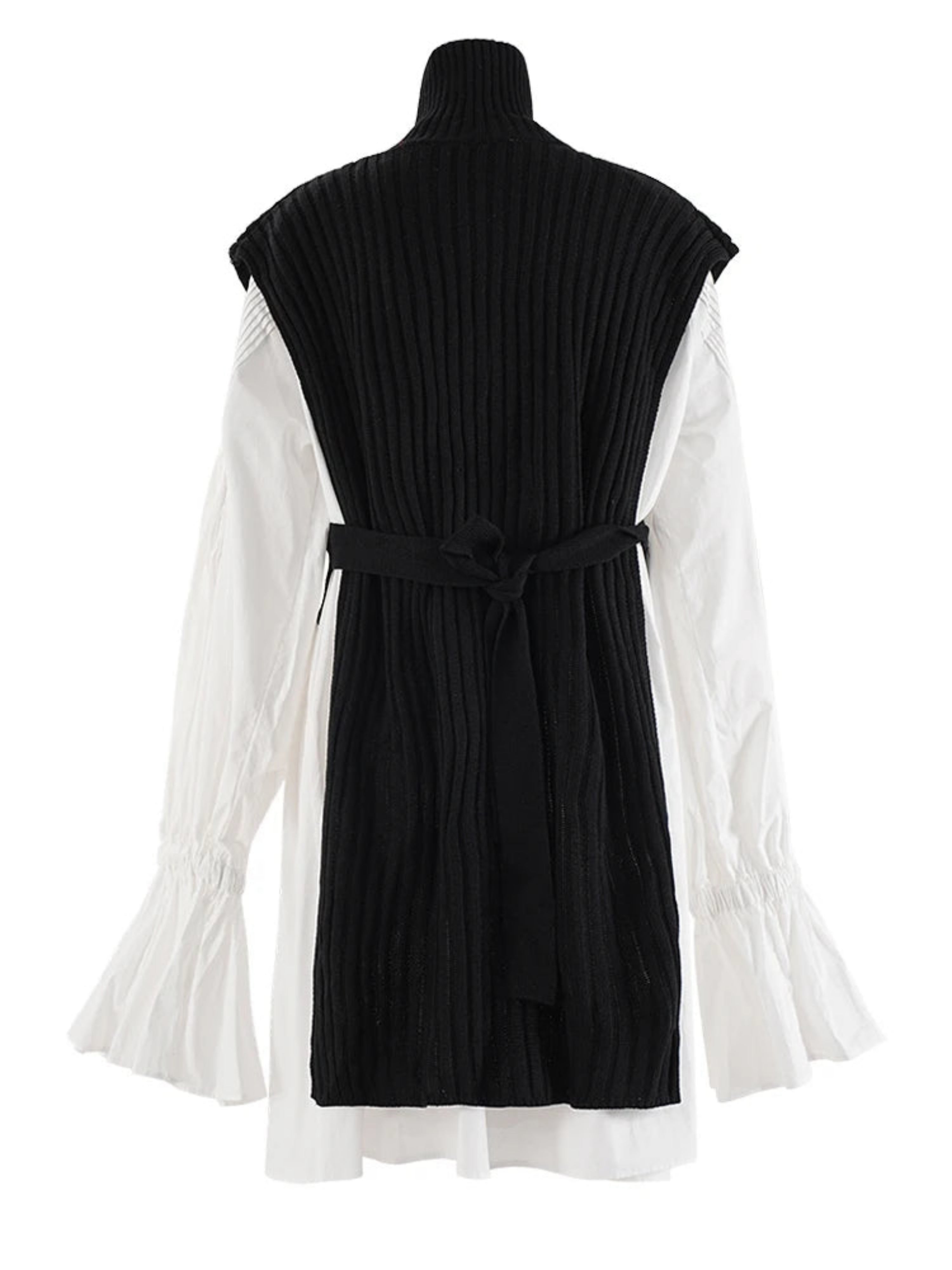 A cropped ribbed knit vest sits over a longline button-down shirt, finished with long bell sleeves for a sharp, styled look. The loose fit makes it easy to wear while still looking put-together from morning to evening.