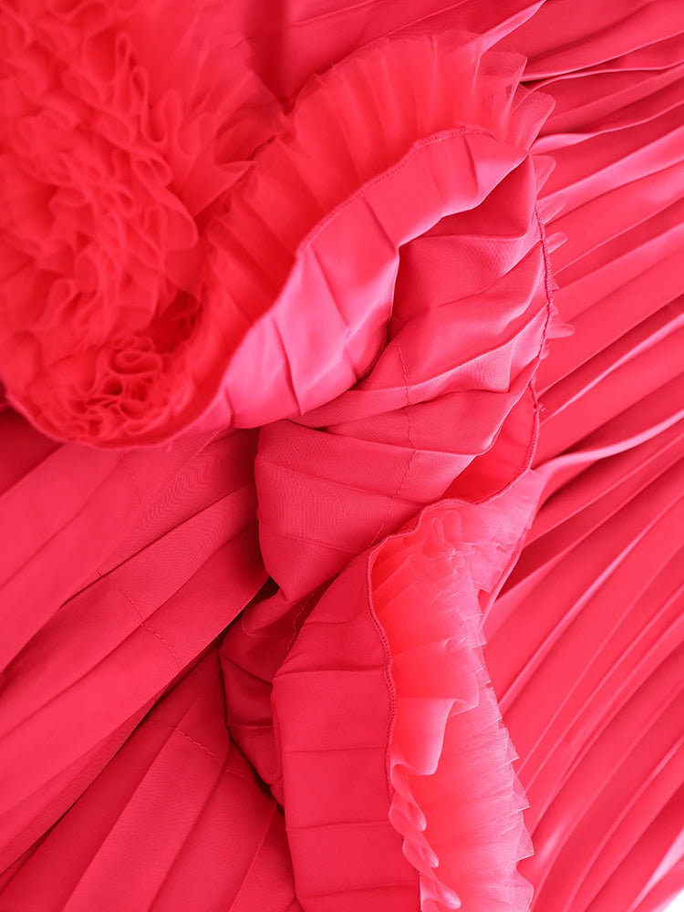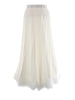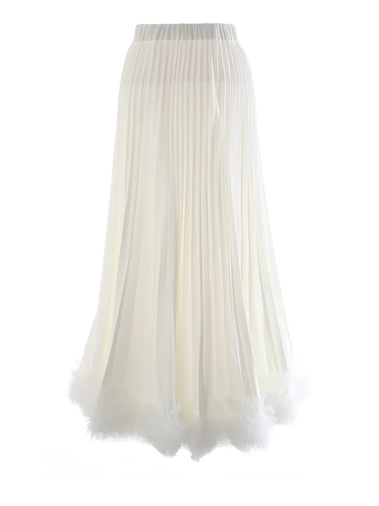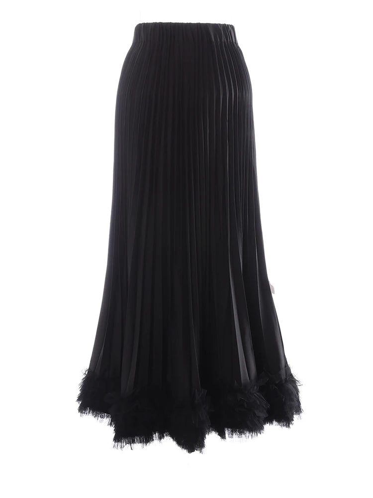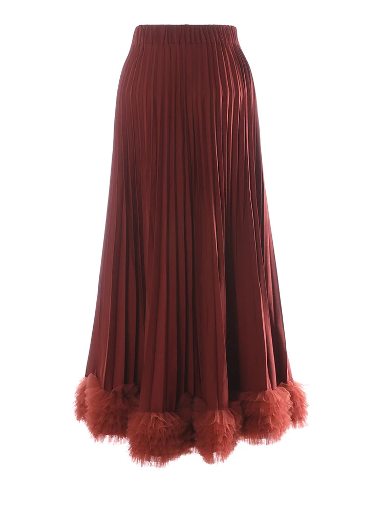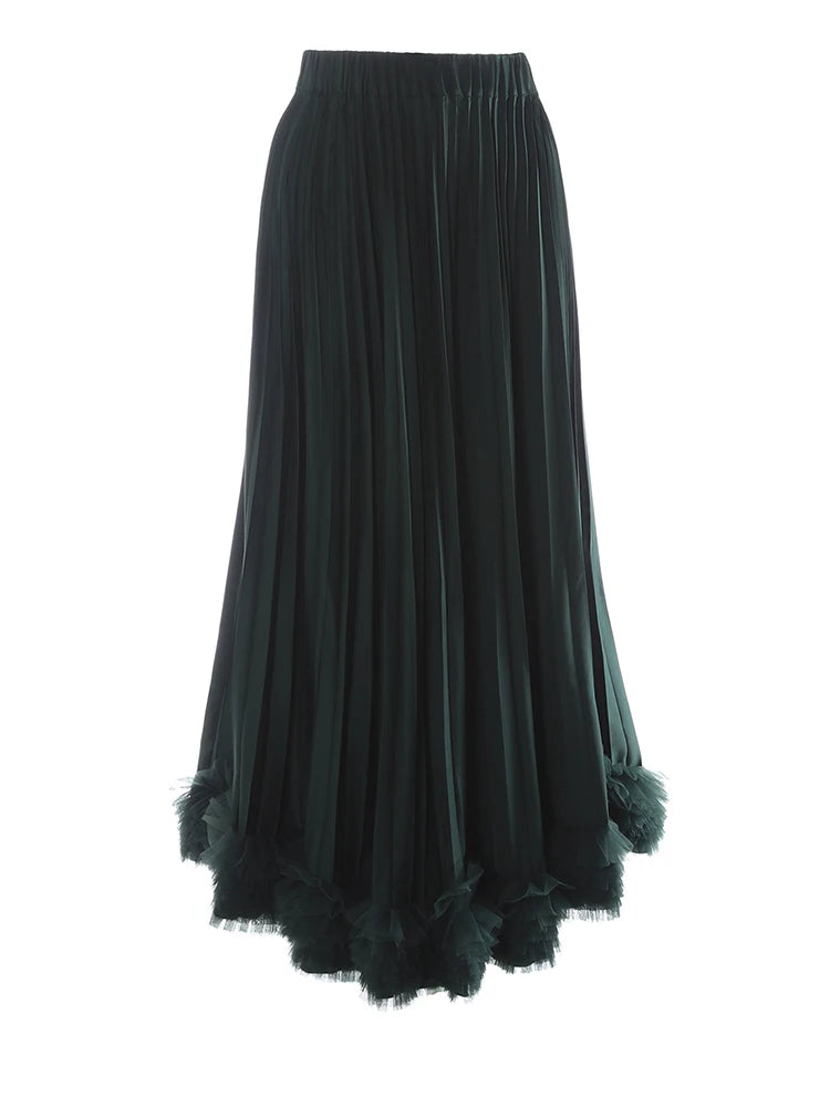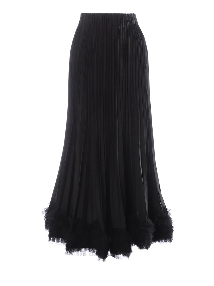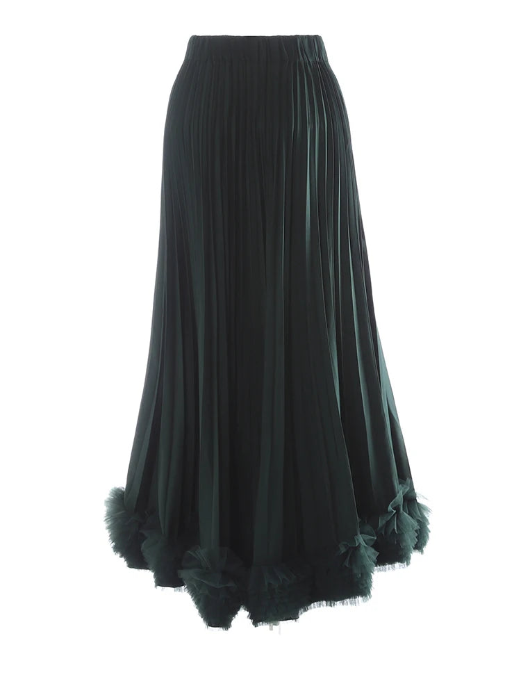 This pleated maxi skirt features a feminine silhouette with a luxurious mesh ruffle along the bottom hem.